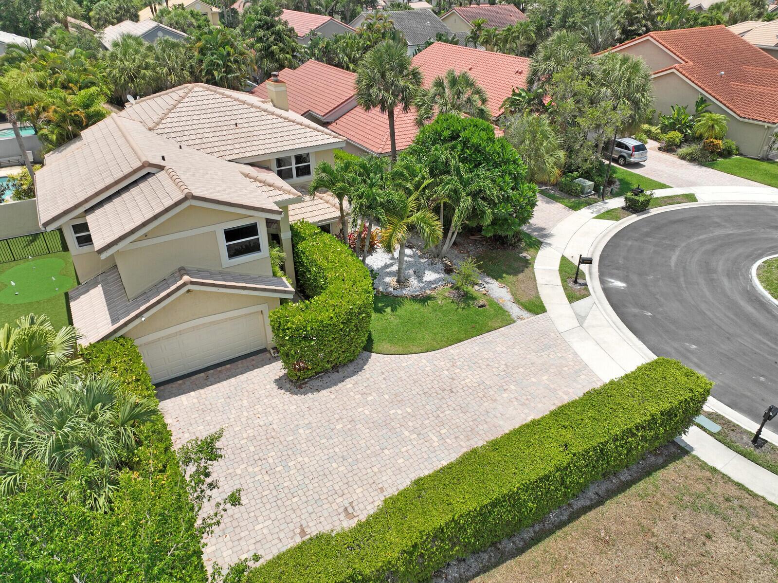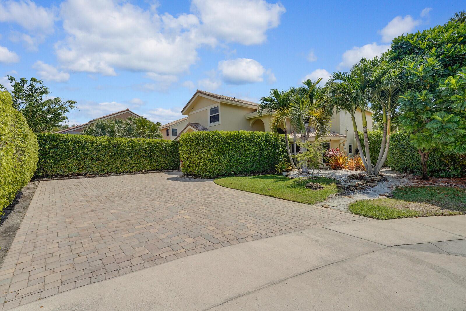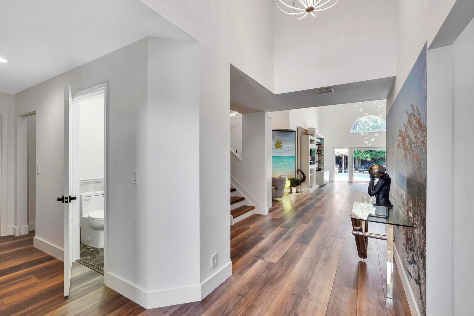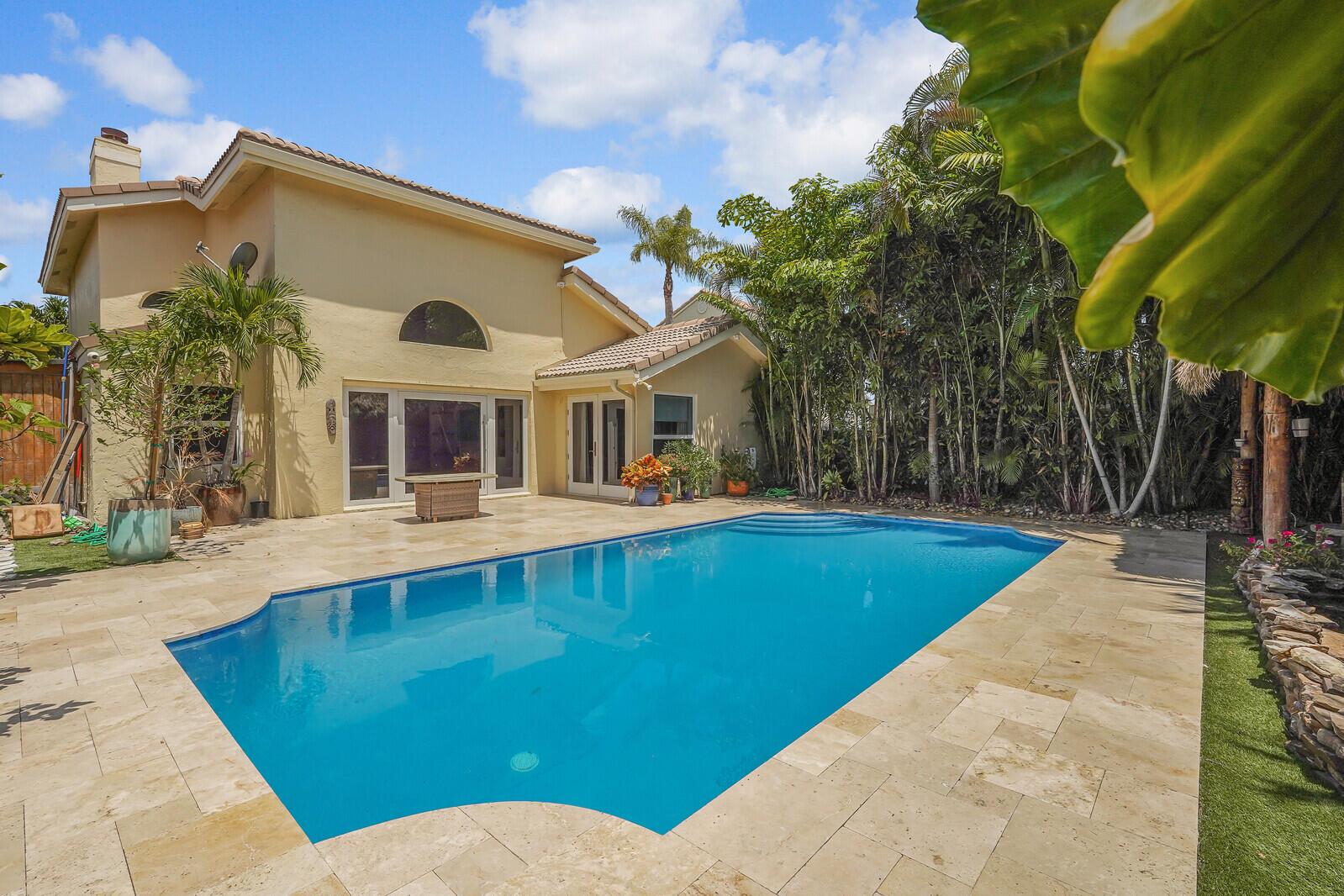 WATCH THE NARRATED VIDEO! Welcome home to the ideal blend of comfort and elegance! Nestled in a tranquil, private cul-de-sac in desirable West Boca Raton, this stunning 4-bedroom, 2.5-bathroom house offers 2573 square feet of beautifully renovated living space, designed to cater to refined tastes and practical needs. Step inside to be greeted by soaring 20-ft ceilings, an inviting dining room complete with a charming brick fireplace, a separate bar/lounge, and spacious living room. Primary suite is conveniently located on the main floor. The interior showcases custom lighting and unique artwork, setting a striking backdrop for everyday living. Luxuriate in the chef's kitchen, equipped with marble countertops, and explore the spacious bonus room perfect for a home office, wine room, study