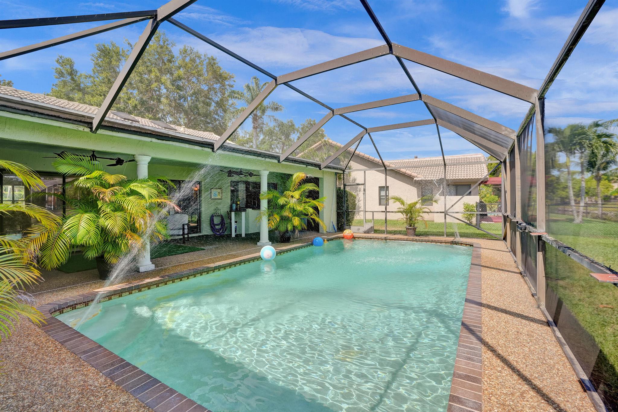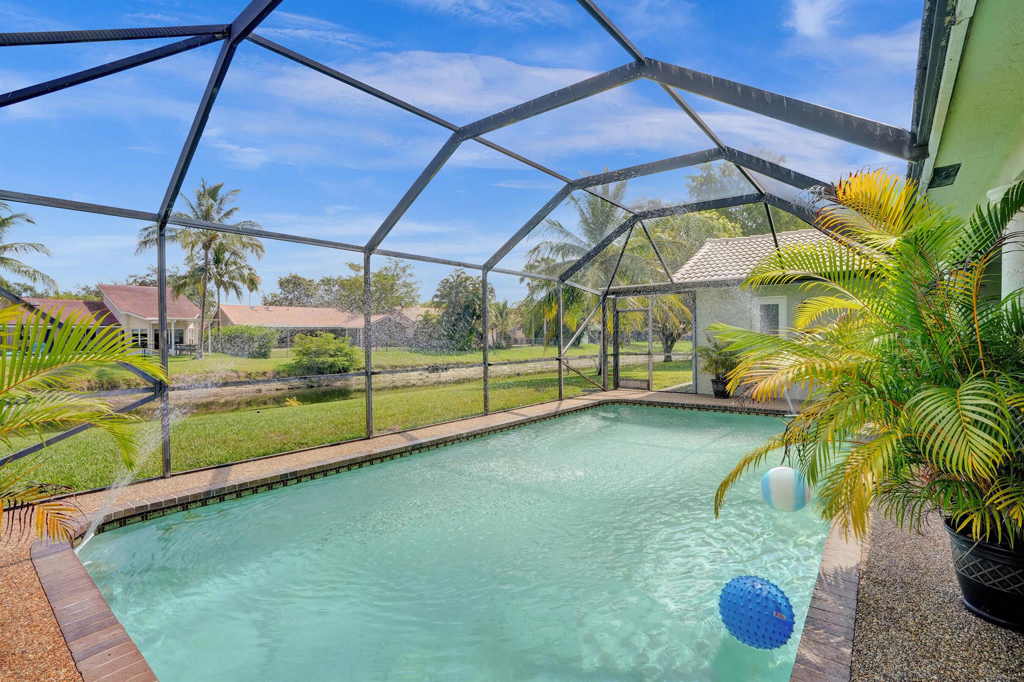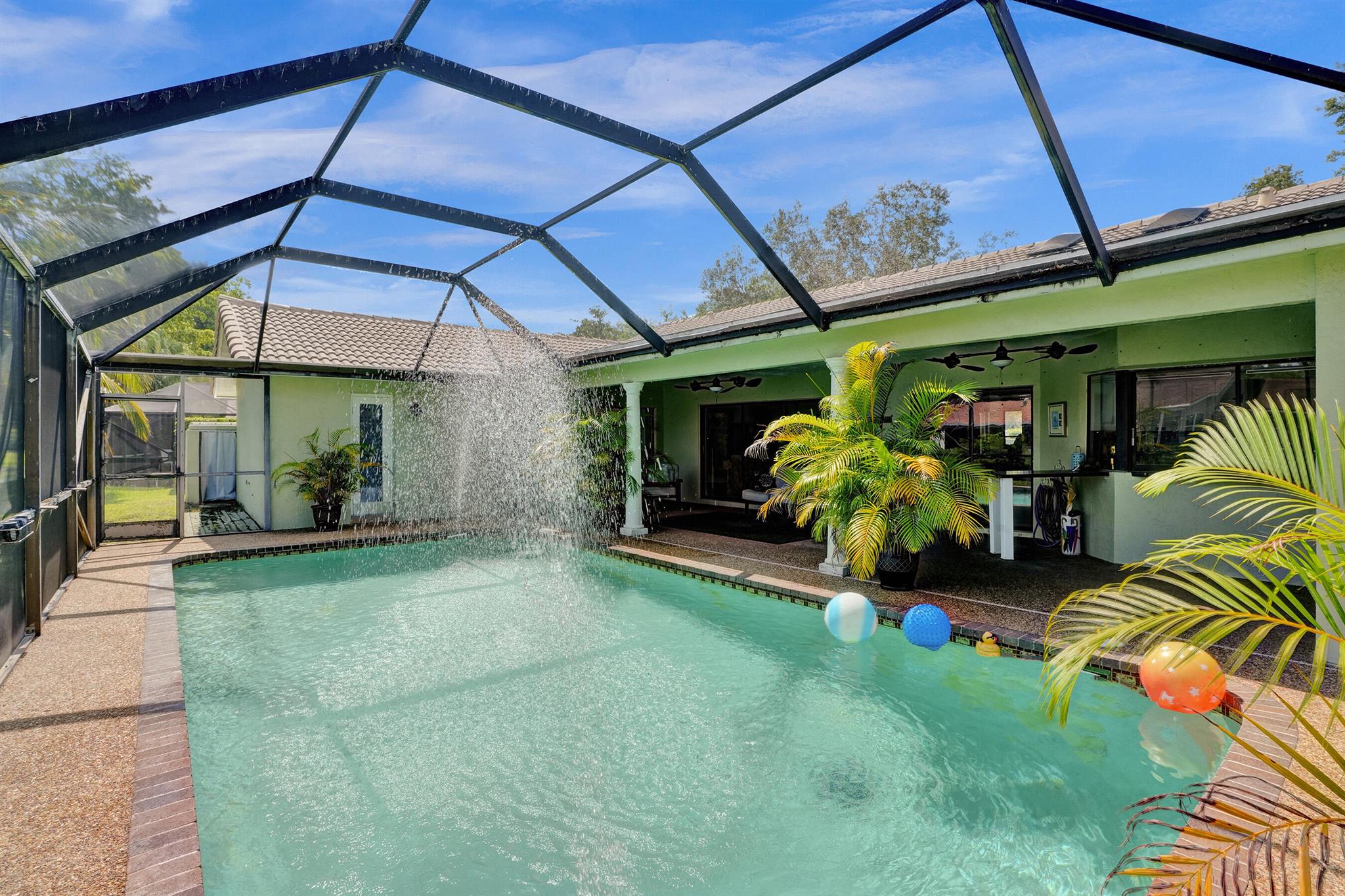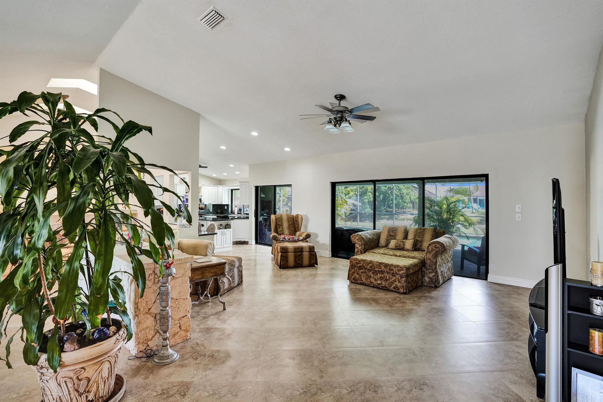 Impeccably maintained 4-bed, 2.5-bath pool home in the sought-after Pine Ridge neighborhood. This home boasts a bright, open-concept floor plan with vaulted ceilings and 24'' porcelain tile throughout. The updated kitchen features an island, granite counters, and stainless steel appliances, offering ample storage and a perfect view of the pool and expansive screened lanai, overlooking a tropical water-view backyard. Additional highlights include hurricane shutters, remodeled bathrooms with dual sinks, walk-in closets, a laundry room, and an oversized expanded driveway. With a 2006 barrel roof, 7-year-old A/C, new water heater and a recent 4-point inspection, this home is move-in ready. Schedule a tour today--this one won't last!