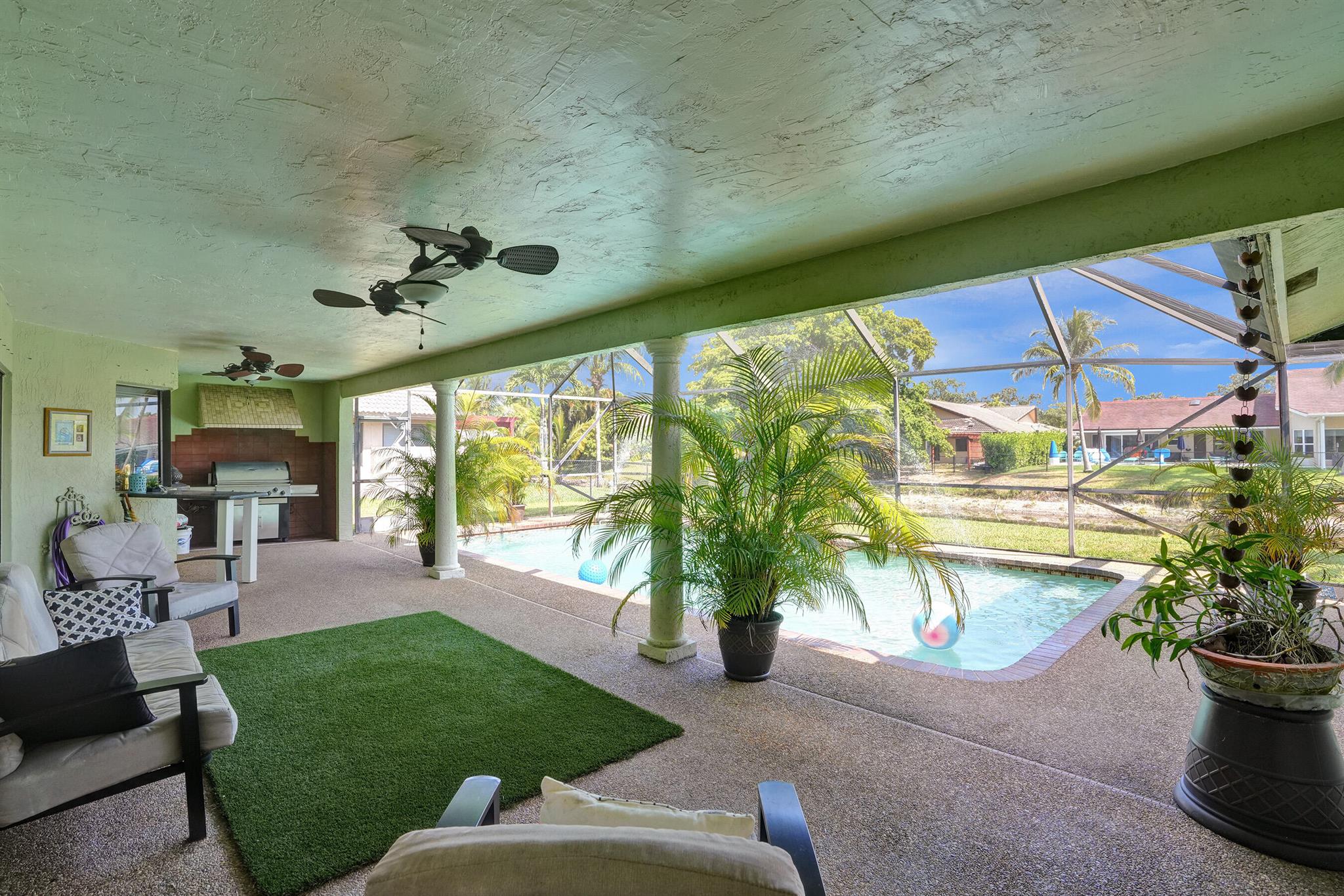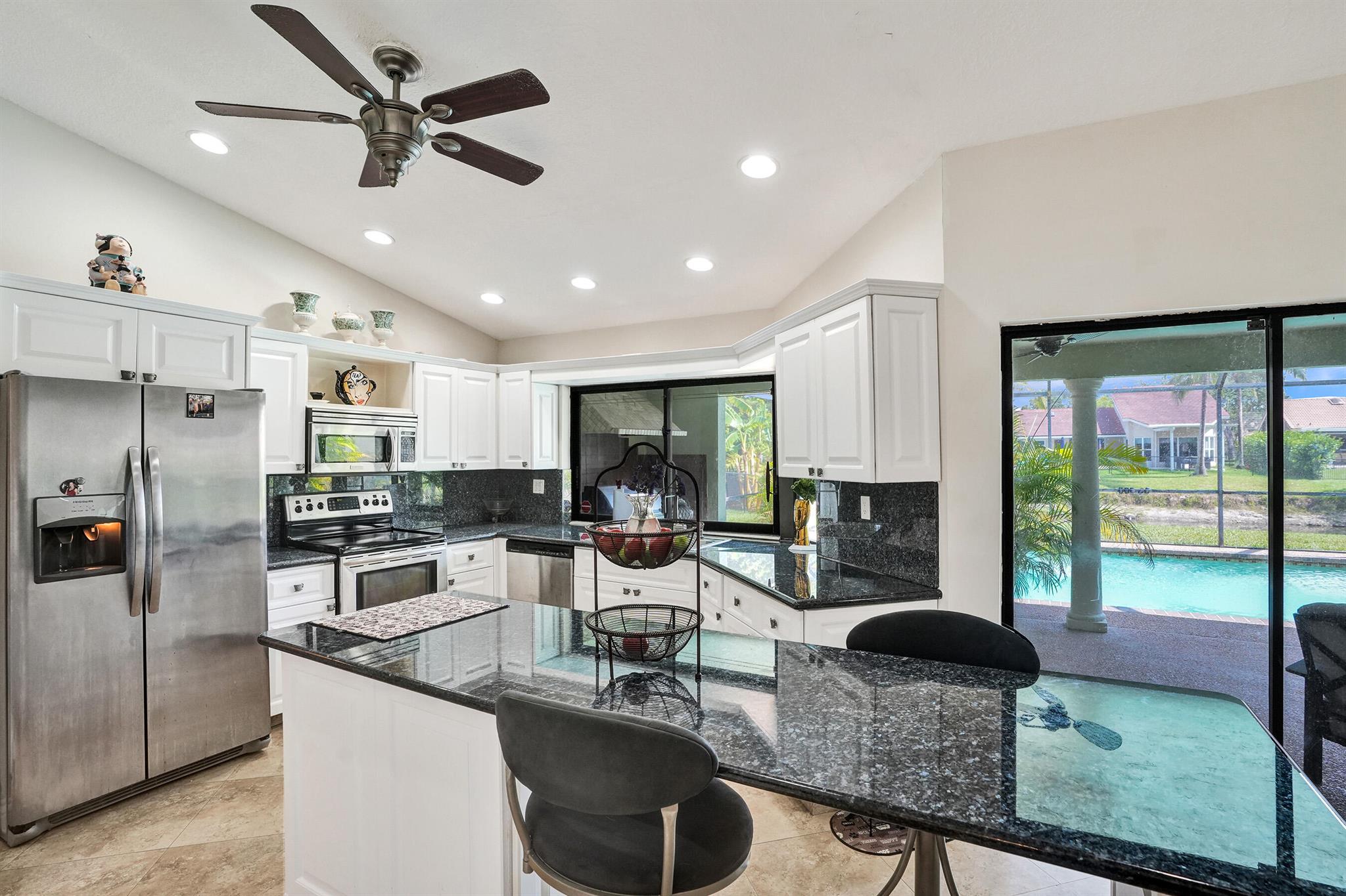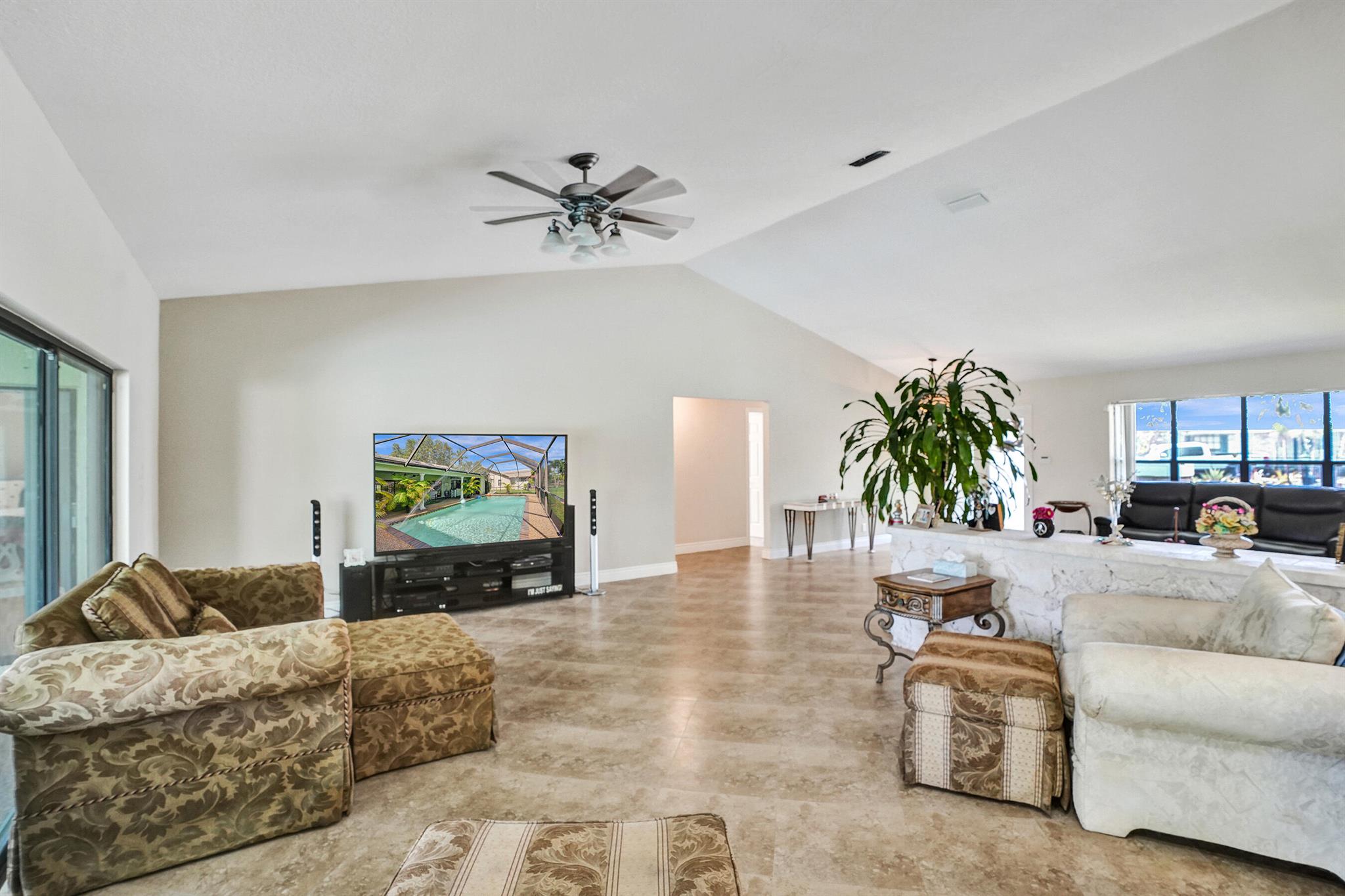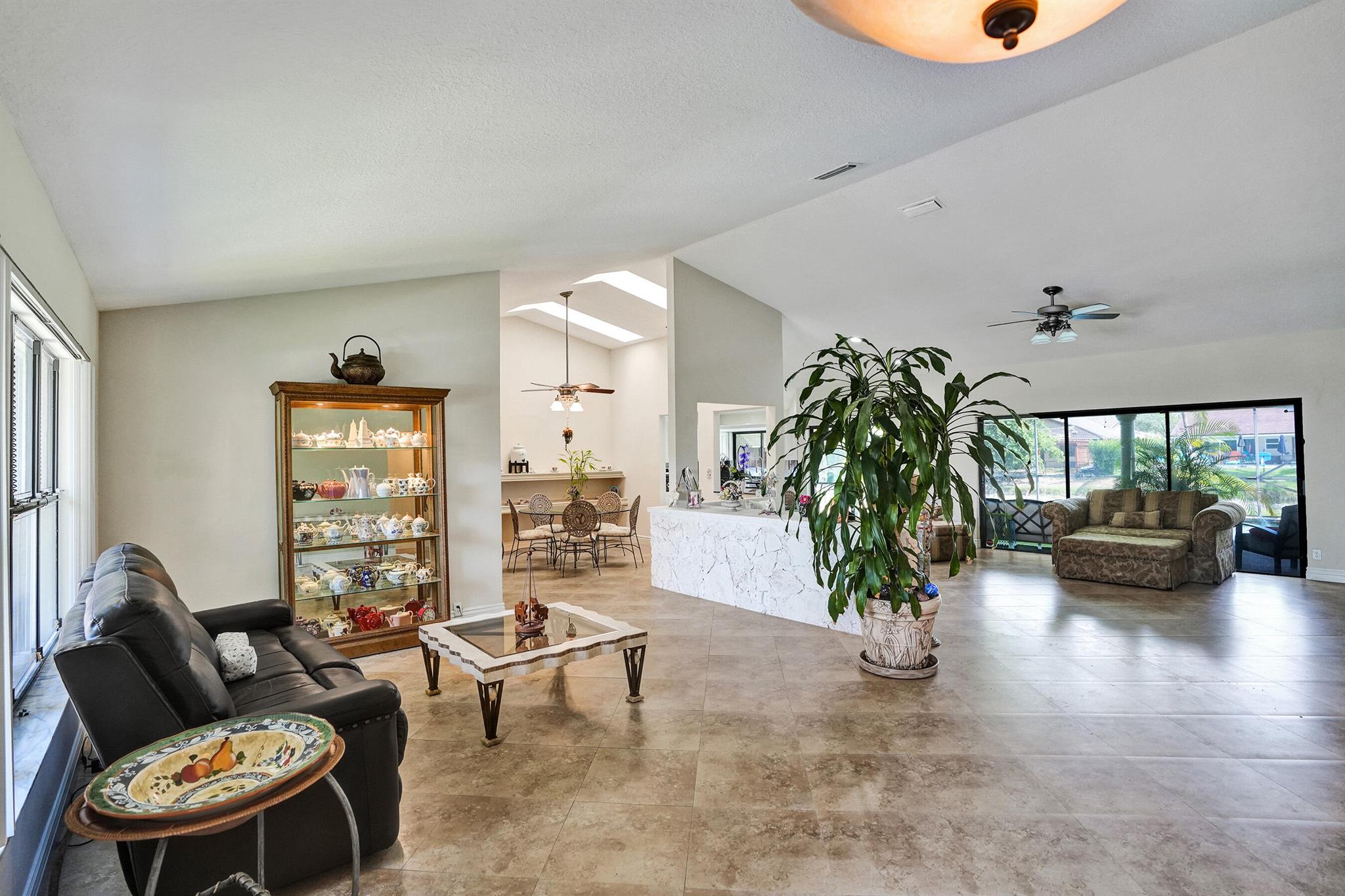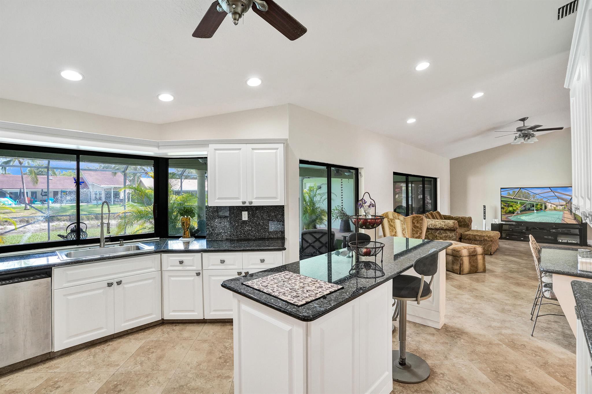 Impeccably maintained 4-bed, 2.5-bath pool home in the sought-after Pine Ridge neighborhood. This home boasts a bright, open-concept floor plan with vaulted ceilings and 24'' porcelain tile throughout. The updated kitchen features an island, granite counters, and stainless steel appliances, offering ample storage and a perfect view of the pool and expansive screened lanai, overlooking a tropical water-view backyard. Additional highlights include hurricane shutters, remodeled bathrooms with dual sinks, walk-in closets, a laundry room, and an oversized expanded driveway. With a 2006 barrel roof, 7-year-old A/C, new water heater and a recent 4-point inspection, this home is move-in ready. Schedule a tour today--this one won't last!
