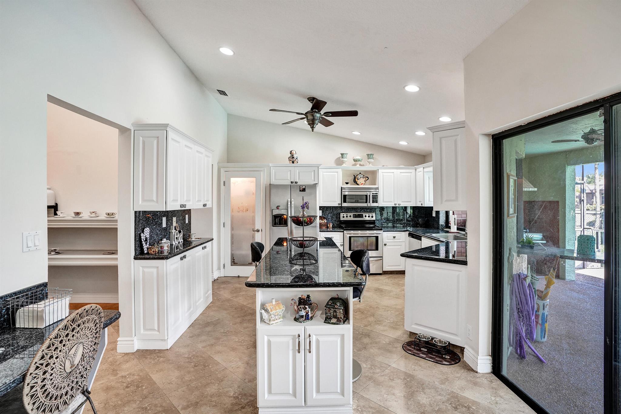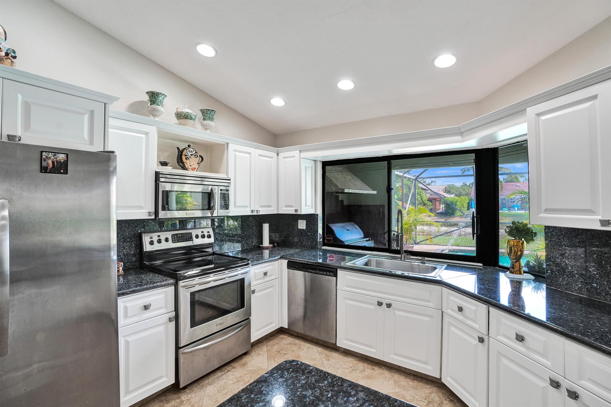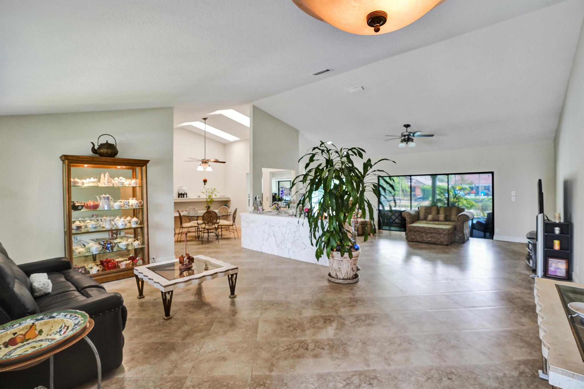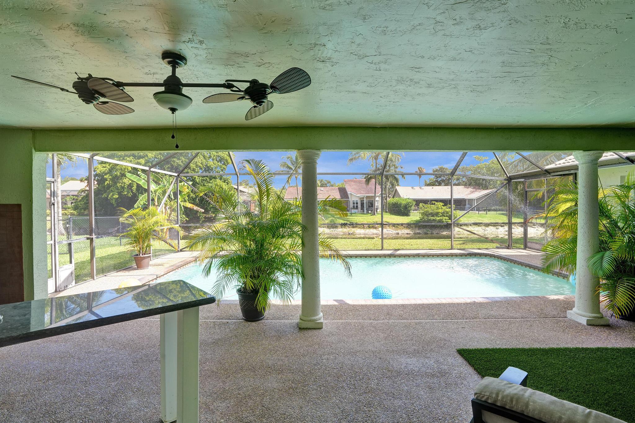 Impeccably maintained 4-bed, 2.5-bath pool home in the sought-after Pine Ridge neighborhood. This home boasts a bright, open-concept floor plan with vaulted ceilings and 24'' porcelain tile throughout. The updated kitchen features an island, granite counters, and stainless steel appliances, offering ample storage and a perfect view of the pool and expansive screened lanai, overlooking a tropical water-view backyard. Additional highlights include hurricane shutters, remodeled bathrooms with dual sinks, walk-in closets, a laundry room, and an oversized expanded driveway. With a 2006 barrel roof, 7-year-old A/C, new water heater and a recent 4-point inspection, this home is move-in ready. Schedule a tour today--this one won't last!