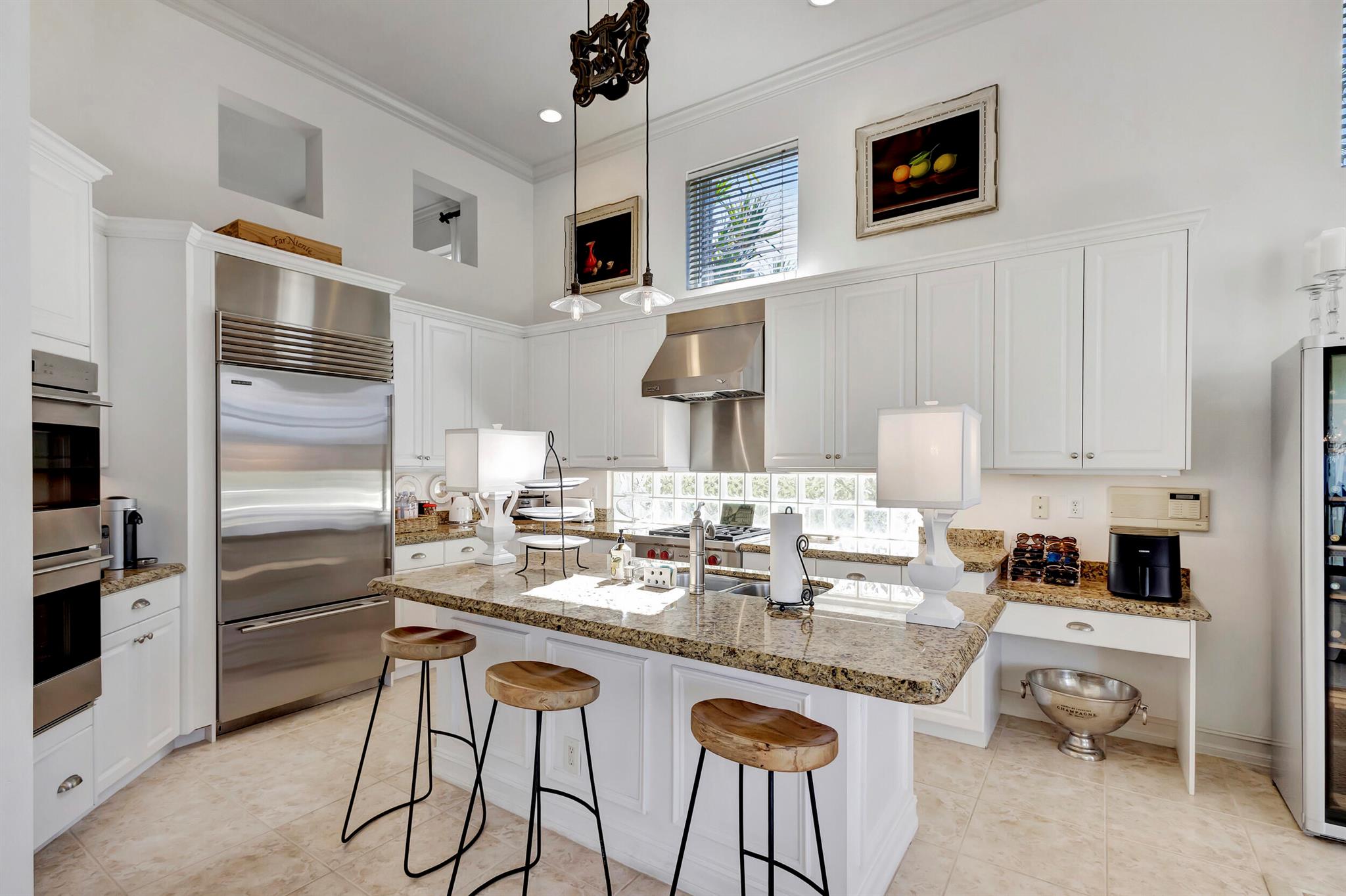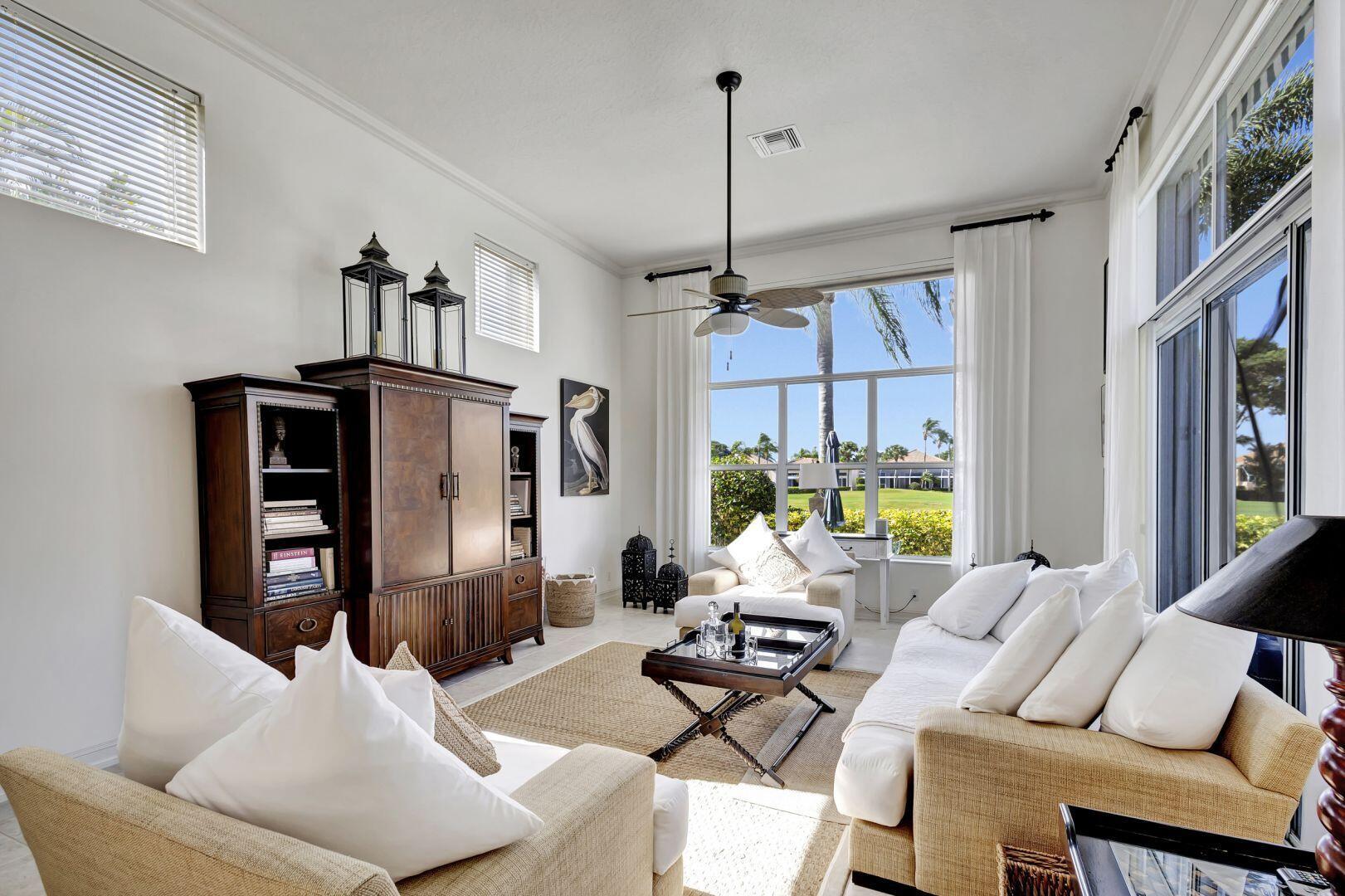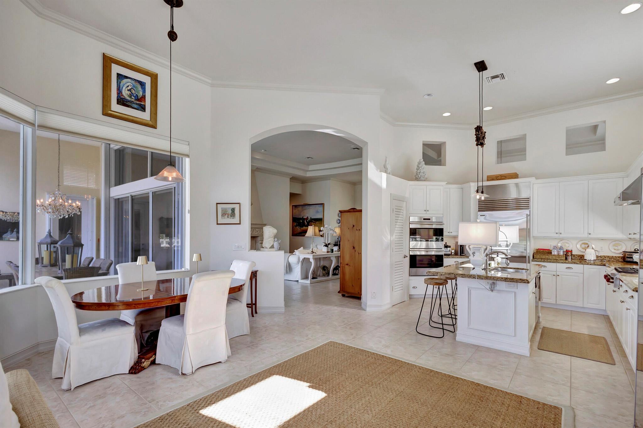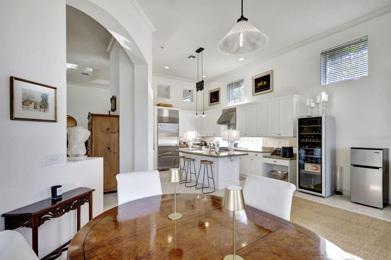 Welcome to this exquisite 4 bedroom, 4 bath + den home nestled in a serene cul-de-sac located in Ibis Isle. This rare gem offers a perfect blend of elegance, functionality, and tranquility, making it an idyllic retreat for discerning homeowners. As you step in the foyer, you're greeted with an abundance of natural light streaming through large windows and reflecting throughout the 14' high ceilings, casting a warm glow throughout the home. Renovations have been made in every room and the kitchen is host to Wolf under-over oven, Wolf gas top grill, Sub-zero refrigerator-freezer, Bosch dishwasher, white cabinets with granite tops and
