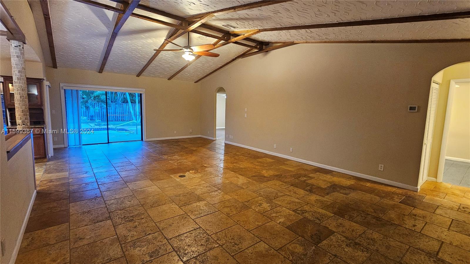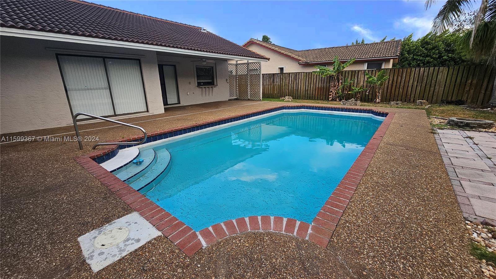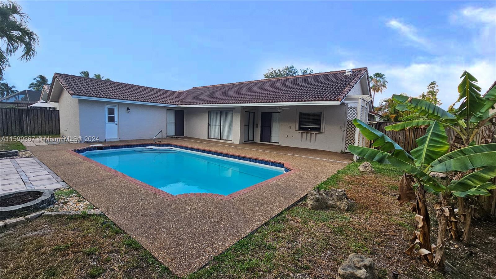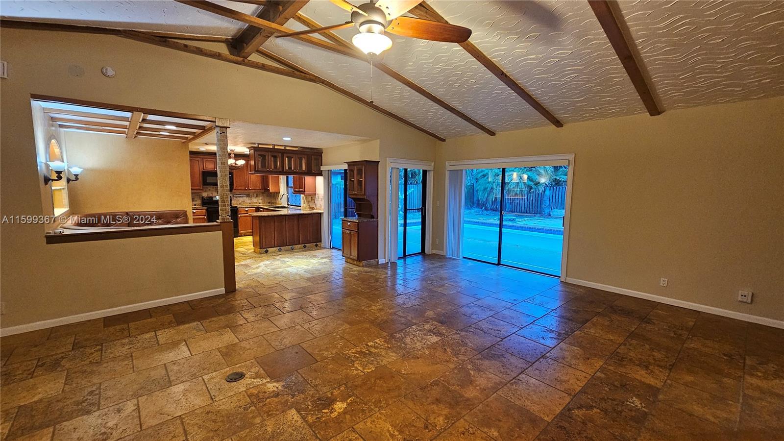 Magnificent 4 bedroom and 2 bathroom Coral Springs pool home! Open and updated country style kitchen features custom wood cabinets, granite counters and newer appliances. Custom made breakfast seating area. Over sized kitchen pantry and laundry room. Large family room and dining area contain high vaulted ceilings with decorative faux wood beam moldings. Gorgeous slate stone tile floors add to the home's unique country feel. Master bedroom suite with 2 separate walk-in closets and sliding glass doors which lead out onto the home's pool deck. Covered terrace over sees the home's inviting swimming pool. Situated on a wonderful spacious lot that has space left over for fruit trees or a kids play area. Centrally located inside an awesome tree lined quite neighborhood.