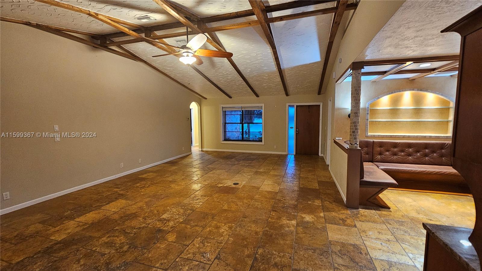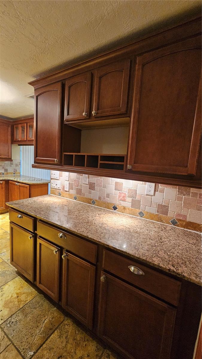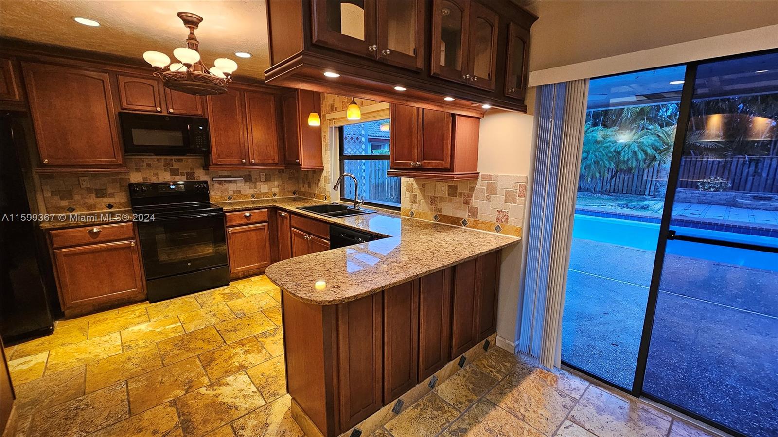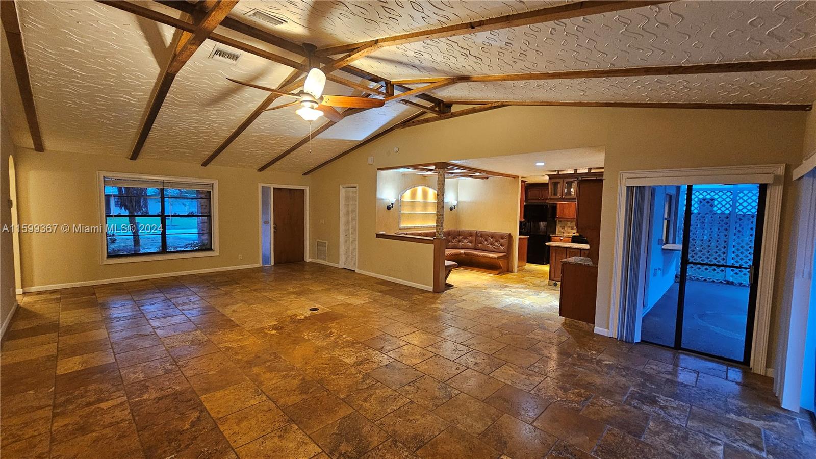 Magnificent 4 bedroom and 2 bathroom Coral Springs pool home! Open and updated country style kitchen features custom wood cabinets, granite counters and newer appliances. Custom made breakfast seating area. Over sized kitchen pantry and laundry room. Large family room and dining area contain high vaulted ceilings with decorative faux wood beam moldings. Gorgeous slate stone tile floors add to the home's unique country feel. Master bedroom suite with 2 separate walk-in closets and sliding glass doors which lead out onto the home's pool deck. Covered terrace over sees the home's inviting swimming pool. Situated on a wonderful spacious lot that has space left over for fruit trees or a kids play area. Centrally located inside an awesome tree lined quite neighborhood.