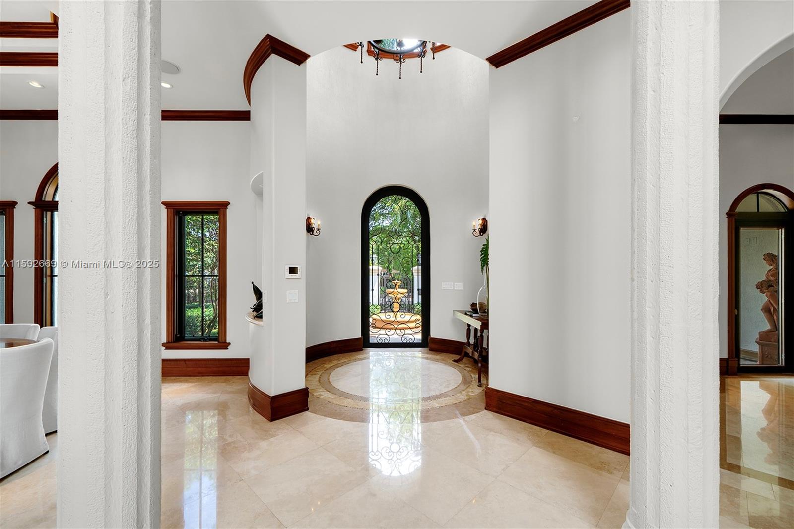 Welcome to this custom 2-story Coral Gables residence. The grand entrance ft. a charming garden w/ a fountain, leading to a majestic front door. Inside, high ceilings & a chandelier greet you to a dining & living area with a fireplace, made w/ hand-crafted natural stones, walnut, & cedar finishes. The space includes a wet bar, wine cellar, & an office/entertainment rm. The expansive kitchen, w/ wood cabinets & marble countertops, opens to a family rm. The laundry rm connects to an in-law suite w/ a bathrm. The secluded primary suite offers a wet bar, a sitting area, private access to the lush backyard, & a bathrm w/ stone finishes, a hidden shower, & vanity. Upstairs, 3 bedrms ft walk-in closets, ensuite bathrms, & balcony access. The backyard ft. a pool, jacuzzi, sauna, & a 3-car garage.