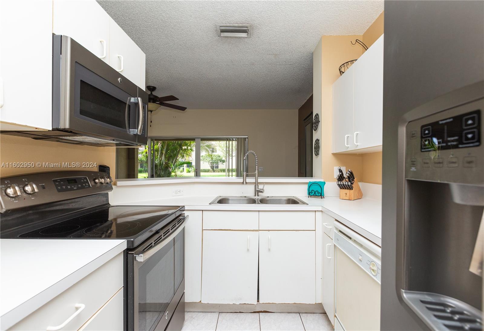 This home features an open floor plan living dining area. This home features a patio overlooking open garden spaces. The interior tile throughout the living area and laminate wood upstairs. Both bedrooms feature large walk-in closets. The home has shutters and also features a new AC unit . The community features a clubhouse area and is located near multiple restaurants and shopping centers. Do not miss the opportunity to own this amazing property. 2 parking spaces, garage and open yard space .