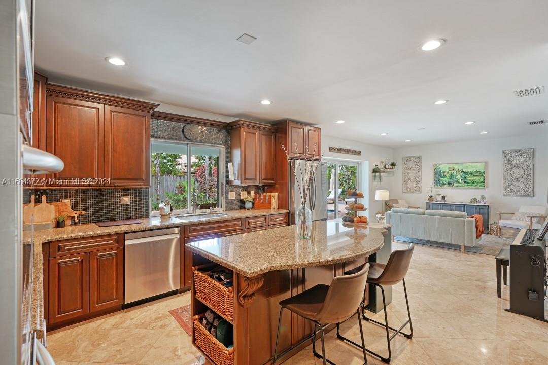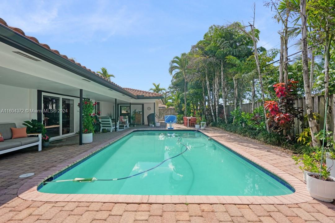 A must see in the highly desired Coral Ridge Country Club neighborhood, just 1 mile from the beach! An open floorplan welcomes you to the living room, dining room, family room and kitchen with stainless appliances, large center island, double convection wall ovens and granite counter tops. Freshly painted interior and exterior, impact windows throughout, new gutters, newer carpet, deep covered patio, heated outdoor shower and more. Split floor plan with oversized primary bedroom and ensuite, 2 large additional bedrooms with adjoining bath, all with walk-in closets. Separate laundry room/pantry with plenty of storage, sink, quartz countertops and folding area. Relax by a secluded tropical garden and pool area with paver terrace. Oversized 2 car garage offers lots of storage.