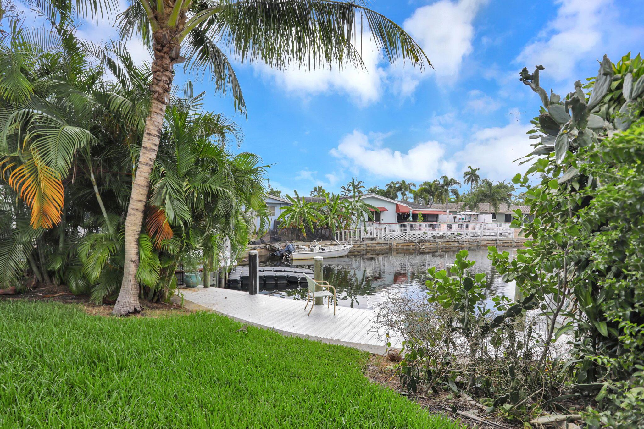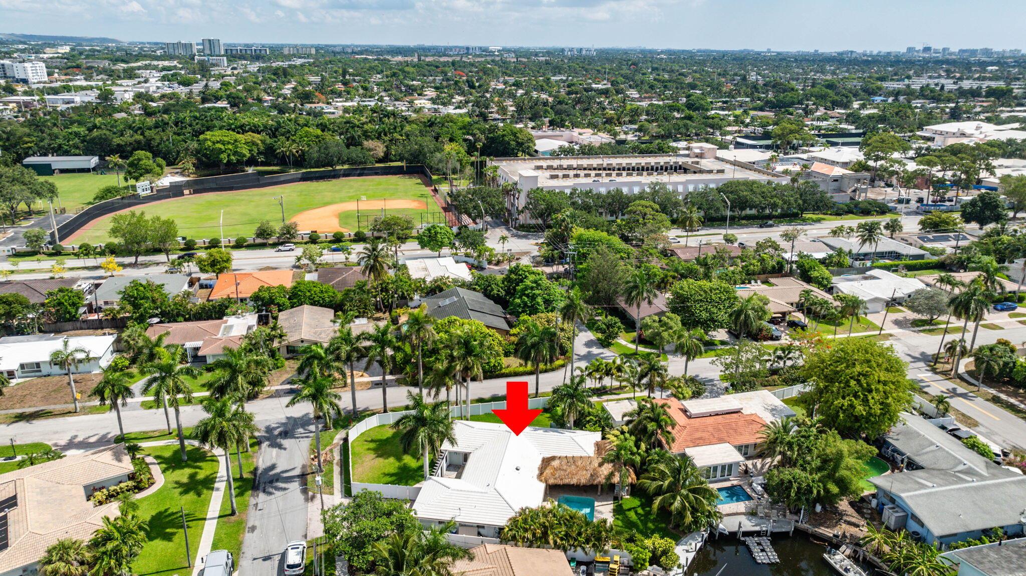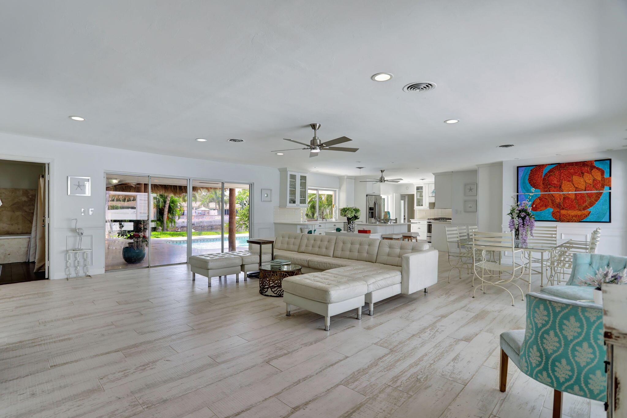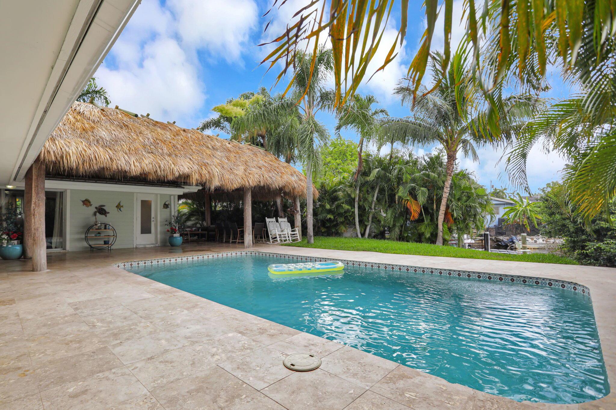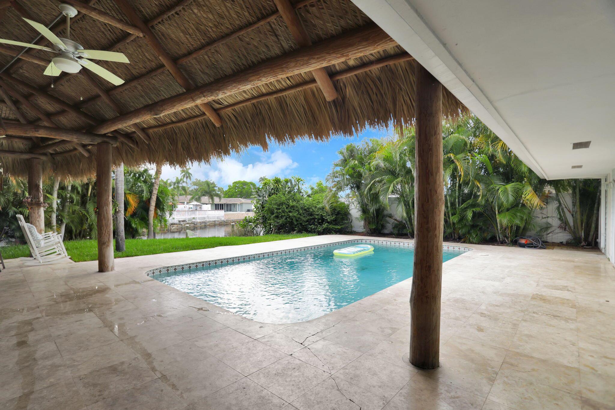 Take advantage of the opportunity to make this remarkable 4 bedroom 3 bathroom waterfront property your new home. The large 2-car garage was converted into the 4th bedroom making this beautifully updated home a spacious and wide split floorplan with an expansive 2313 sq foot adjusted living space. The house sits on an oversized corner lot that offers plenty of private space completely fenced in. Unwind under the huge tiki hut overlooking the sparkling pool and canal with access to the intracoastal, which creates a stunning oasis of relaxation fun for entertaining guests or just enjoying the Florida lifestyle. Just minutes away from the beach, airport, restaurants, just a few blocks away from the prestigious Pinecrest school, and is nestled in the highly desirable Coral Ridge Isles.