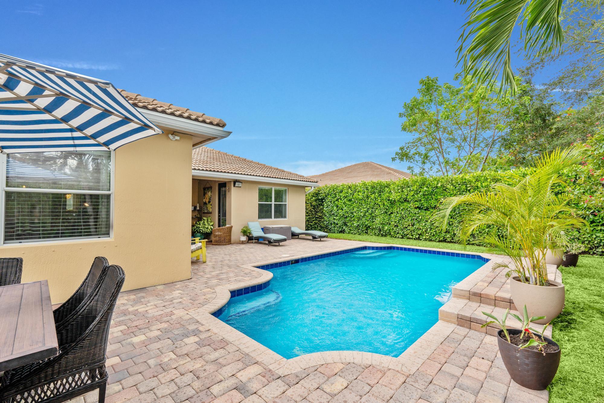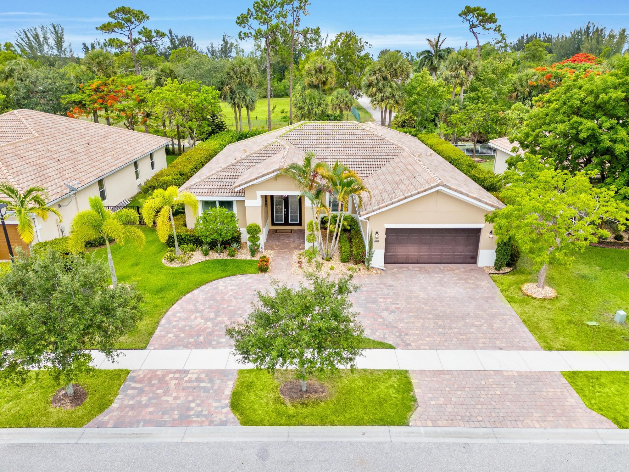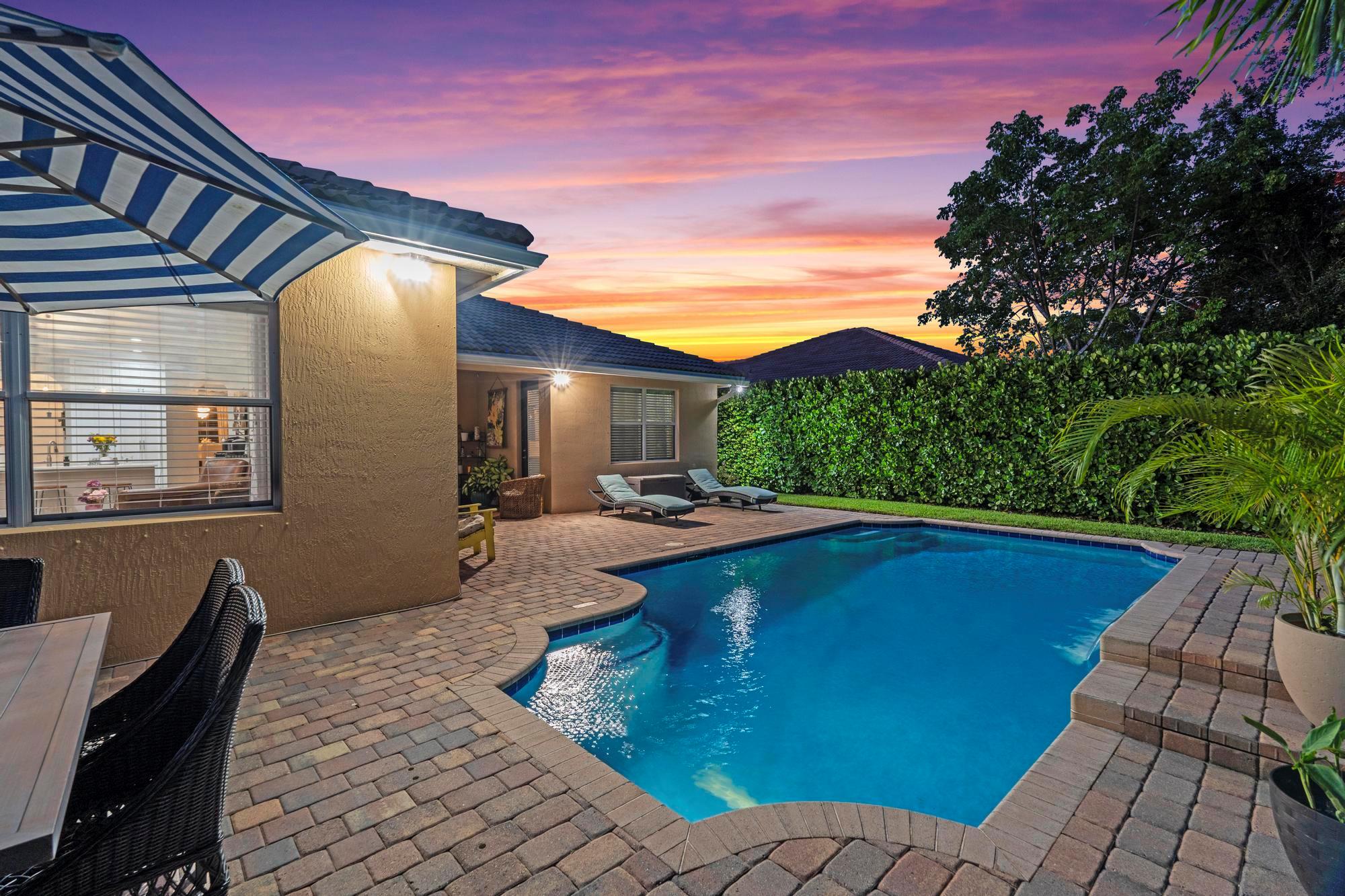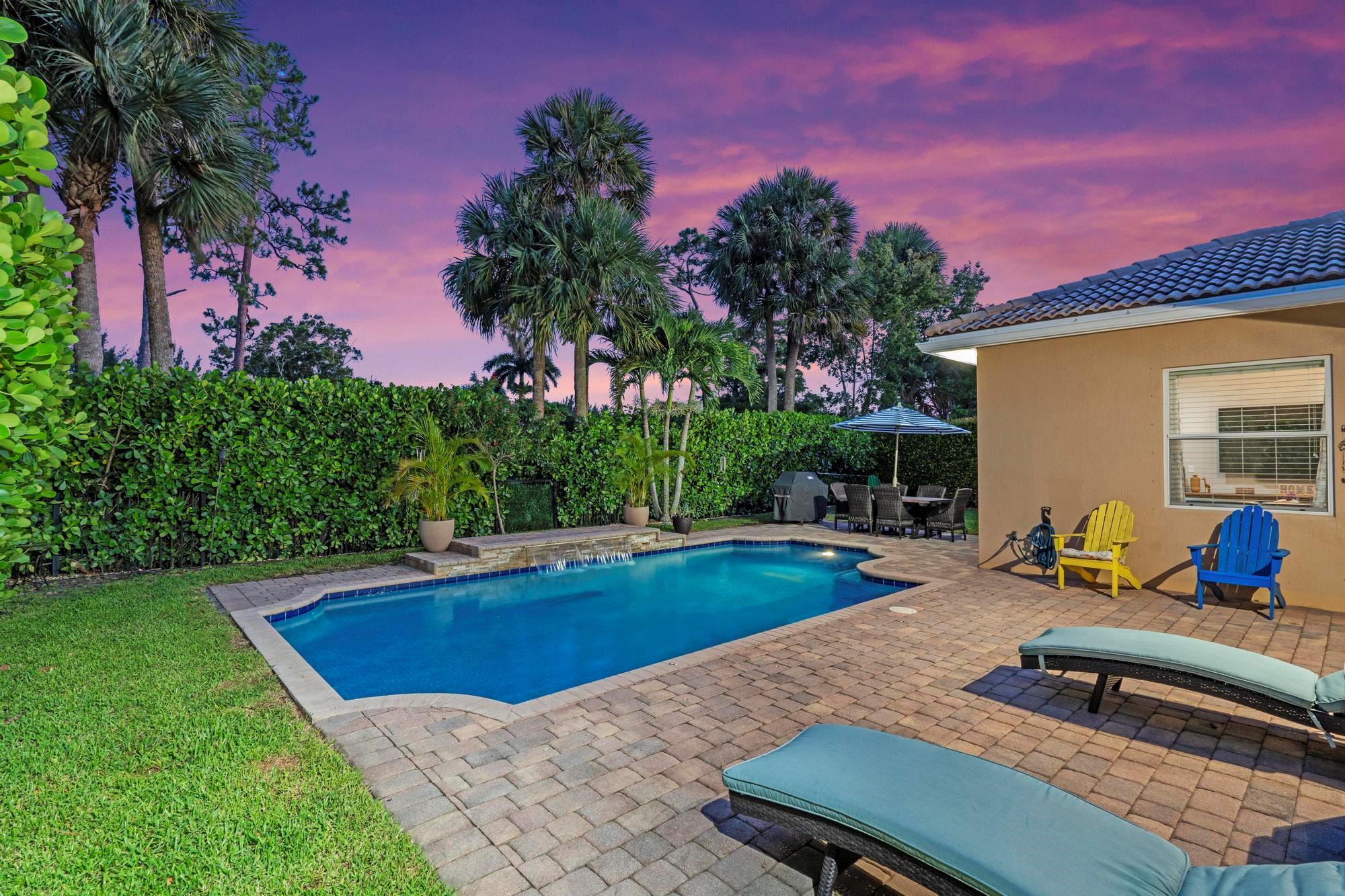 Welcome Home to Luxury! 4 Beds PLUS a huge DEN to make it a 5th Bedroom. With over $50,000 in upgrades, this residence boasts a brick paver circular driveway, lush landscaping, and a hurricane impact glass front door. Inside crown molding adorns every living space. Tile flooring throughout and laminate in all bedrooms. The renovated kitchen features Bosch appliances, with a a Zline drawer microwave and pantry with pull-out drawers. Step through cabana doors to a private oasis, well maintained pool with its own waterfall. The master bedroom offers 2 new California closets, and newly installed master bath double vanity. Plus, enjoy the comfort of newer AC. Nestled in a Low HOA gated community. PBI Airport is 10 mins away, and short proximity to all main Highways. All ''A'' rated schools!