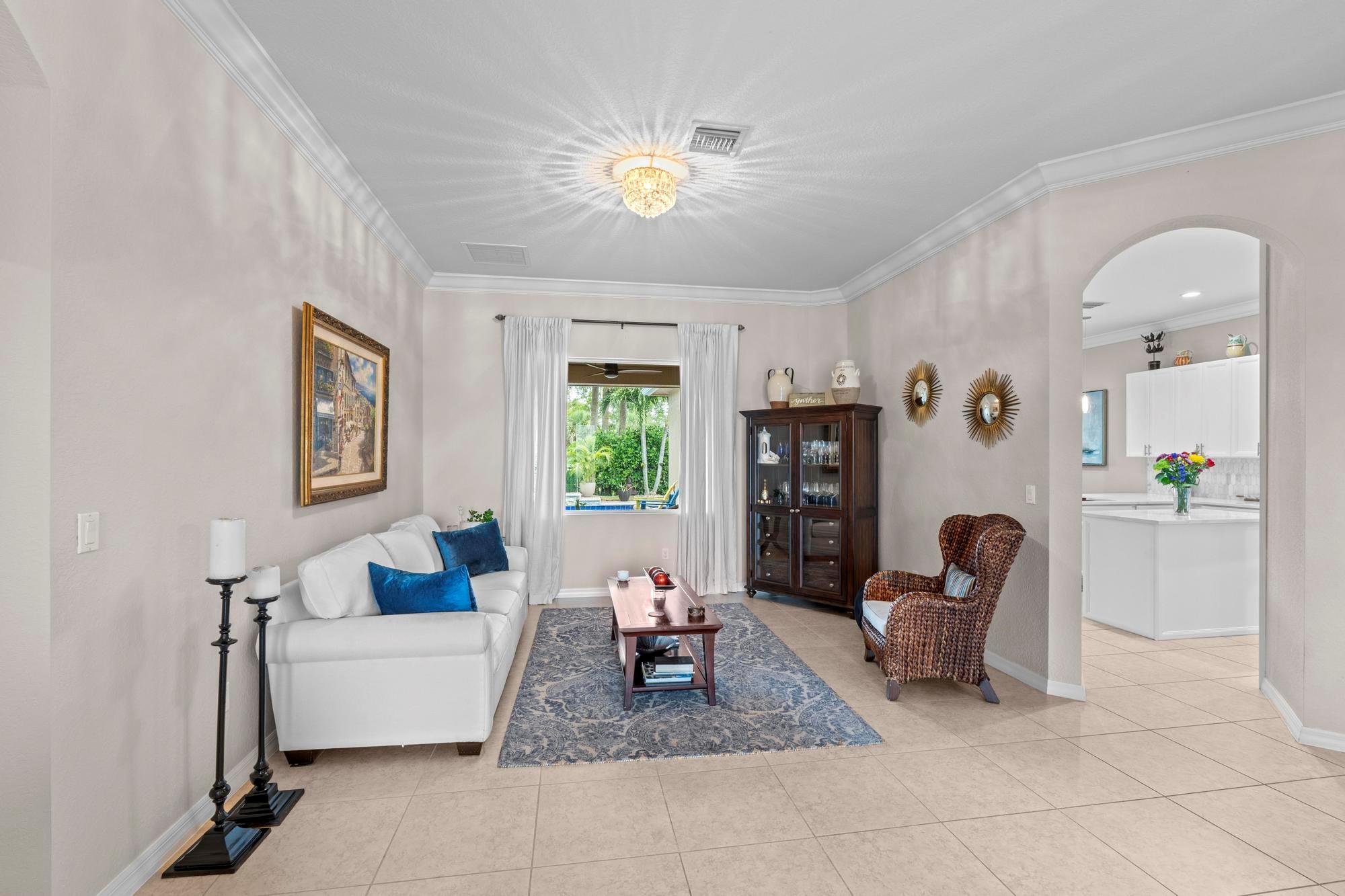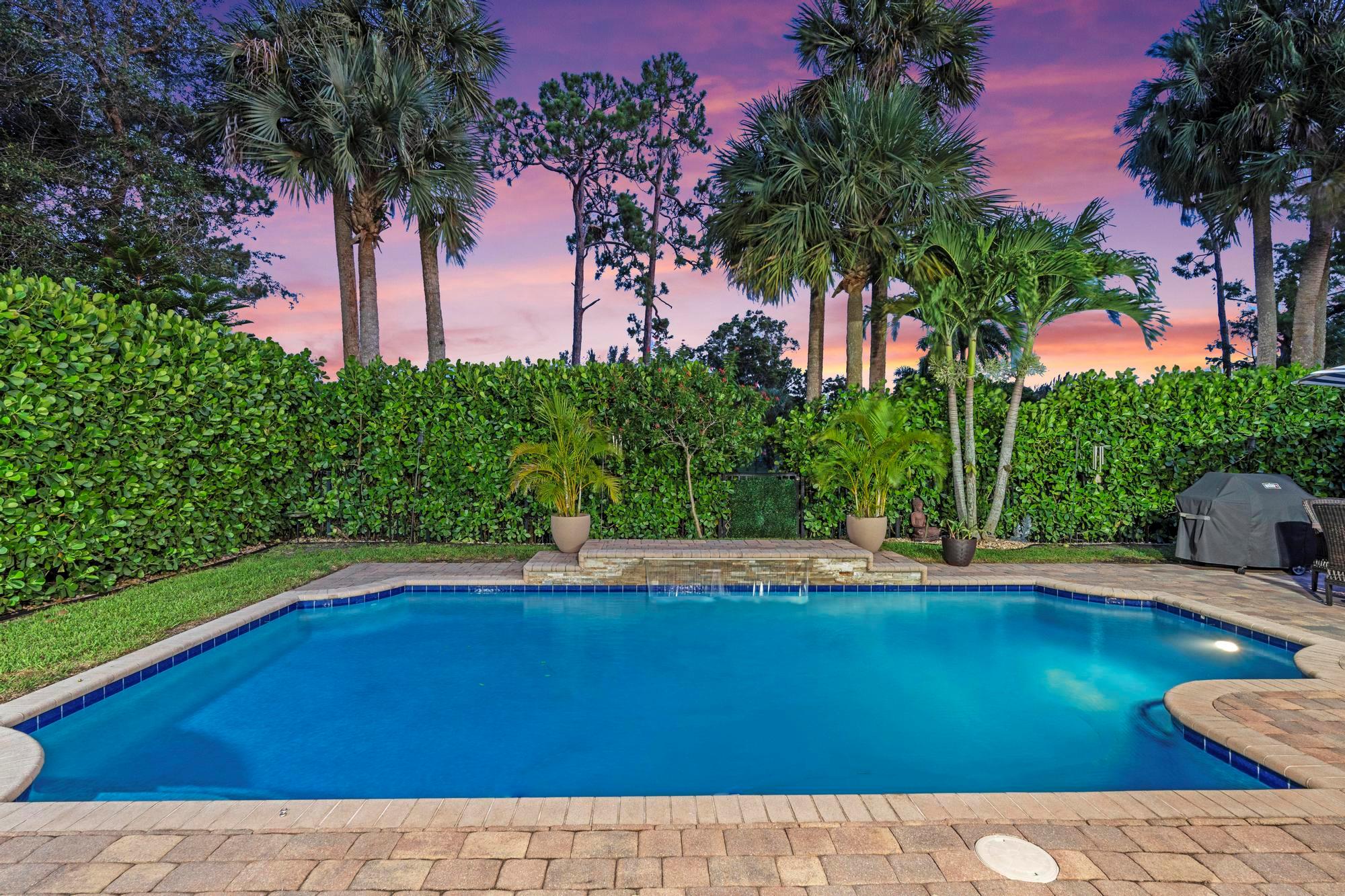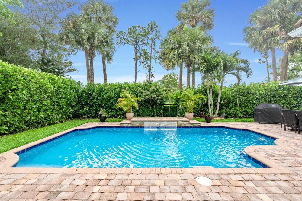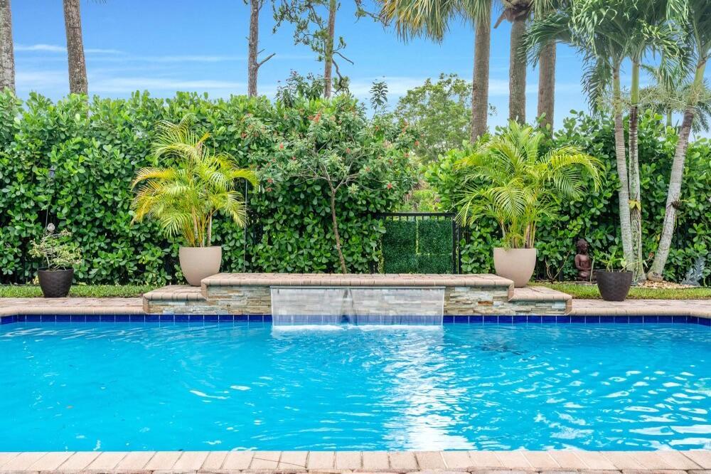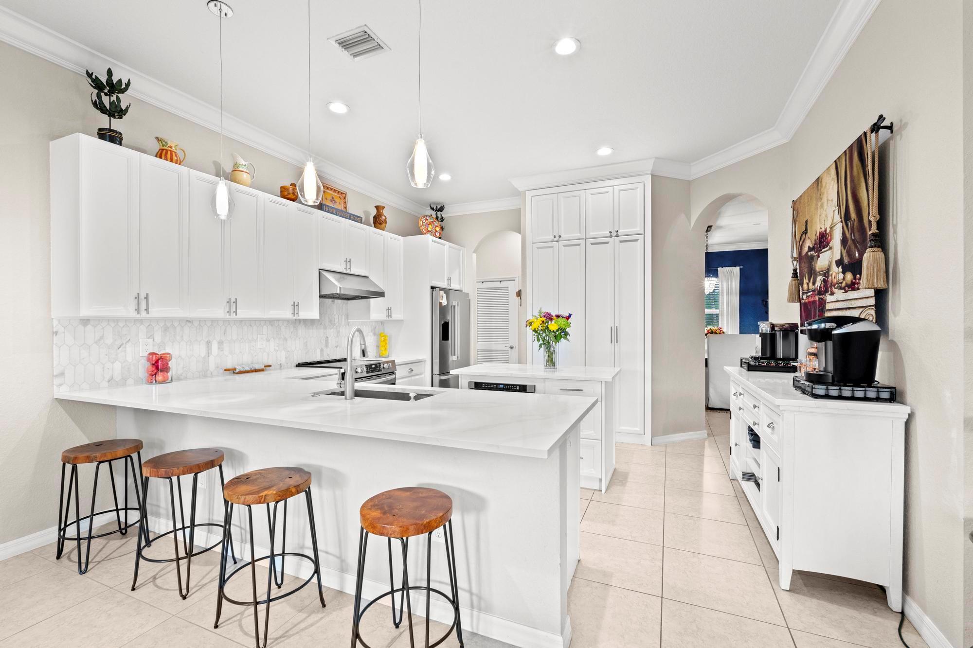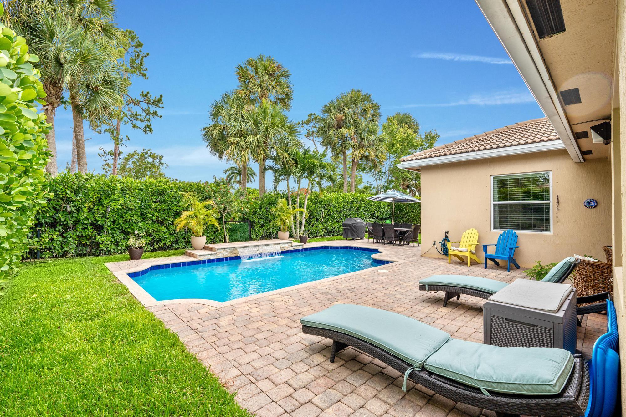 Welcome Home to Luxury! 4 Beds PLUS a huge DEN to make it a 5th Bedroom. With over $50,000 in upgrades, this residence boasts a brick paver circular driveway, lush landscaping, and a hurricane impact glass front door. Inside crown molding adorns every living space. Tile flooring throughout and laminate in all bedrooms. The renovated kitchen features Bosch appliances, with a a Zline drawer microwave and pantry with pull-out drawers. Step through cabana doors to a private oasis, well maintained pool with its own waterfall. The master bedroom offers 2 new California closets, and newly installed master bath double vanity. Plus, enjoy the comfort of newer AC. Nestled in a Low HOA gated community. PBI Airport is 10 mins away, and short proximity to all main Highways. All ''A'' rated schools!
