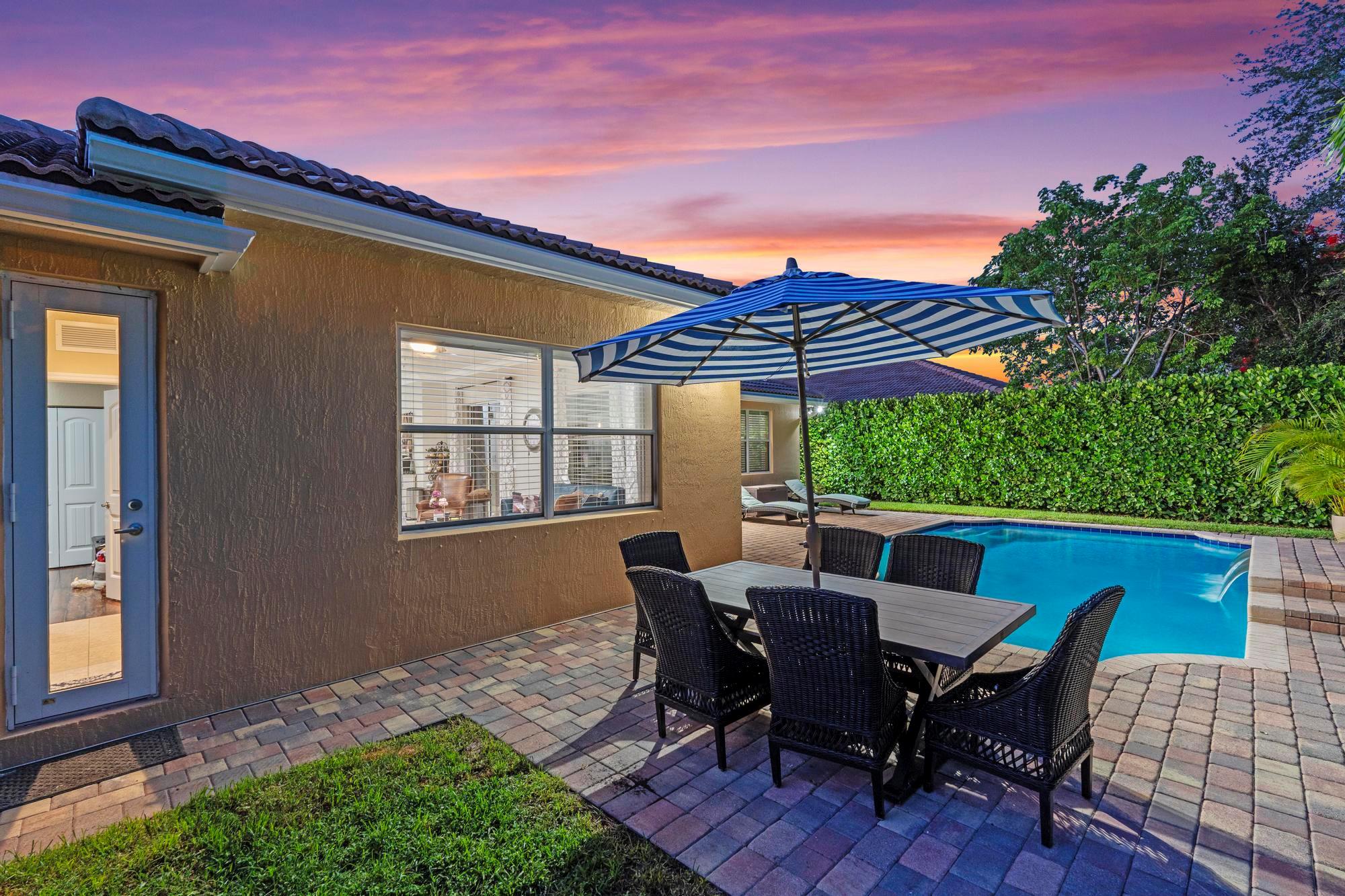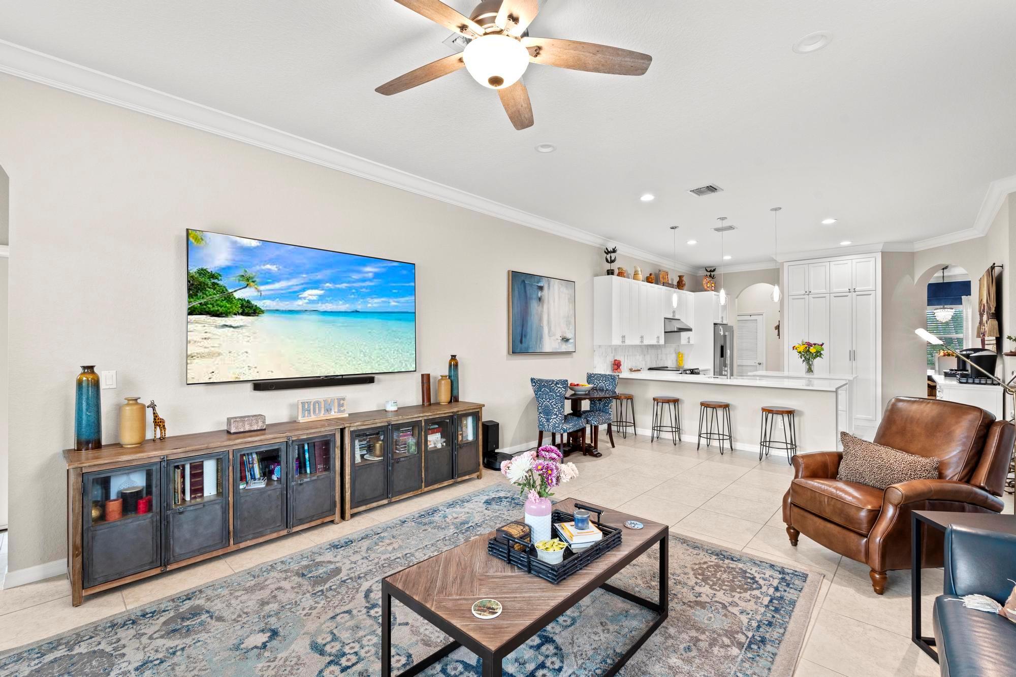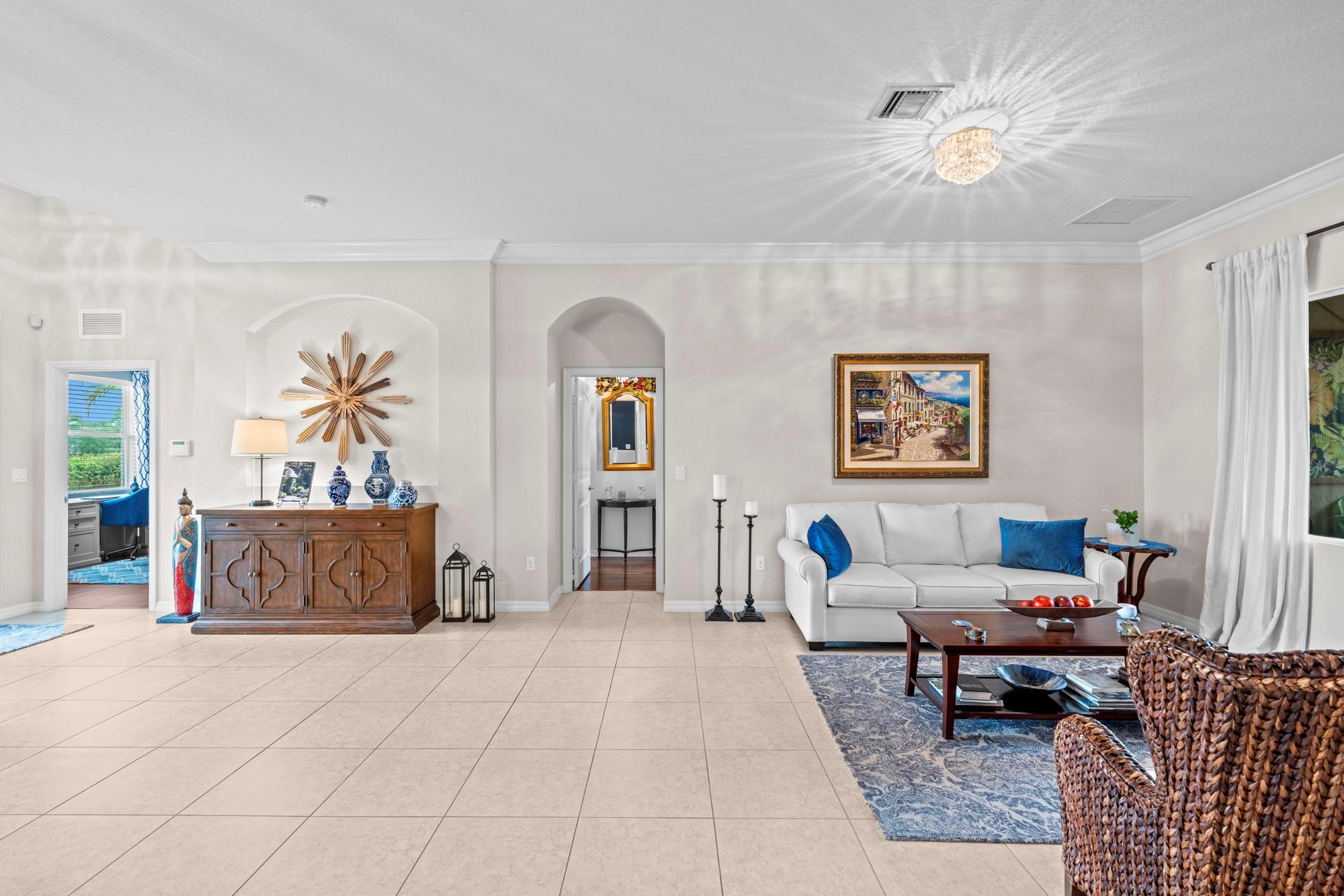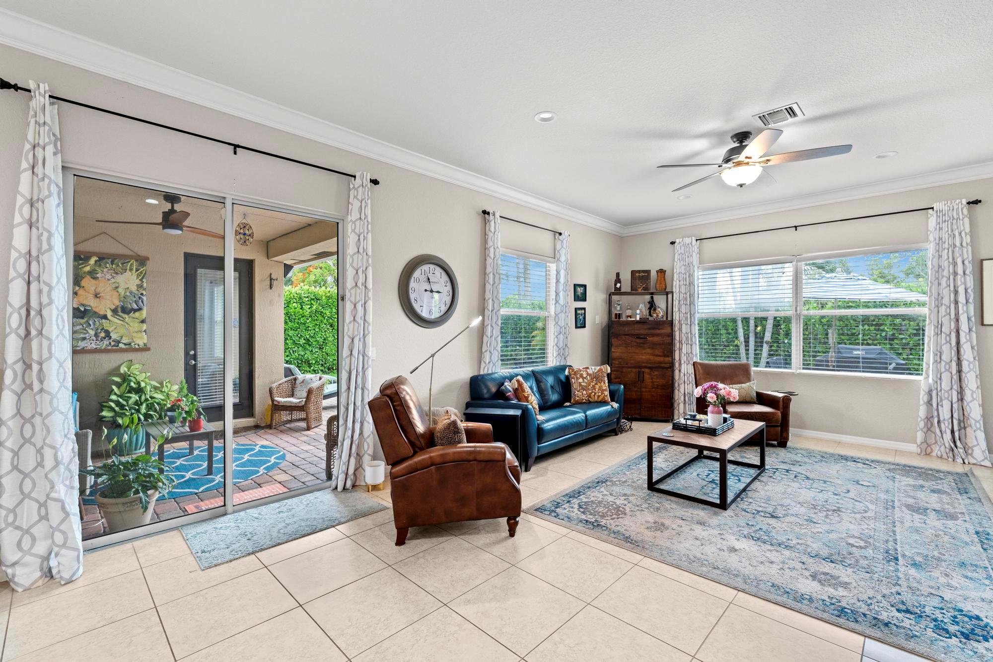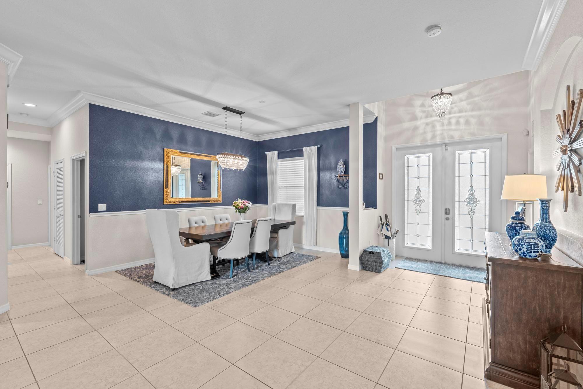 Welcome Home to Luxury! 4 Beds PLUS a huge DEN to make it a 5th Bedroom. With over $50,000 in upgrades, this residence boasts a brick paver circular driveway, lush landscaping, and a hurricane impact glass front door. Inside crown molding adorns every living space. Tile flooring throughout and laminate in all bedrooms. The renovated kitchen features Bosch appliances, with a a Zline drawer microwave and pantry with pull-out drawers. Step through cabana doors to a private oasis, well maintained pool with its own waterfall. The master bedroom offers 2 new California closets, and newly installed master bath double vanity. Plus, enjoy the comfort of newer AC. Nestled in a Low HOA gated community. PBI Airport is 10 mins away, and short proximity to all main Highways. All ''A'' rated schools!