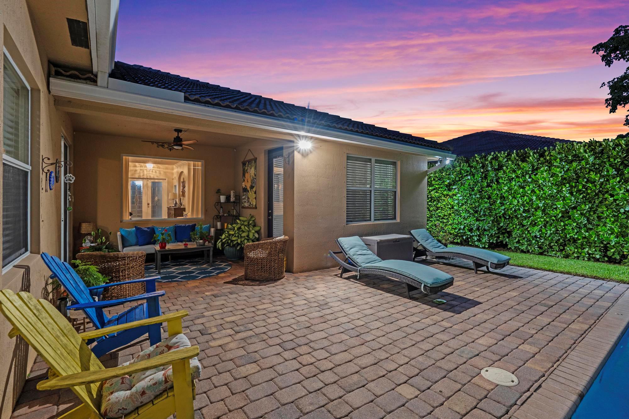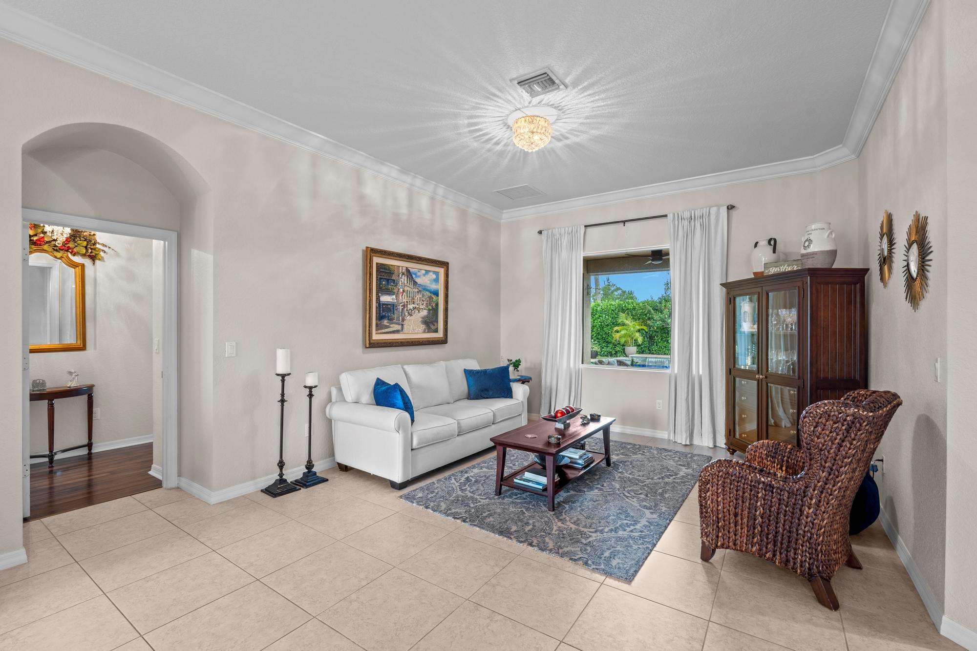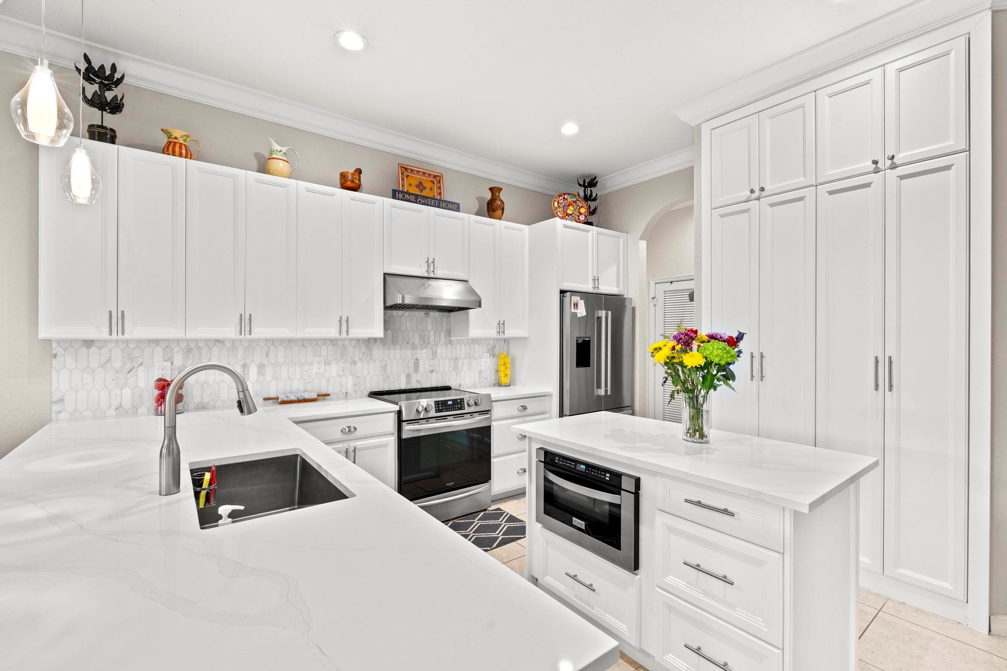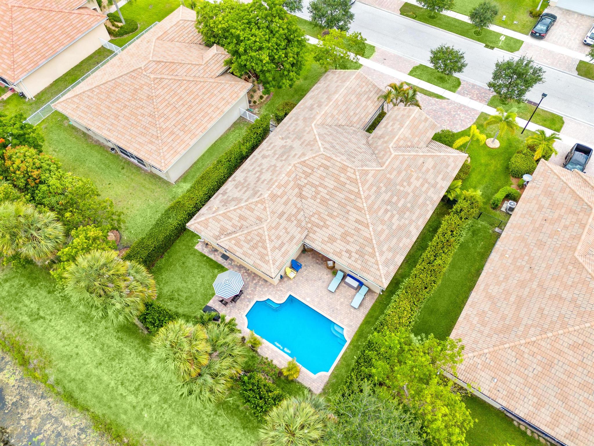 Welcome Home to Luxury! 4 Beds PLUS a huge DEN to make it a 5th Bedroom. With over $50,000 in upgrades, this residence boasts a brick paver circular driveway, lush landscaping, and a hurricane impact glass front door. Inside crown molding adorns every living space. Tile flooring throughout and laminate in all bedrooms. The renovated kitchen features Bosch appliances, with a a Zline drawer microwave and pantry with pull-out drawers. Step through cabana doors to a private oasis, well maintained pool with its own waterfall. The master bedroom offers 2 new California closets, and newly installed master bath double vanity. Plus, enjoy the comfort of newer AC. Nestled in a Low HOA gated community. PBI Airport is 10 mins away, and short proximity to all main Highways. All ''A'' rated schools!