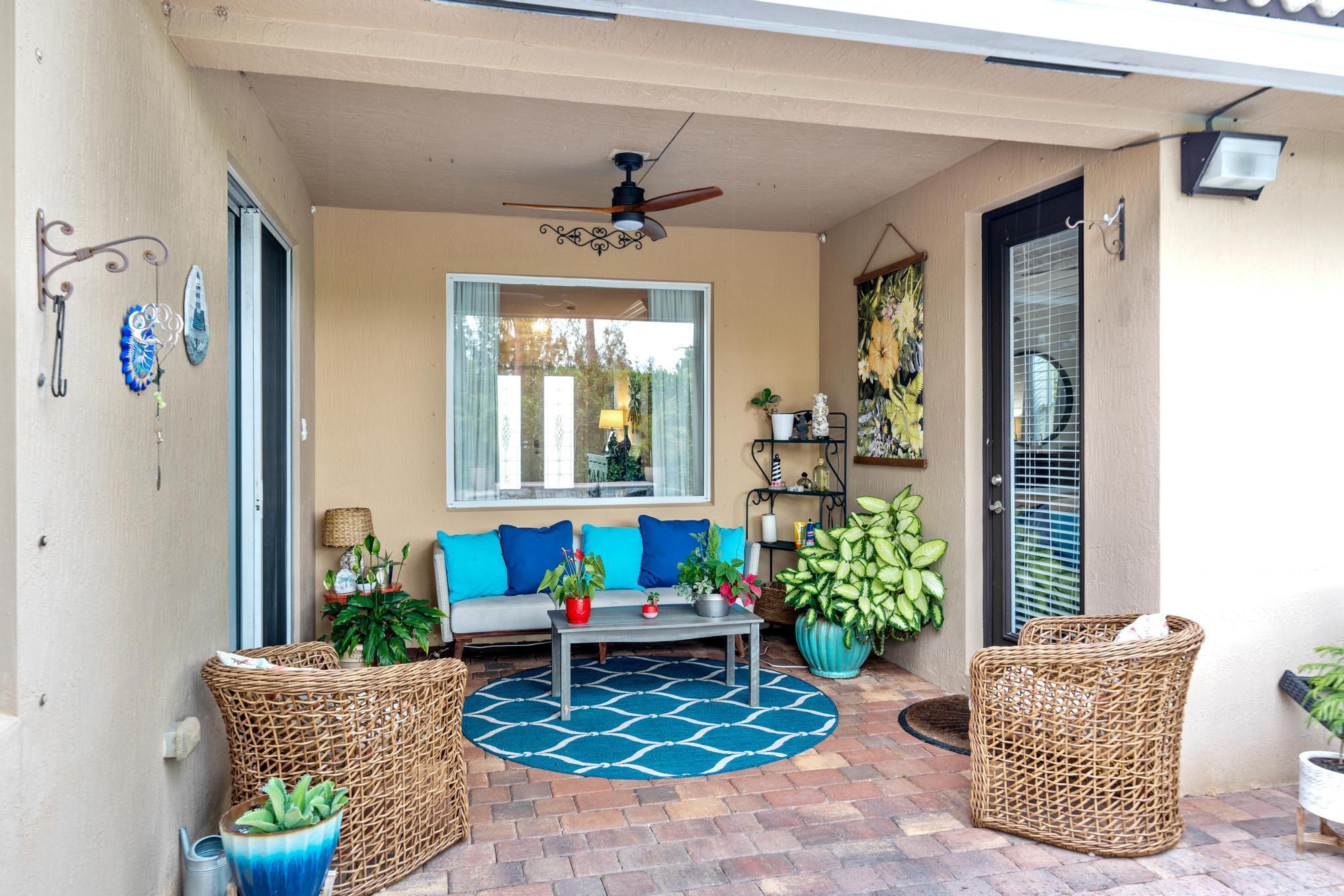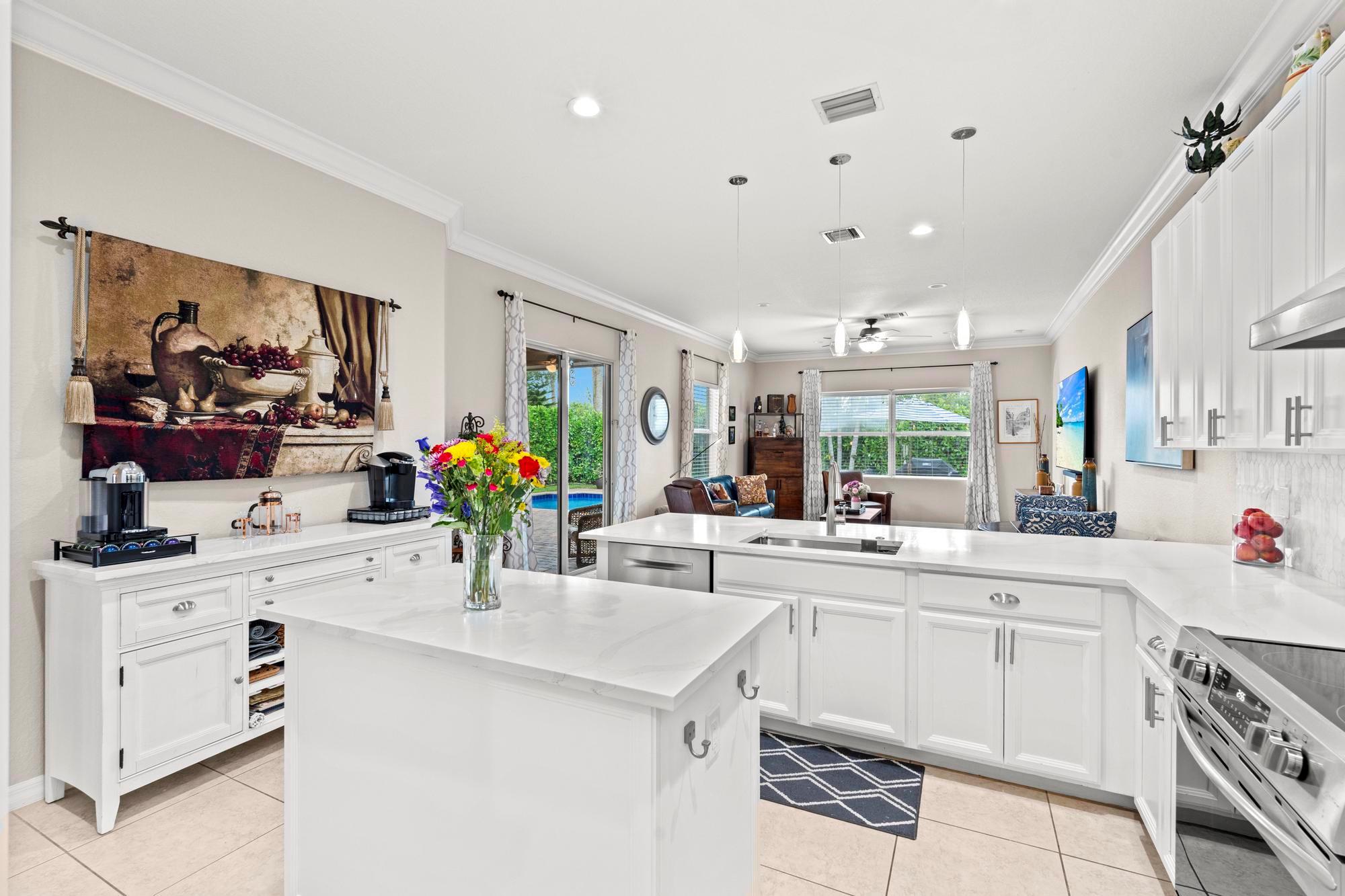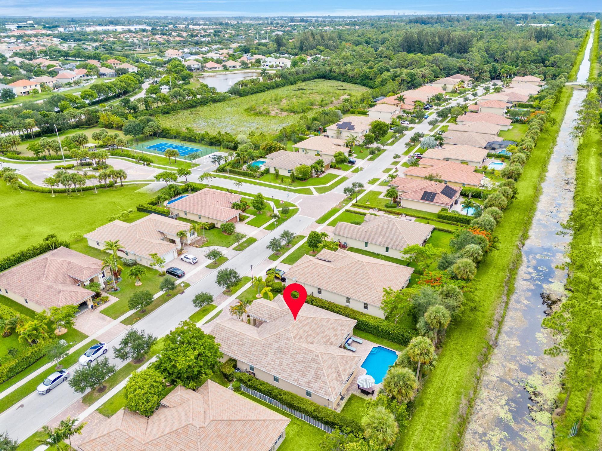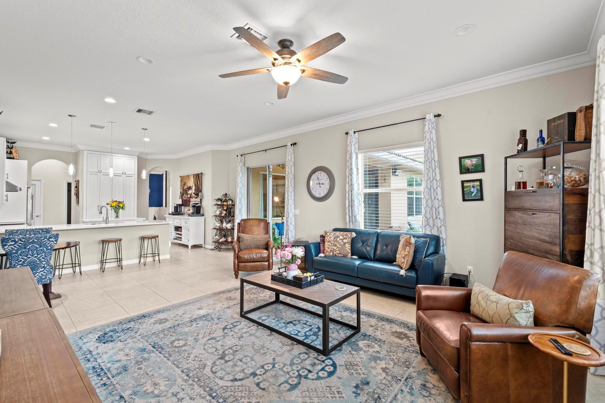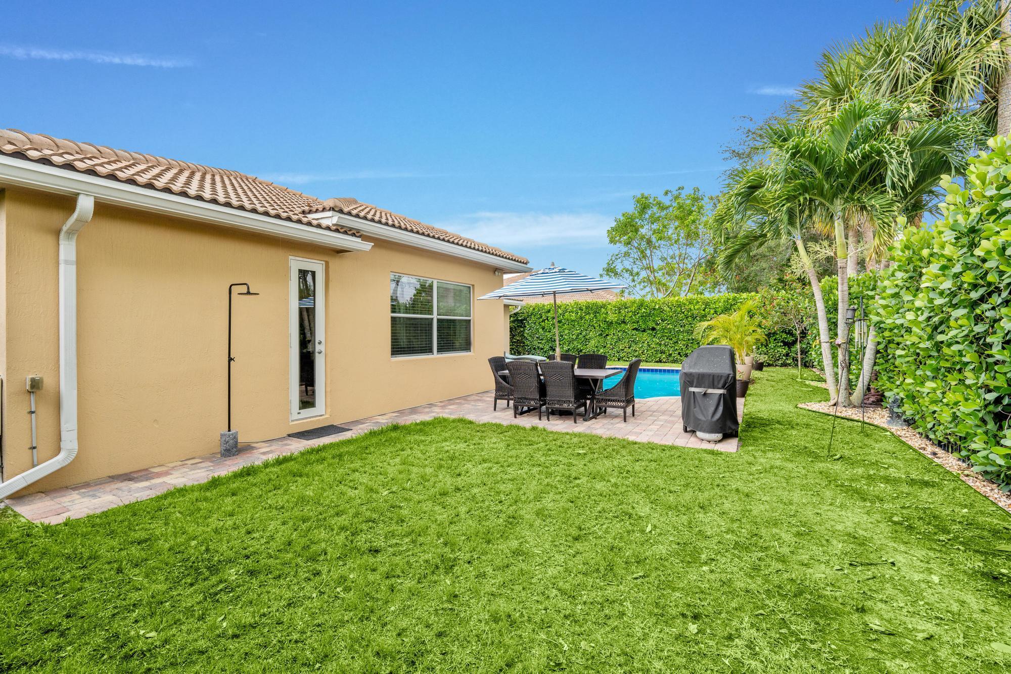 Welcome Home to Luxury! 4 Beds PLUS a huge DEN to make it a 5th Bedroom. With over $50,000 in upgrades, this residence boasts a brick paver circular driveway, lush landscaping, and a hurricane impact glass front door. Inside crown molding adorns every living space. Tile flooring throughout and laminate in all bedrooms. The renovated kitchen features Bosch appliances, with a a Zline drawer microwave and pantry with pull-out drawers. Step through cabana doors to a private oasis, well maintained pool with its own waterfall. The master bedroom offers 2 new California closets, and newly installed master bath double vanity. Plus, enjoy the comfort of newer AC. Nestled in a Low HOA gated community. PBI Airport is 10 mins away, and short proximity to all main Highways. All ''A'' rated schools!