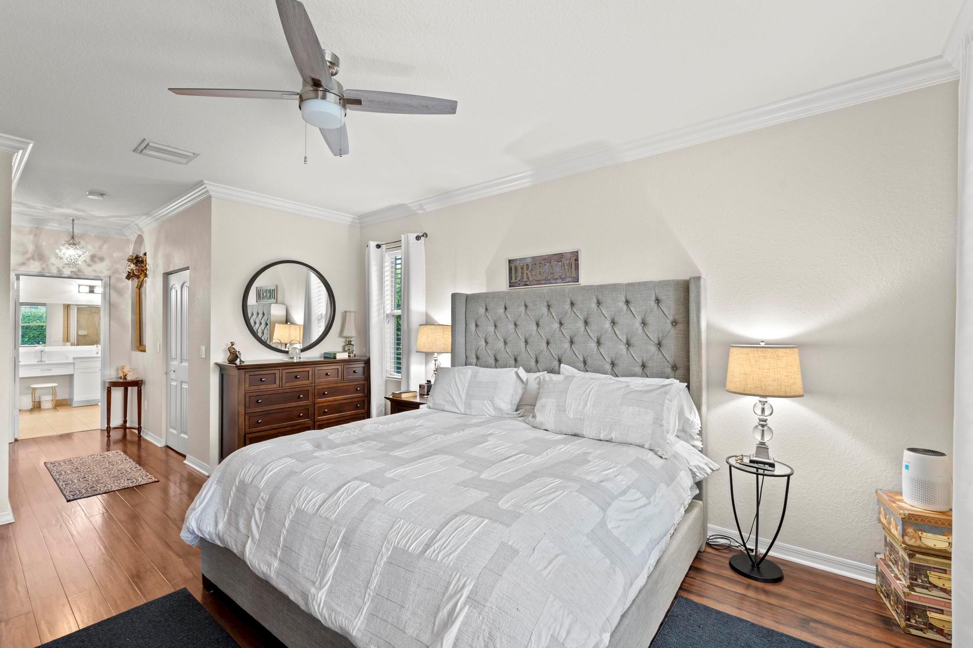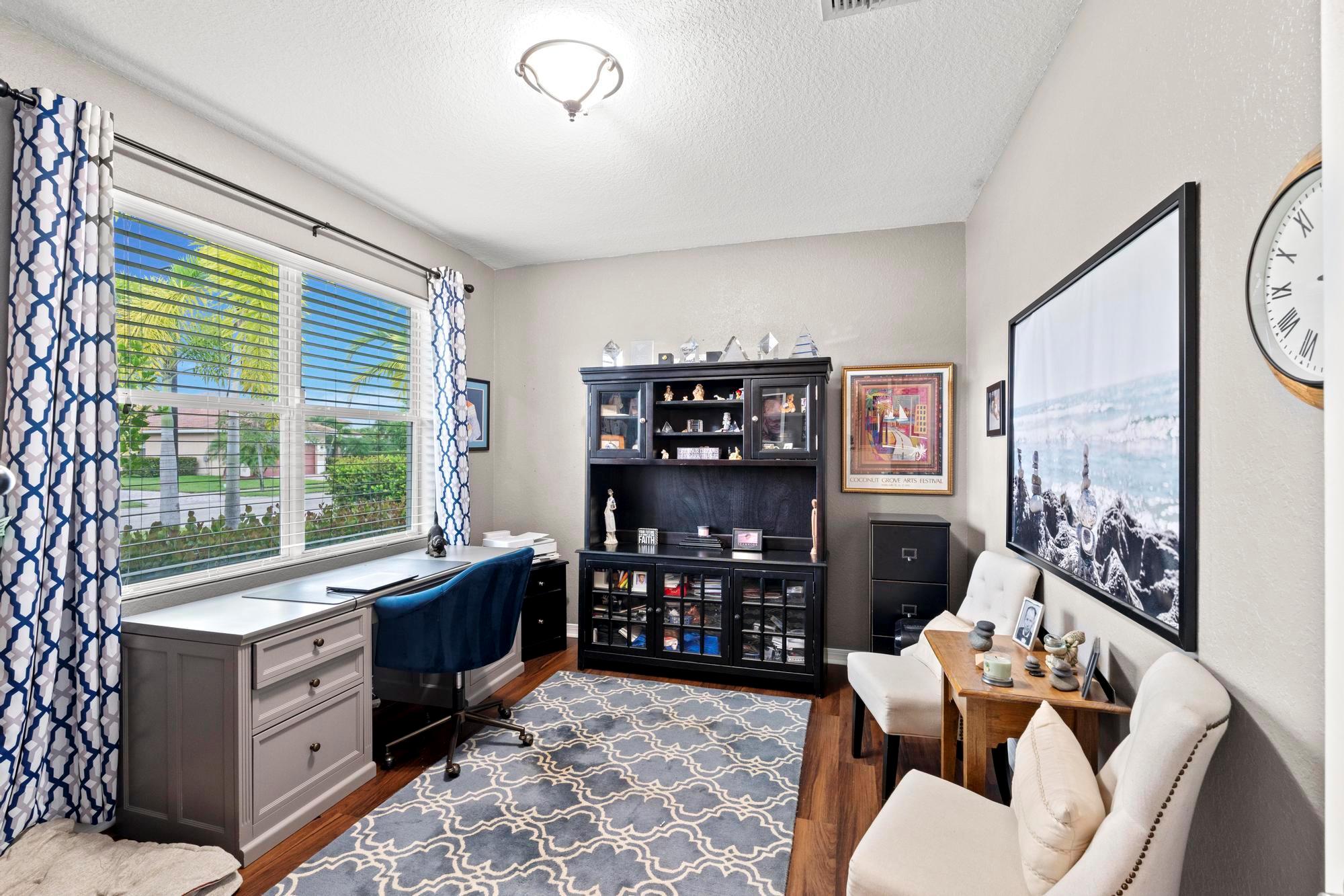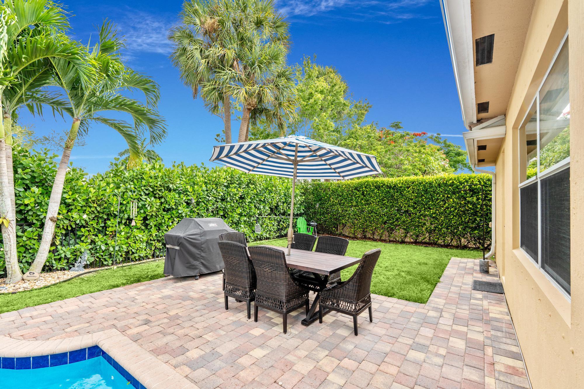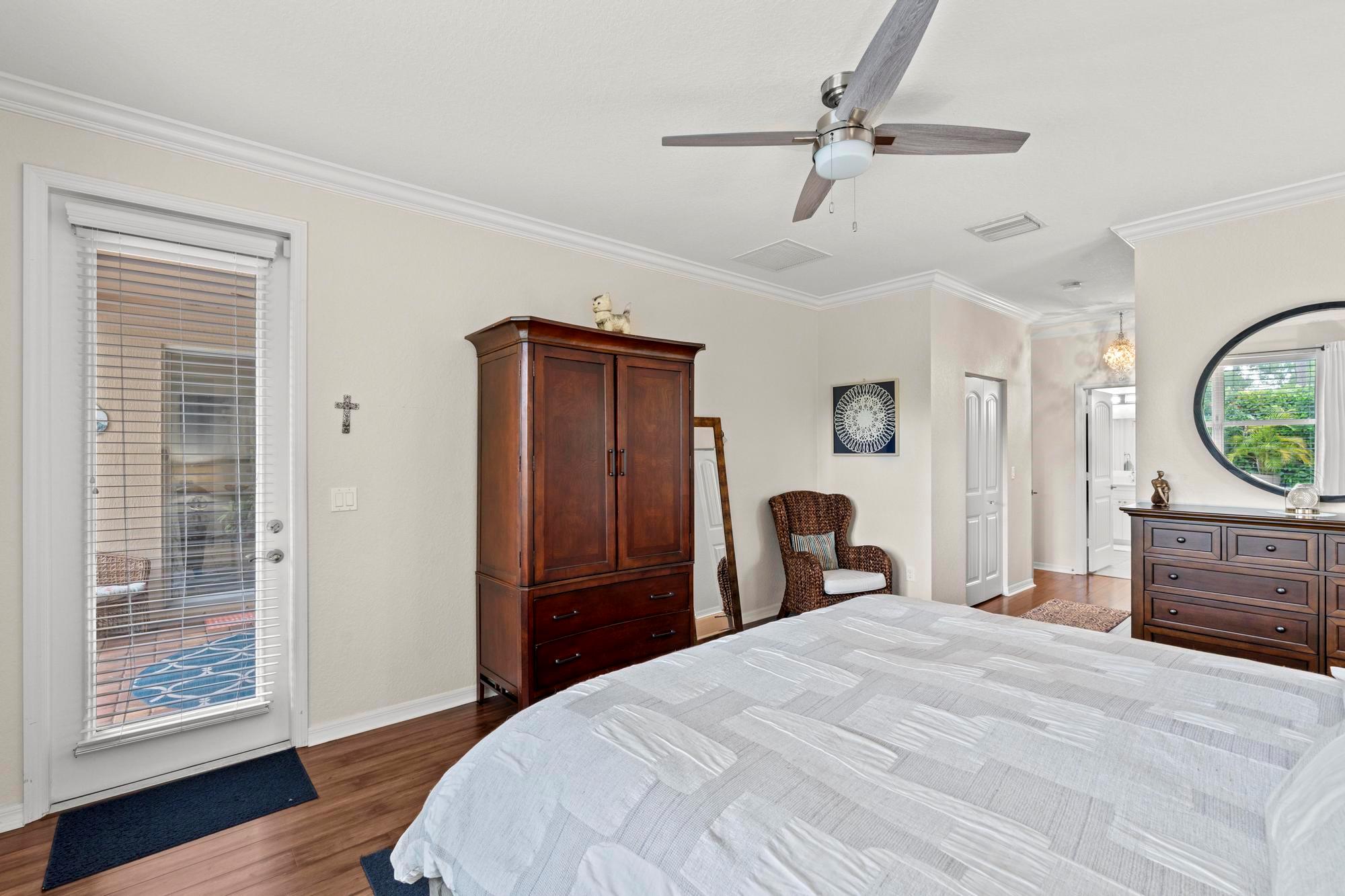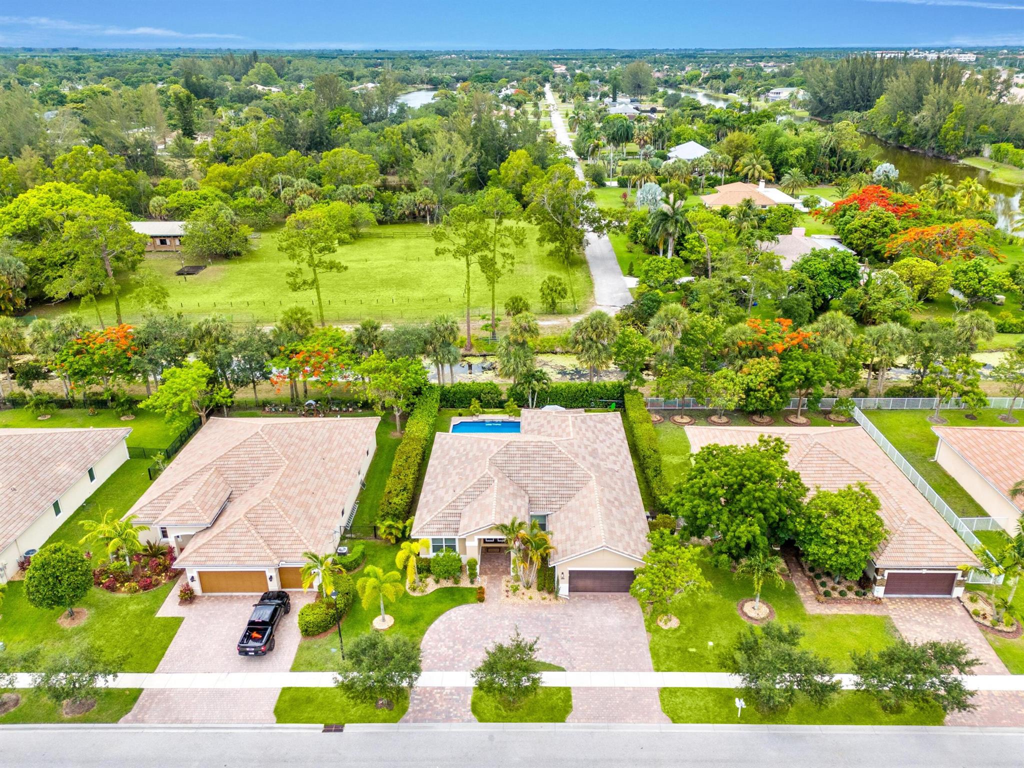 Welcome Home to Luxury! 4 Beds PLUS a huge DEN to make it a 5th Bedroom. With over $50,000 in upgrades, this residence boasts a brick paver circular driveway, lush landscaping, and a hurricane impact glass front door. Inside crown molding adorns every living space. Tile flooring throughout and laminate in all bedrooms. The renovated kitchen features Bosch appliances, with a a Zline drawer microwave and pantry with pull-out drawers. Step through cabana doors to a private oasis, well maintained pool with its own waterfall. The master bedroom offers 2 new California closets, and newly installed master bath double vanity. Plus, enjoy the comfort of newer AC. Nestled in a Low HOA gated community. PBI Airport is 10 mins away, and short proximity to all main Highways. All ''A'' rated schools!