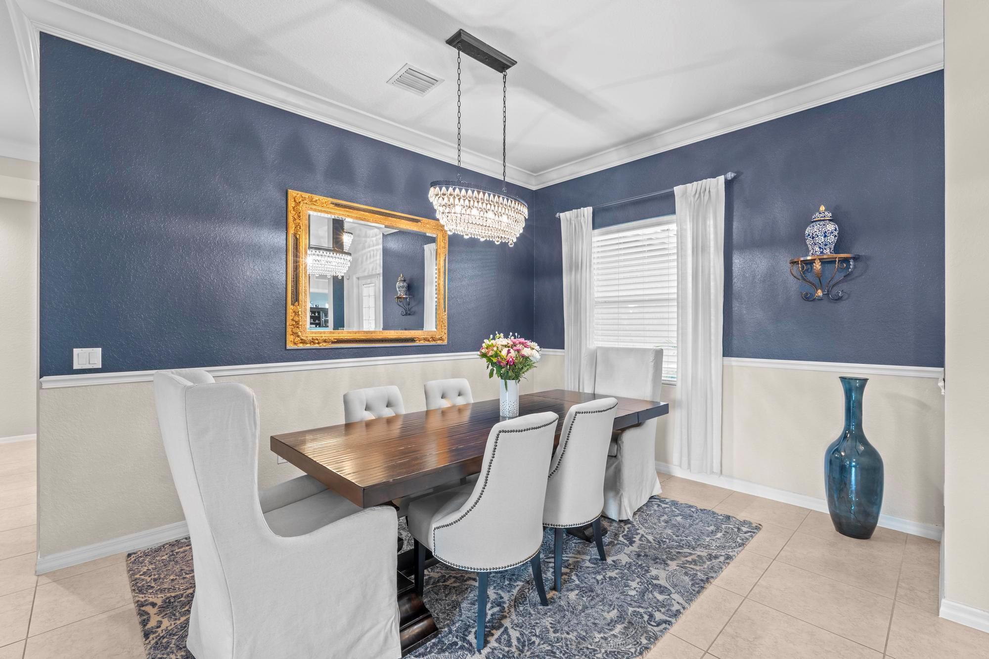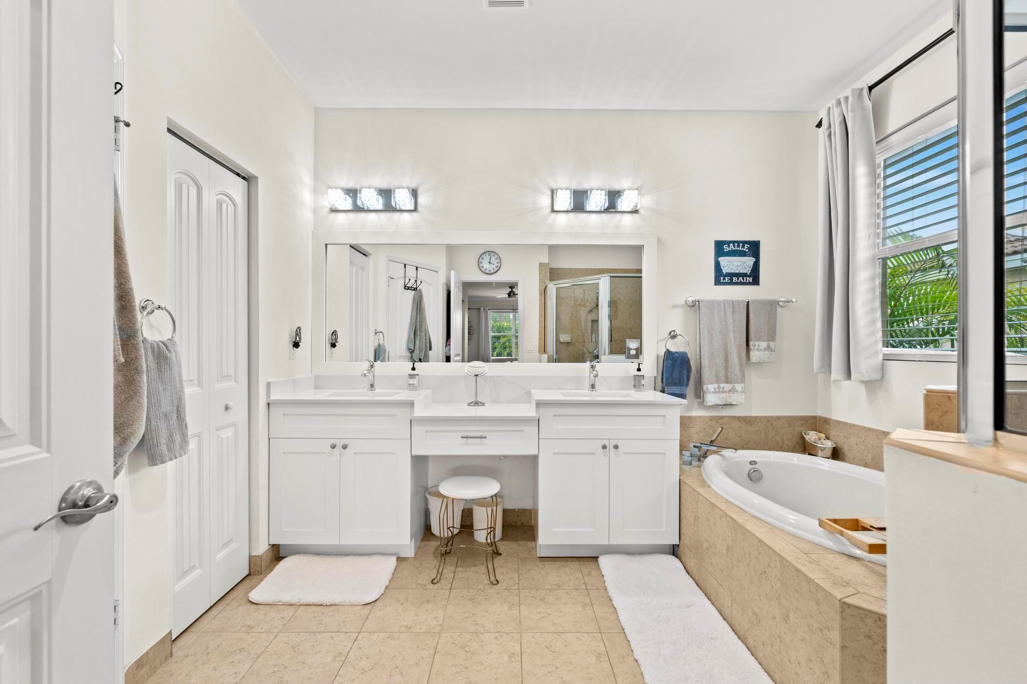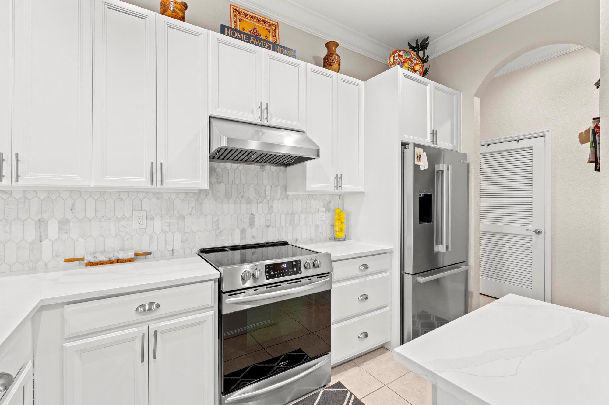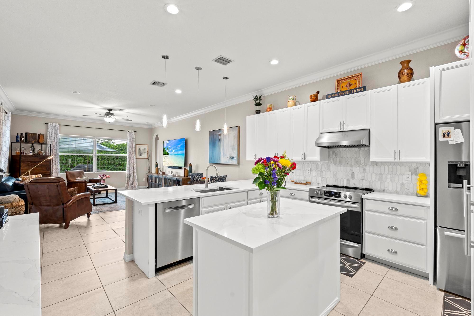 Welcome Home to Luxury! 4 Beds PLUS a huge DEN to make it a 5th Bedroom. With over $50,000 in upgrades, this residence boasts a brick paver circular driveway, lush landscaping, and a hurricane impact glass front door. Inside crown molding adorns every living space. Tile flooring throughout and laminate in all bedrooms. The renovated kitchen features Bosch appliances, with a a Zline drawer microwave and pantry with pull-out drawers. Step through cabana doors to a private oasis, well maintained pool with its own waterfall. The master bedroom offers 2 new California closets, and newly installed master bath double vanity. Plus, enjoy the comfort of newer AC. Nestled in a Low HOA gated community. PBI Airport is 10 mins away, and short proximity to all main Highways. All ''A'' rated schools!