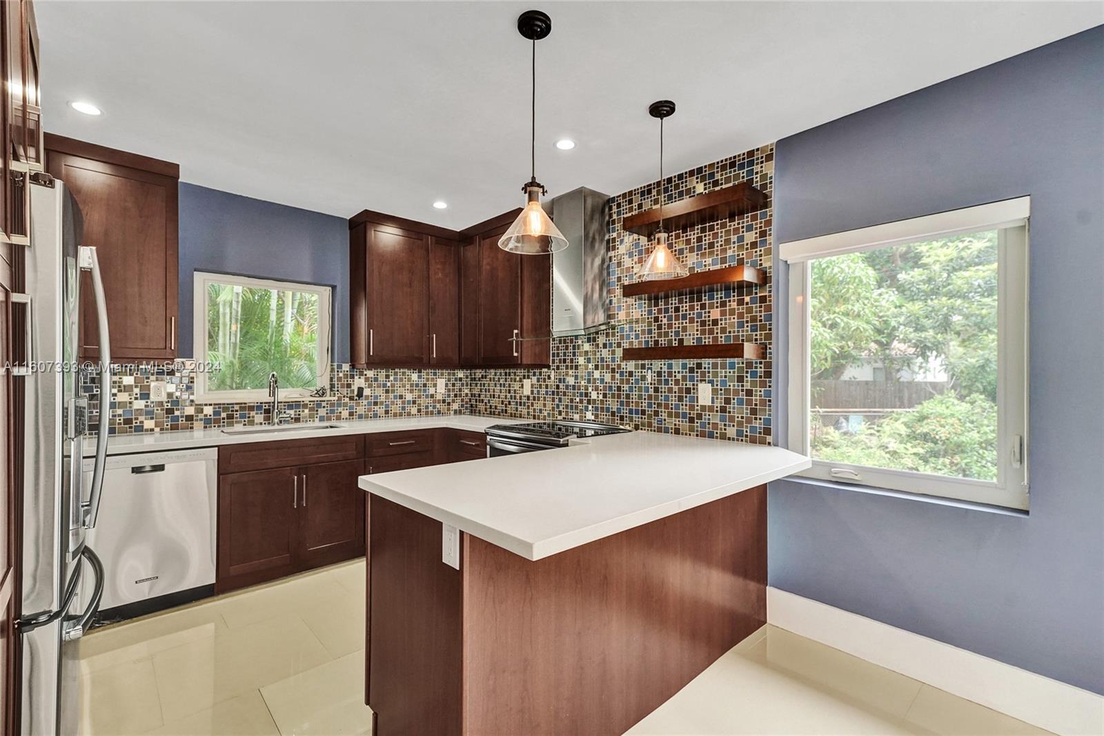 This is a beautifully renovated Mid-Century gem! With contemporary finishes and an open flow, this home offers bright living spaces that are sure to captivate. The kitchen was updated with cherry cabinets, sleek Quartz countertops, and stunning glass and stainless steel tiled backsplashes. Top-of-the-line stainless appliances complete the modern culinary experience. Porcelain tile flooring throughout adds a touch of elegance. The impact windows and doors provide both security and energy efficiency. The spacious master bedroom features a walk-in closet, and the French impact door opens to your private deck, a tranquil oasis for relaxation. Whether you’re sipping morning coffee or unwinding after a long day, this peaceful retreat awaits you.