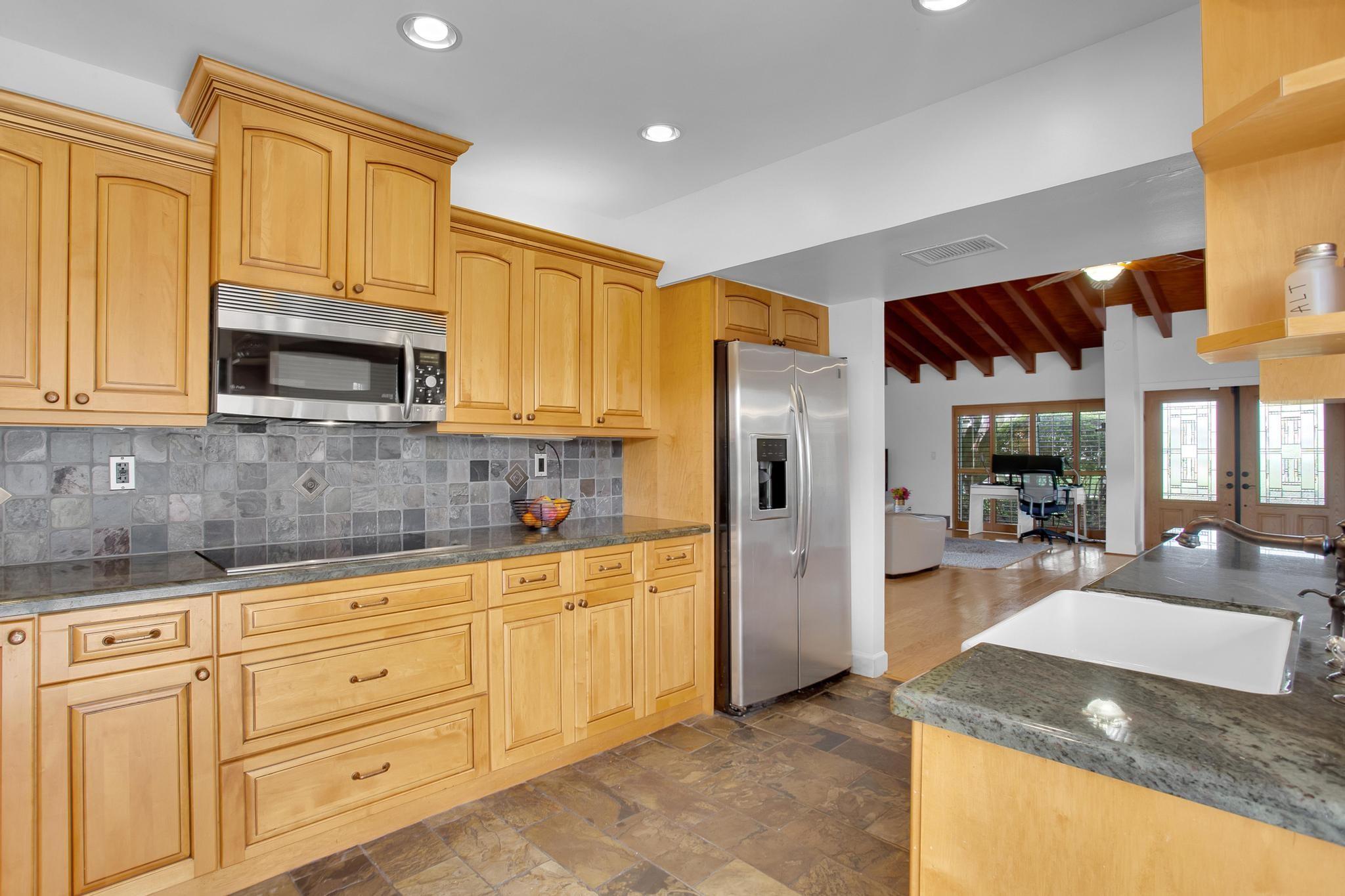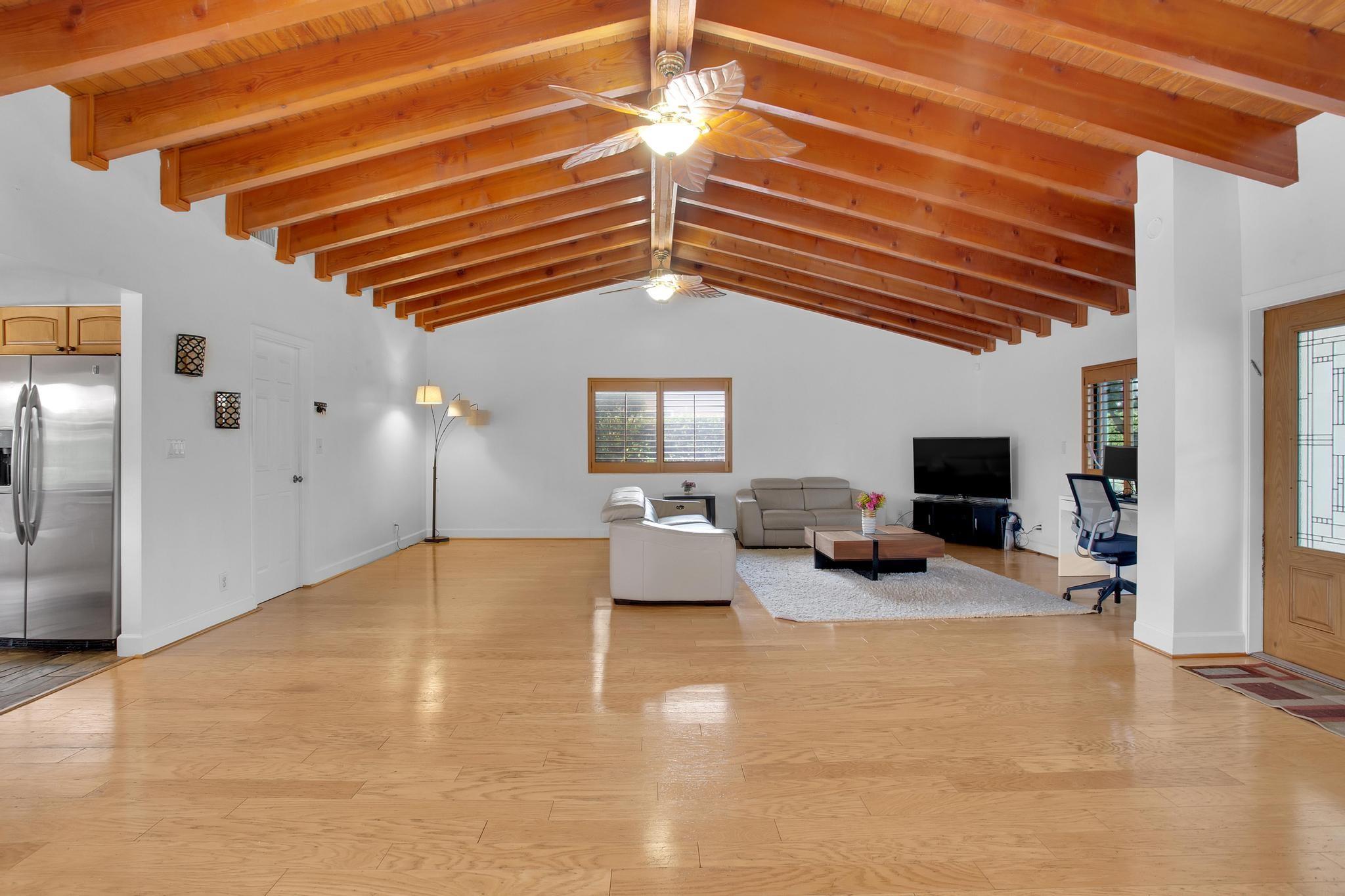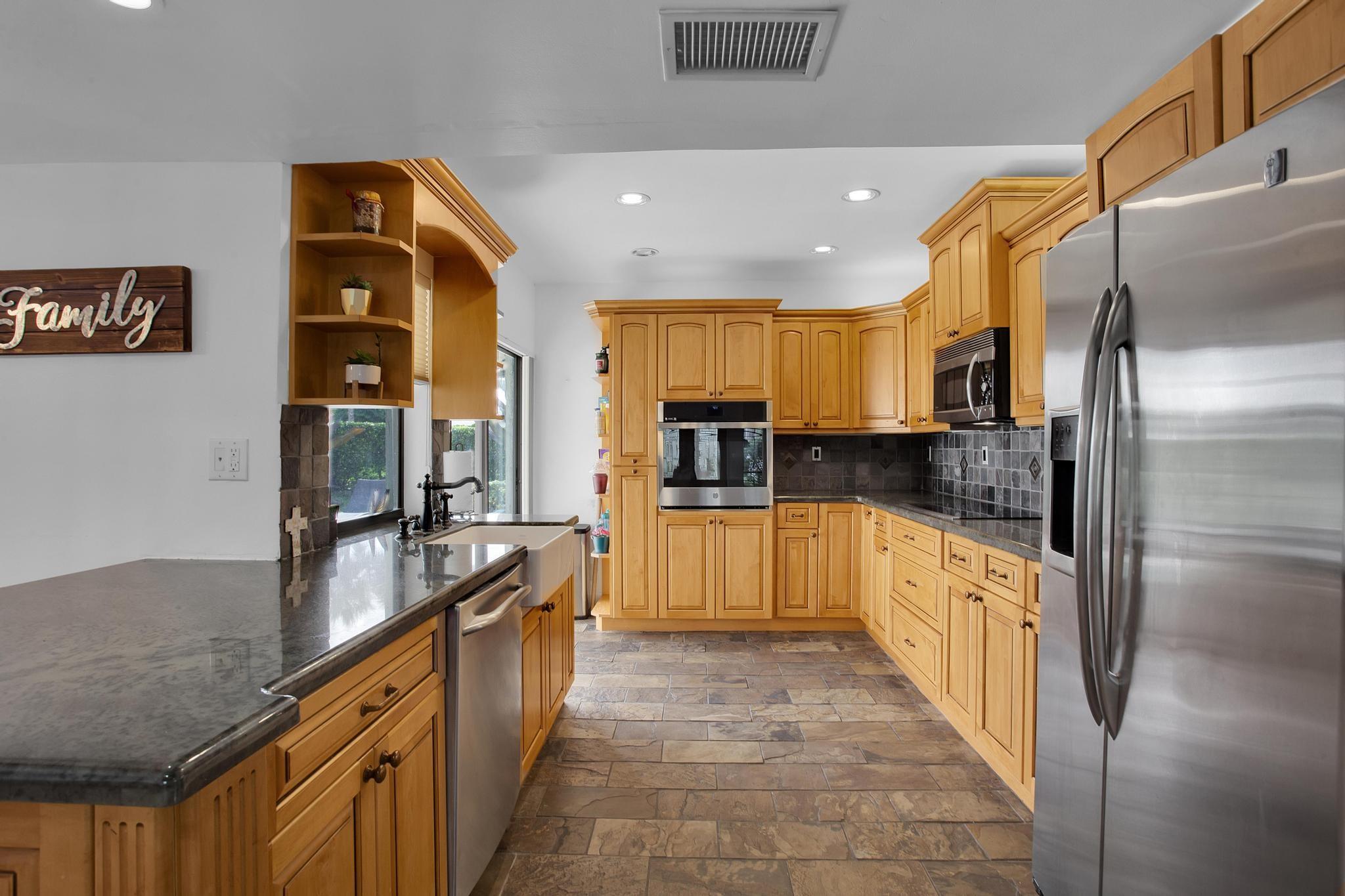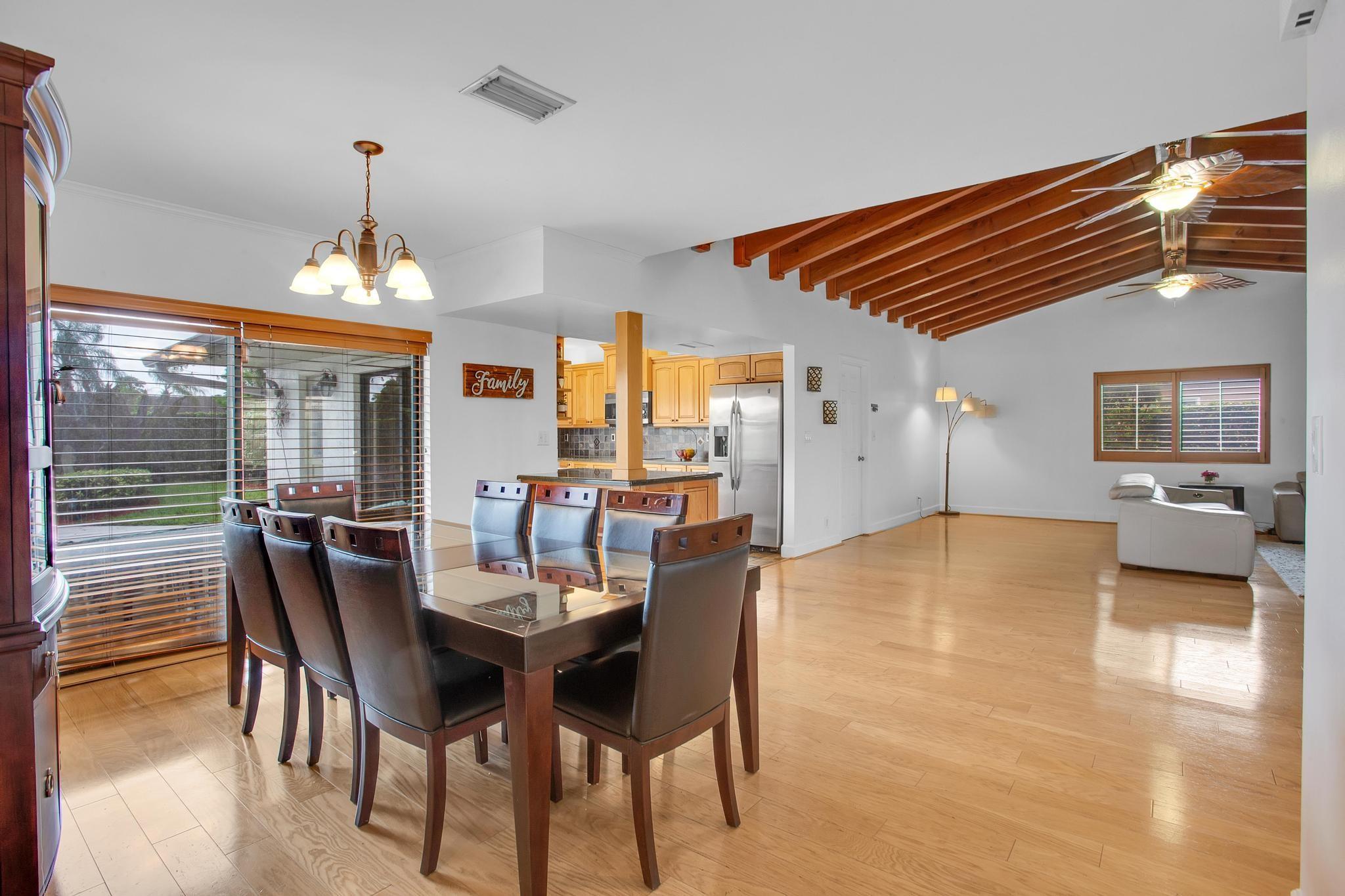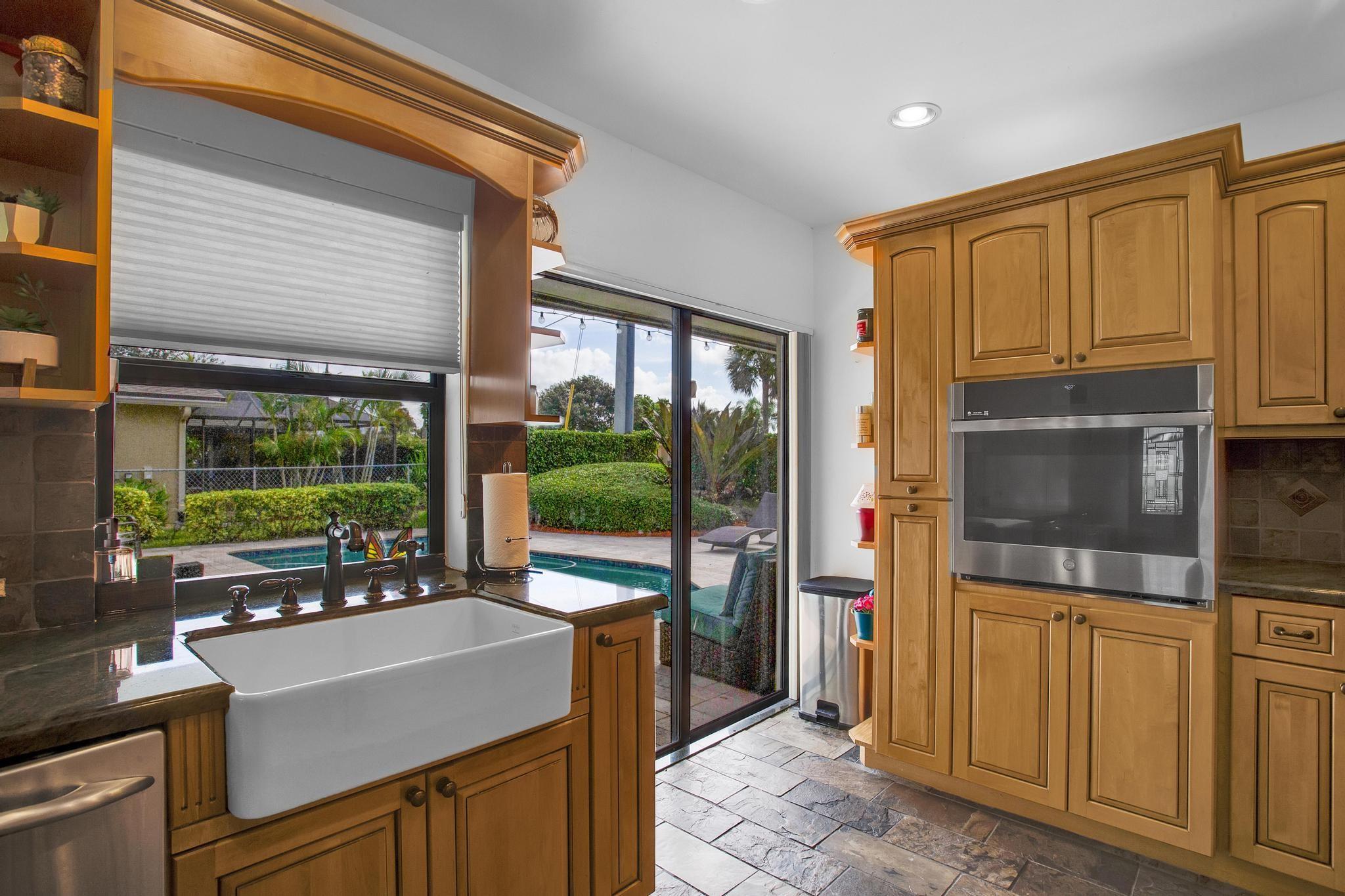 This beautifully designed pool home in Lakeview Homes has timeless features that are hard to come by. This home blends a Mid-20th century ranch-style exterior with contemporary landscaping & pool deck with an open concept floorplan with exposed beam vaulted ceilings. Great curb appeal. Custom double doors with large glass inserts & HVHZ panels. Slate & solid wood flooring throughout. Custom kitchen has real wood cabinetry with soft-close drawers, luxurious beveled edge granite countertops, stainless steel appliances, cook top, wall oven, country sink... Renovated bathrooms & travertine pool deck. Over 2,400 sq. ft. with an oversized garage. No HOA. Walk to schools & a nature park with tot lot. Good location close to everything. Too many details to write here. Call now before it is gone