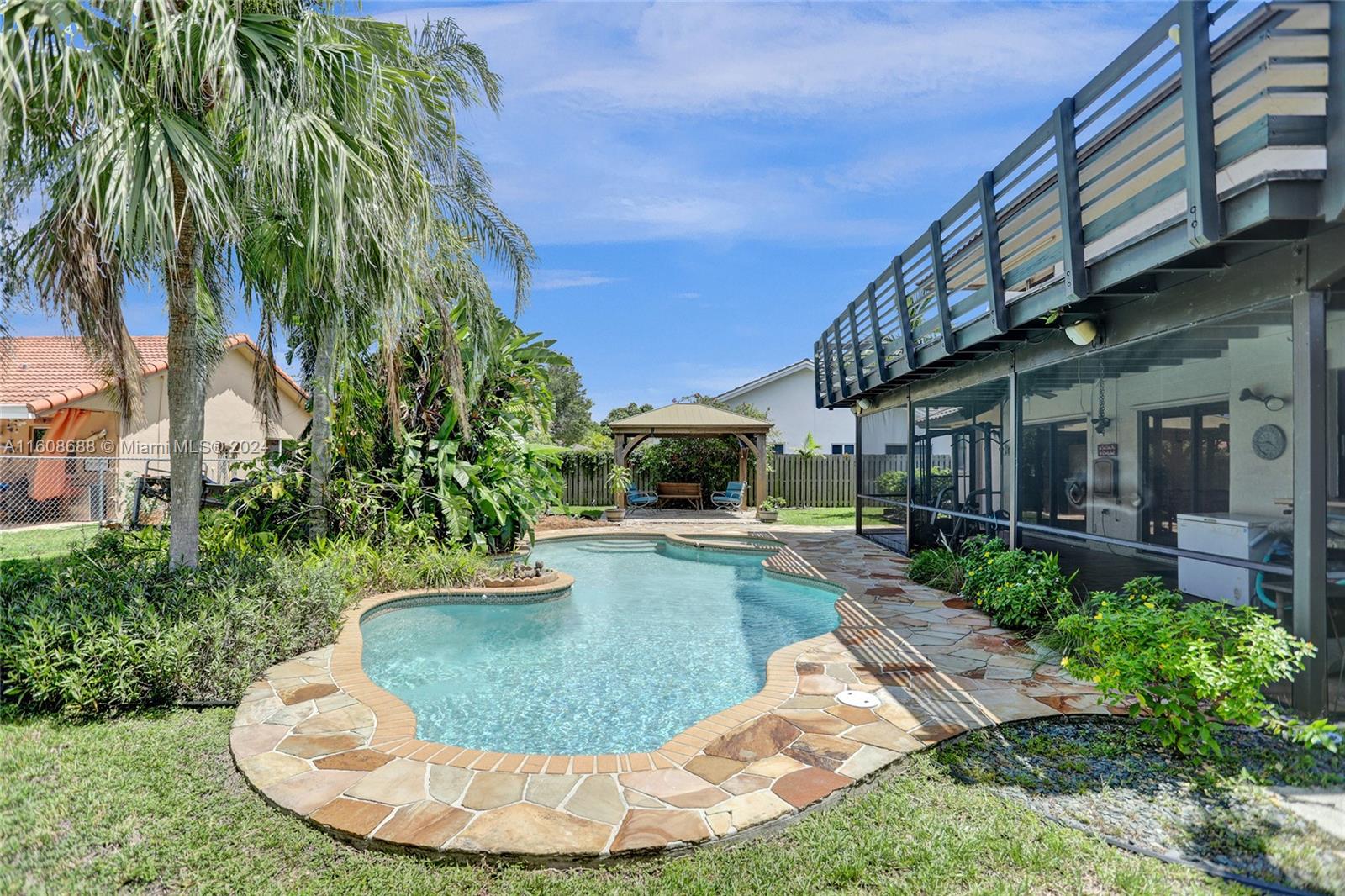 THIS CENTRALLY LOCATED HOME IN DAVIE WAS MADE FOR FAMILY FUN & ENTERTAINING! YOU'LL LOVE THE POOL & SPA, AS WELL AS RELAXING IN THE GAZEBO, OR THE SCREENED-IN PATIO! THE YARD IS FULLY FENCED, SO YOUR "LITTLES" & PETS CAN SAFELY RUN & PLAY. THIS HOME FEATURES A HUGE PRIMARY BEDROOM WITH 2 LARGE WALK-IN CLOSETS & A BALCONY THAT OVERLOOKS THE POOL & YARD. ALL 3 BEDROOMS ARE UPSTAIRS. THERE ARE 3 FULL BATHROOMS -- A CABANA BATH W/ A SHOWER DOWNSTAIRS, A HALF BATH FOR GUESTS DOWNSTAIRS & 2 FULL BATHROOMS UPSTAIRS. THE KITCHEN & BREAKFAST NOOK ARE SPACIOUS & THE FAMILY ROOM FEATURES A TRUE FIREPLACE -- GREAT FOR MAKING SMORES! THE ROOF IS A DECRA STONE-COATED METAL ROOF. THESE ROOFS LAST 50 YEARS! CLOSE TO A-RATED SCHOOLS, PARKS, WORLD-CLASS SHOPPING, RESTAURANTS, & ALL MAJOR HIGHWAYS.