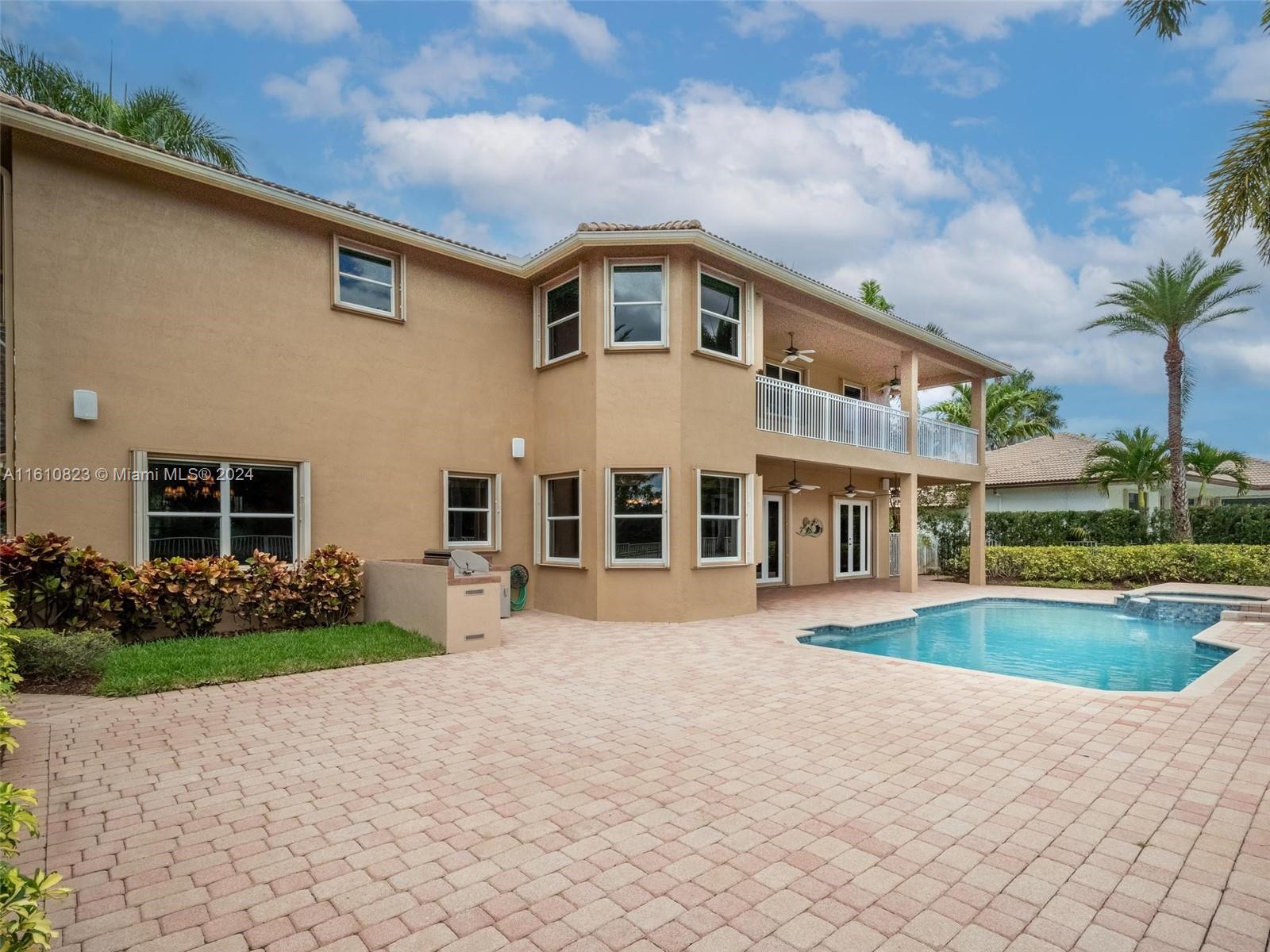Highly sought after Sanibel model in Weston Hills Country Club. This spacious home boasts 5,365sf of living space on a 15,453sf waterfront lot. With 5 bedrooms, 5.5 bathrooms, plus an office/bonus room with wet bar/loft, this property offers ample space for comfortable living. The home features a 3-car garage, separate in-law suite with an independent entrance, and Accordian shutters for added convenience and security. The backyard is perfect for entertaining, w/ a newly renovated salt water heated pool, summer kitchen & spacious outdoor area. Inside, you'll find Saturnia marble on the 1st floor, custom moldings, & millwork throughout, adding a touch of elegance to the space. The open kitchen is equipped with granite countertops, walk-in pantry & all the top appliances.