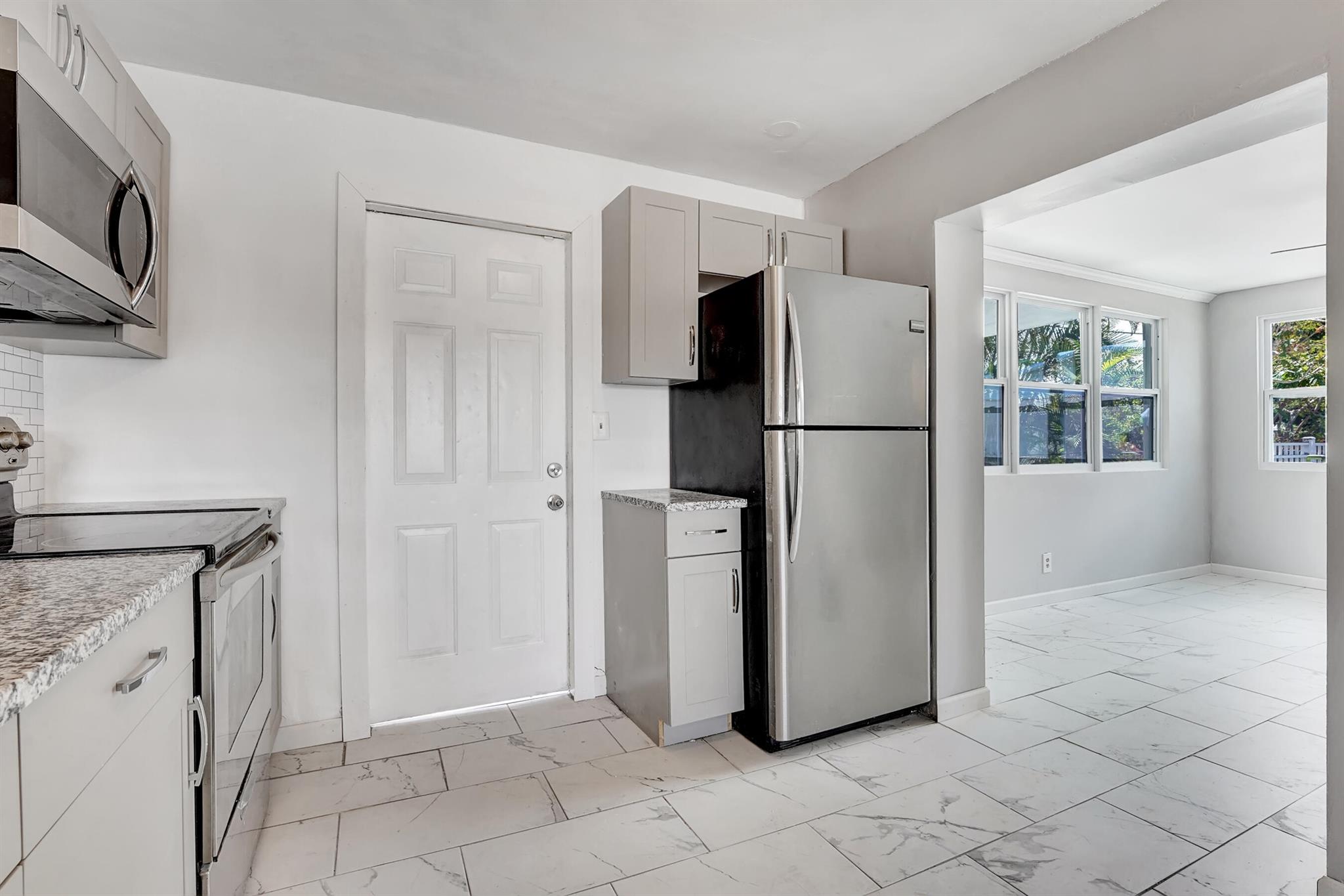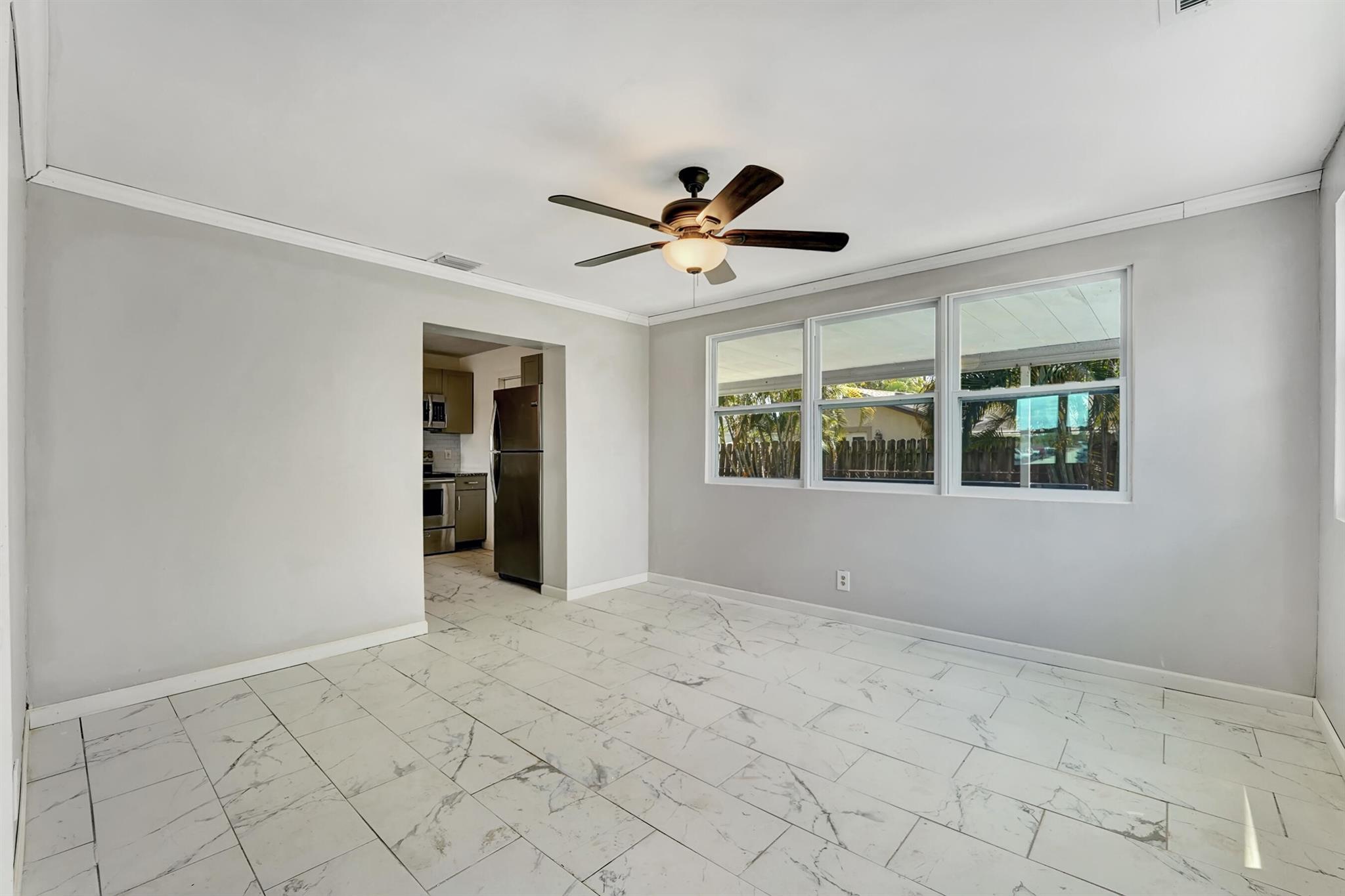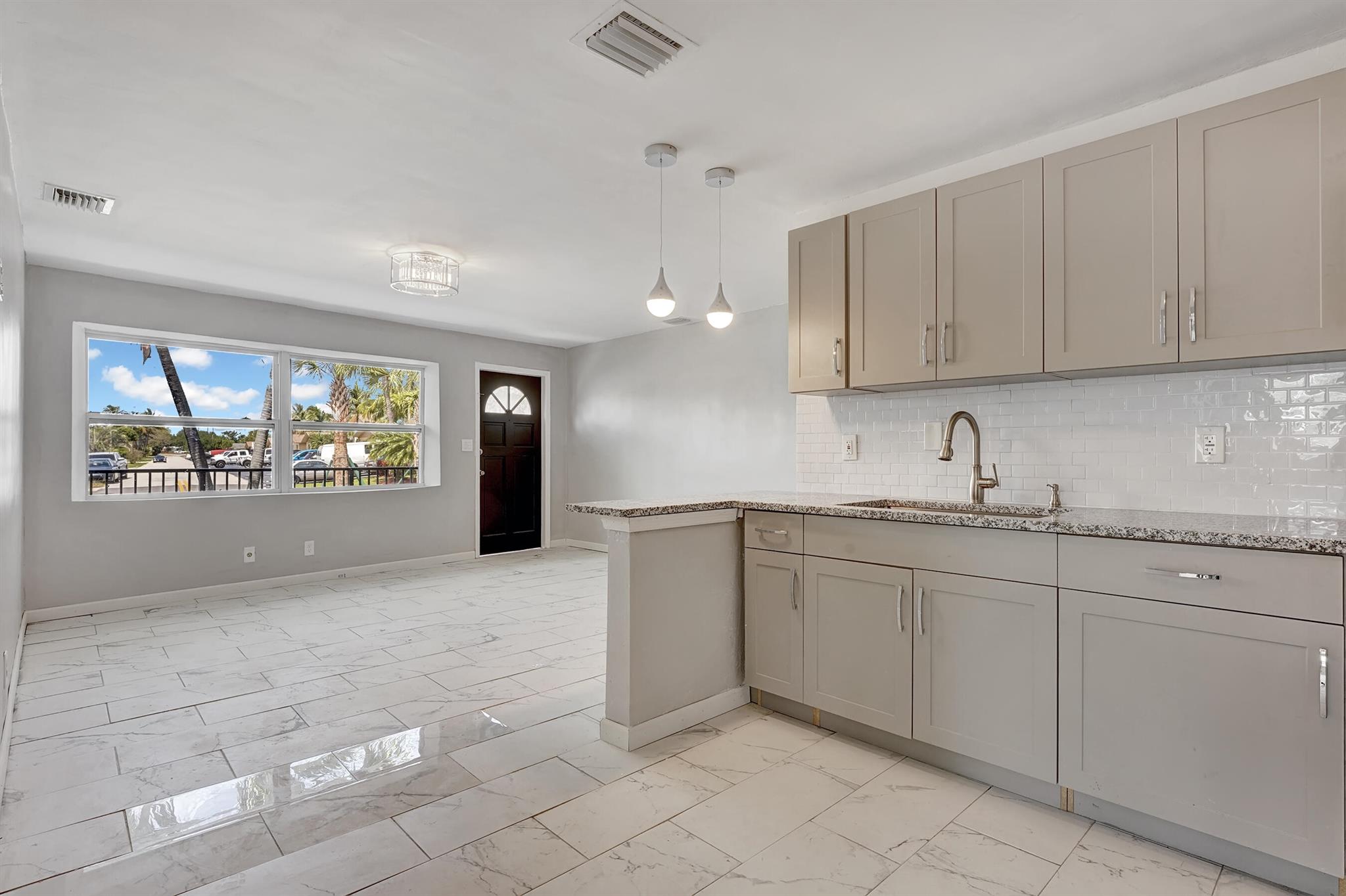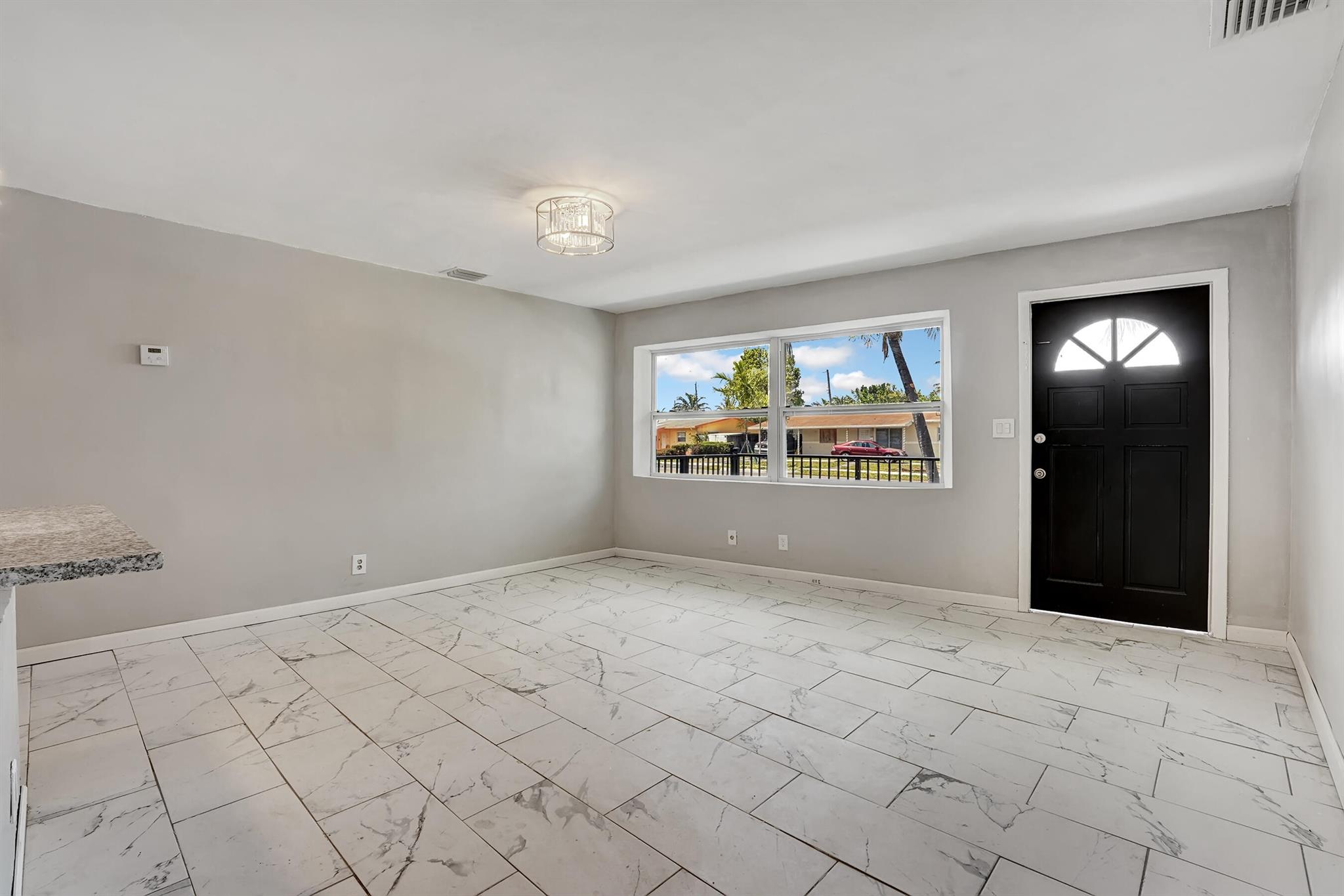 Discover the charm of this renovated home in a no-HOA neighborhood of Pompano Beach. The property features extensive upgrades, including porcelain tile flooring, new baseboards, a new roof (2022), updated AC and ductwork, and a tankless water heater. With impact glass on all but one window, you can enjoy added storm protection and peace of mind. The spacious kitchen boasts gray Shaker-style cabinetry, a subway tile backsplash, an under-counter sink, granite countertops, and stainless steel appliances. The owner's suite offers ample closet space and an en suite bath. Step outside to a fenced backyard featuring both open and covered terraces, ideal for outdoor seating, grilling, dining, and more. The expansive driveway provides plenty of room for boat or RV.