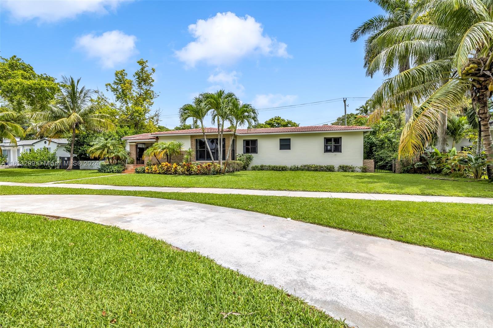 A true 1950's Miami Shores Mid Century Modern home that's been completely updated. Courtyard-front porch entrance brings you into an open concept space with windows on every wall that brightens the living room, dining room combination. Gleaming hardwood flooring throughout. The large Florida room has terrazzo floors and more windows that show off your impressive 10,200 square foot lushly landscaped yard. The modern kitchen has granite counter tops and white tile backsplash with shiny European cabinetry. The shared bathroom has an expanded shower, gorgeous tiles and a double vanity. There is a full bath in the garage, which could easily become a large primary bedroom. All updates have been made; electrical, HVAC, roof, plumbing, impact windows and doors. Walkable to downtown Miami Shores.