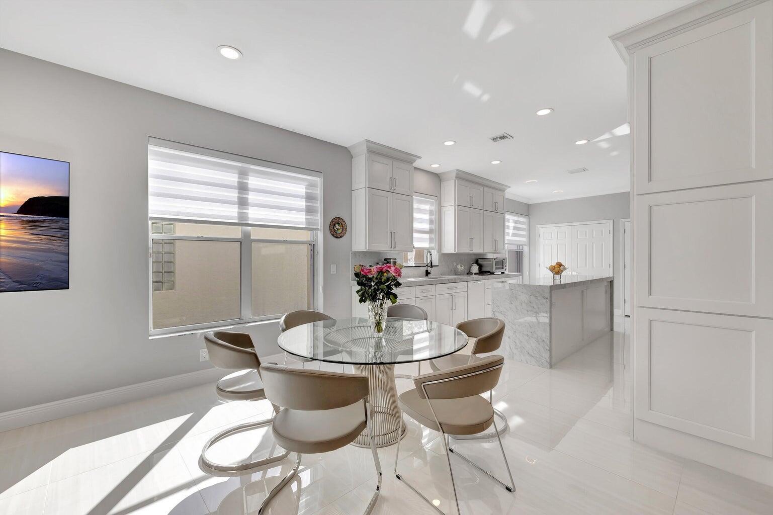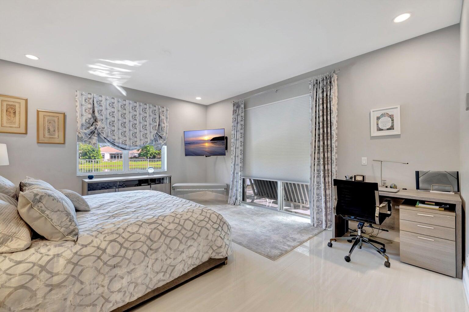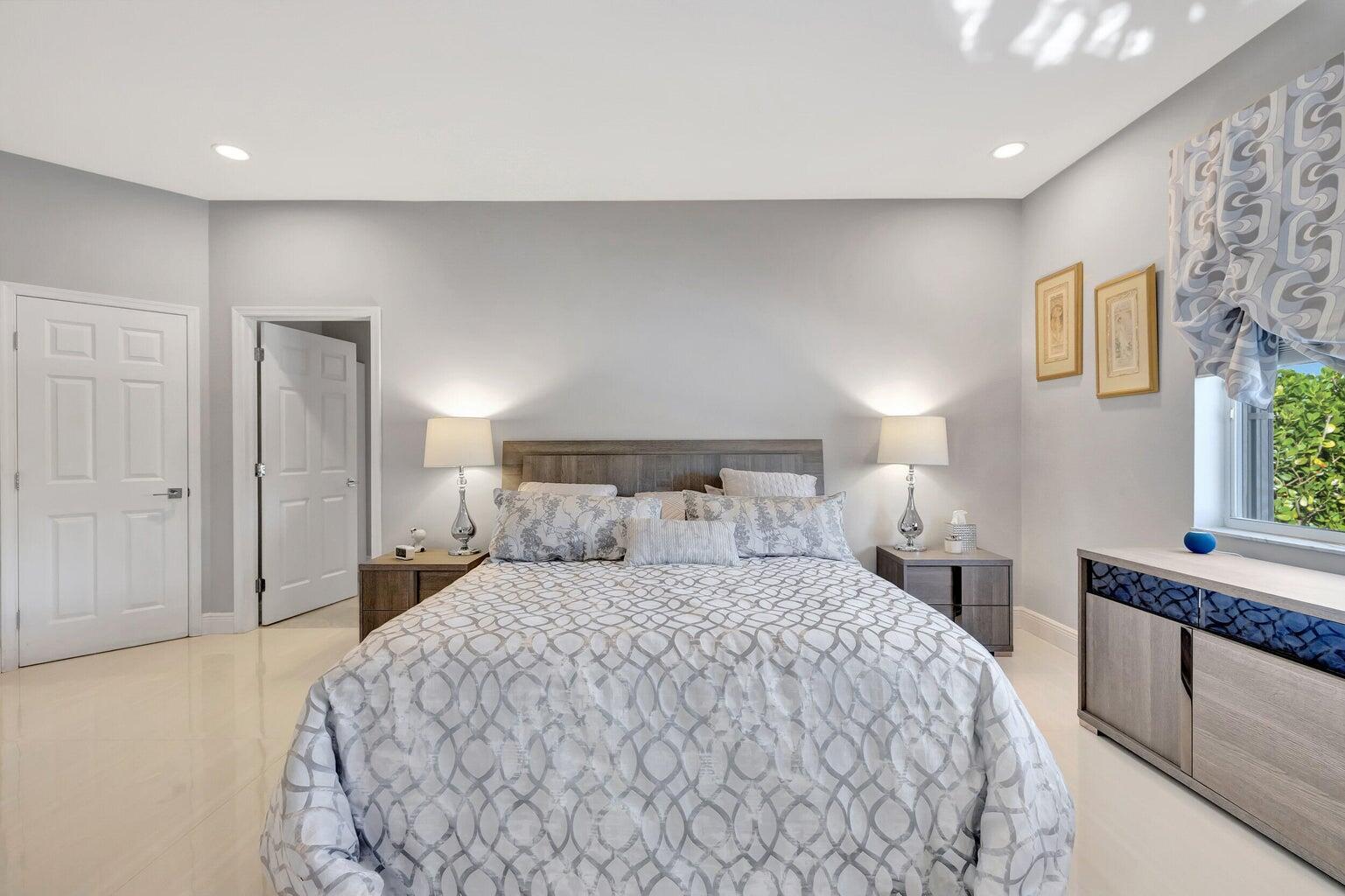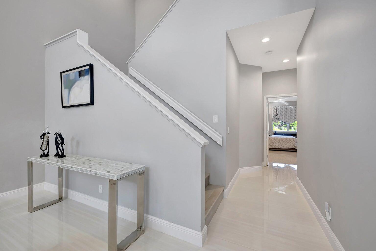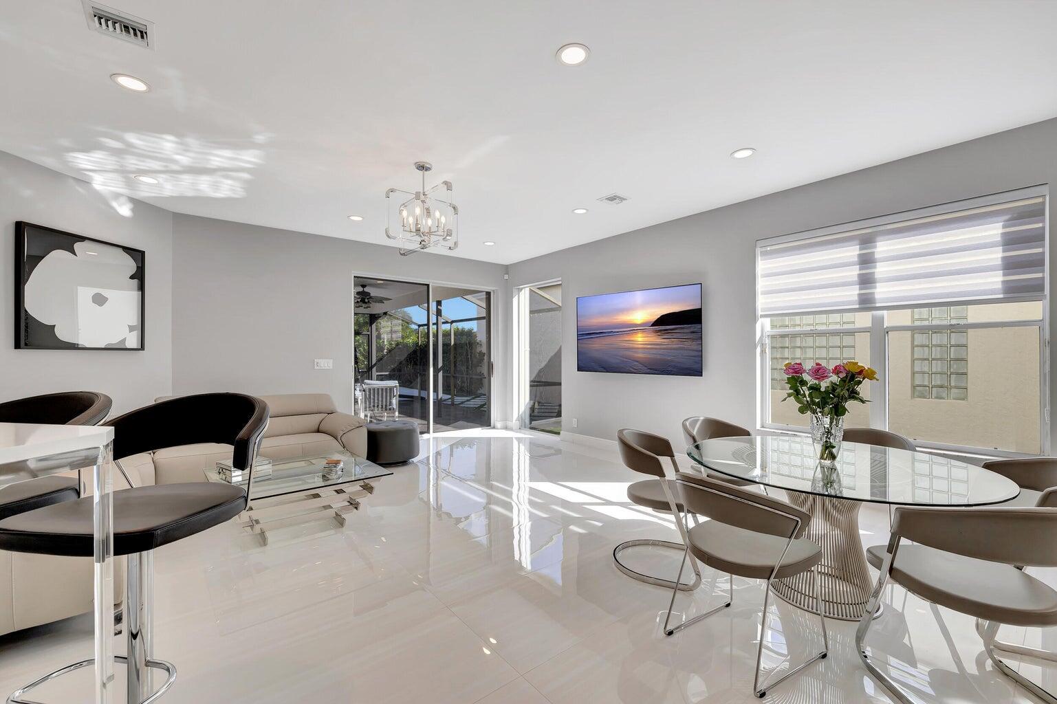 Welcome to this exquisite, renovated contemporary two-story home in the prestigious Broken Sound Club. Encompassing over 3,000 square feet, this residence epitomizes modern luxury and sophistication. The primary bedroom is thoughtfully located on the ground floor, offering convenience and privacy. Inside, you'll find stunning porcelain tile floors and soaring volume ceilings that enhance the home's spacious and airy feel. The gourmet kitchen is a chef's dream, featuring a waterfall center island and elegant marble countertops. The screened-in patio is perfect for outdoor living, complete with a private pool and picturesque lake views, creating a serene retreat for relaxation and entertainment. This home beautifully combines stylish design with functional living spaces, making it an