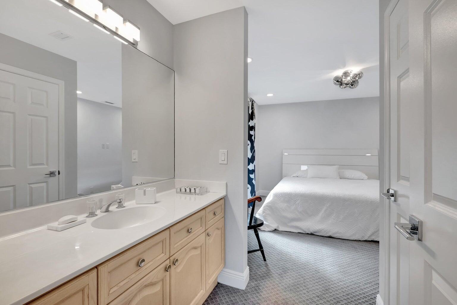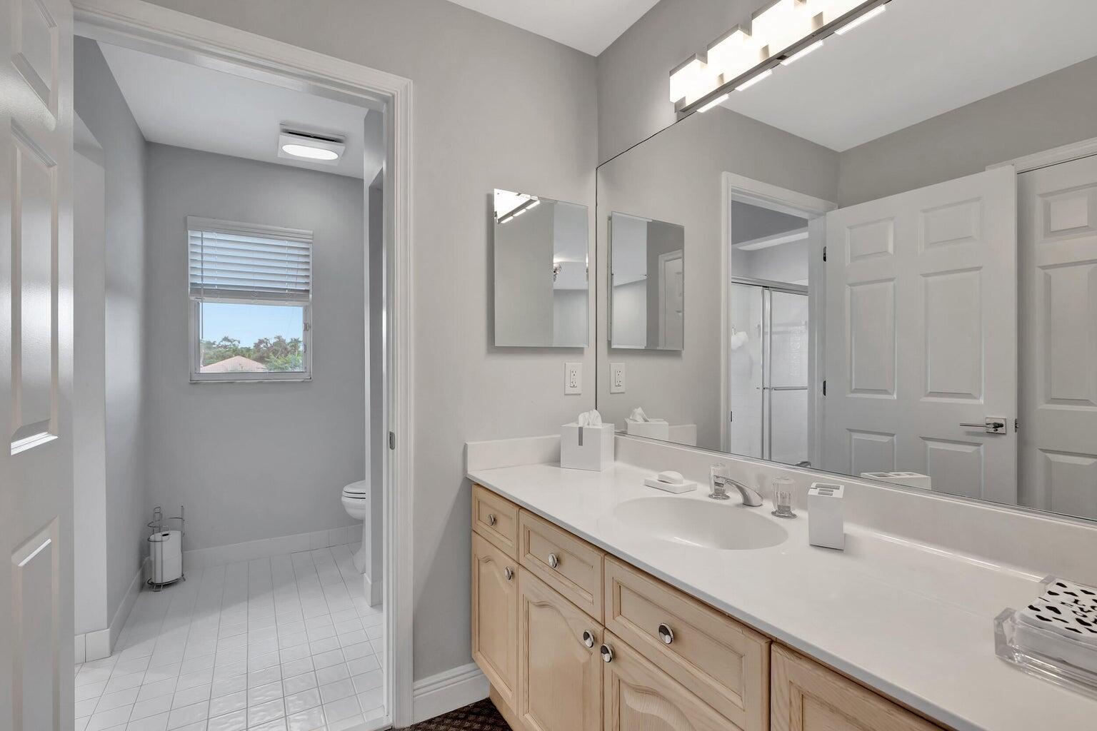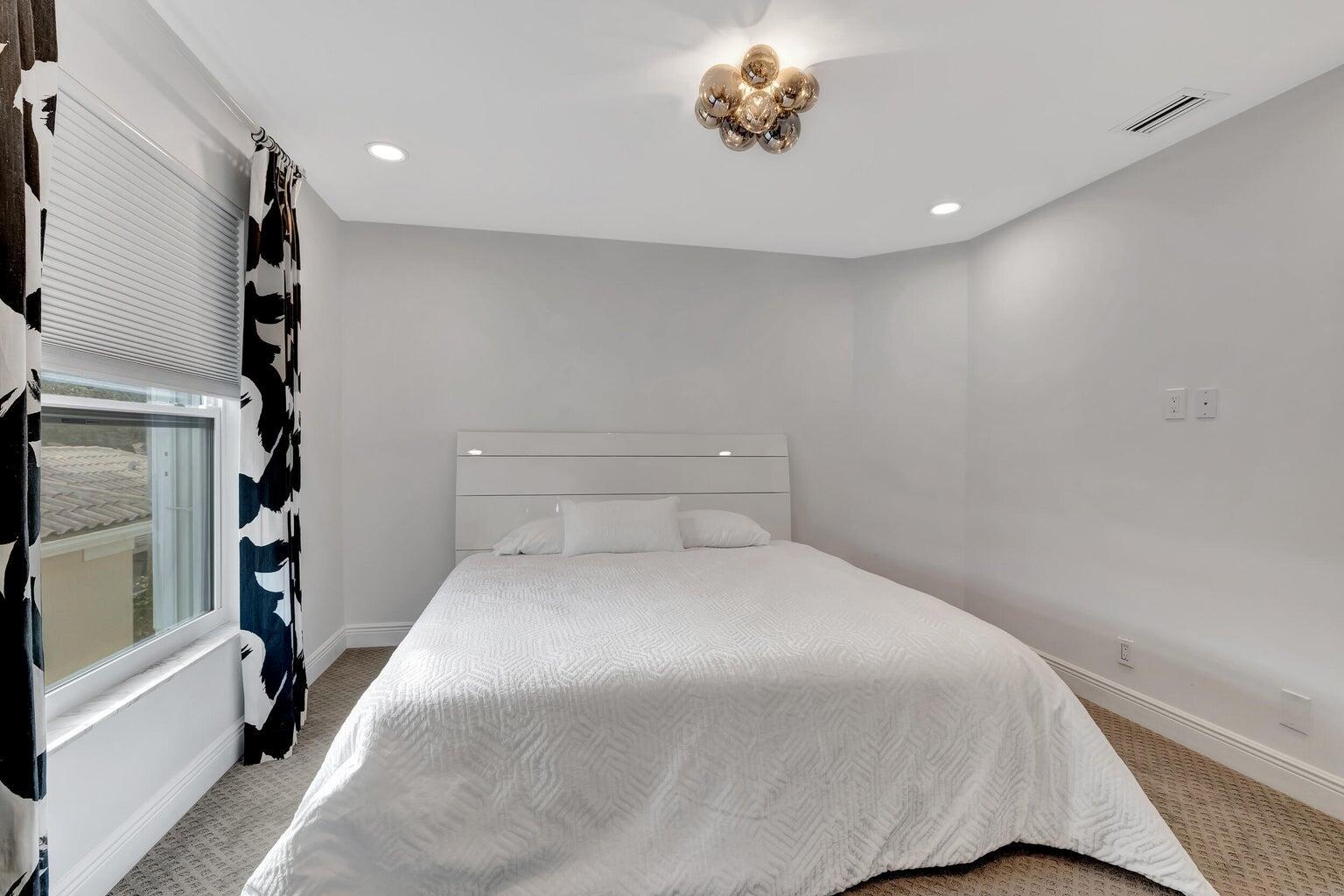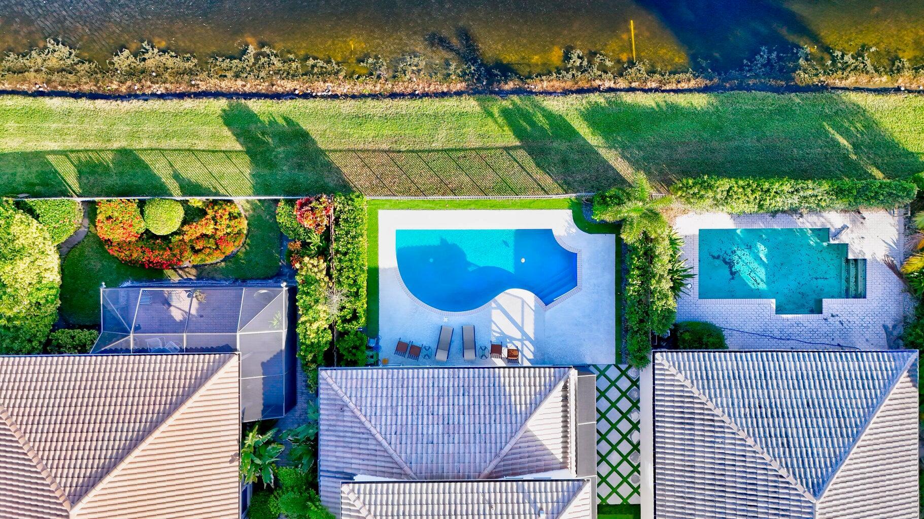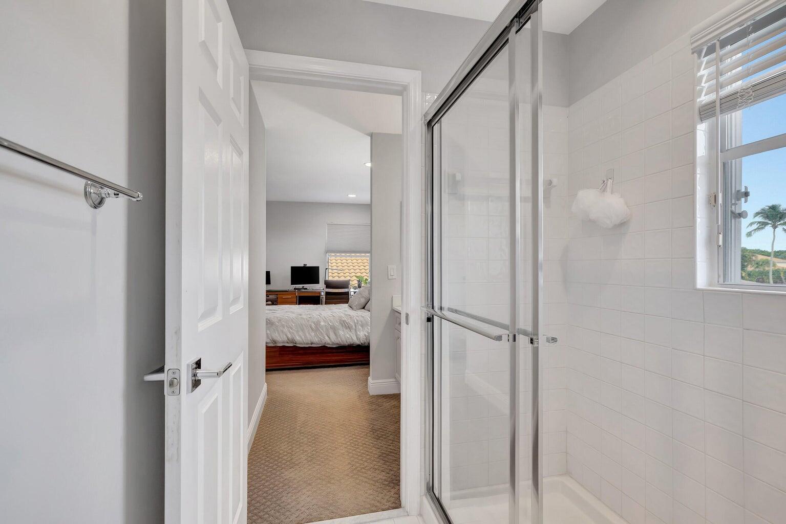Welcome to this exquisite, renovated contemporary two-story home in the prestigious Broken Sound Club. Encompassing over 3,000 square feet, this residence epitomizes modern luxury and sophistication. The primary bedroom is thoughtfully located on the ground floor, offering convenience and privacy. Inside, you'll find stunning porcelain tile floors and soaring volume ceilings that enhance the home's spacious and airy feel. The gourmet kitchen is a chef's dream, featuring a waterfall center island and elegant marble countertops. The screened-in patio is perfect for outdoor living, complete with a private pool and picturesque lake views, creating a serene retreat for relaxation and entertainment. This home beautifully combines stylish design with functional living spaces, making it an