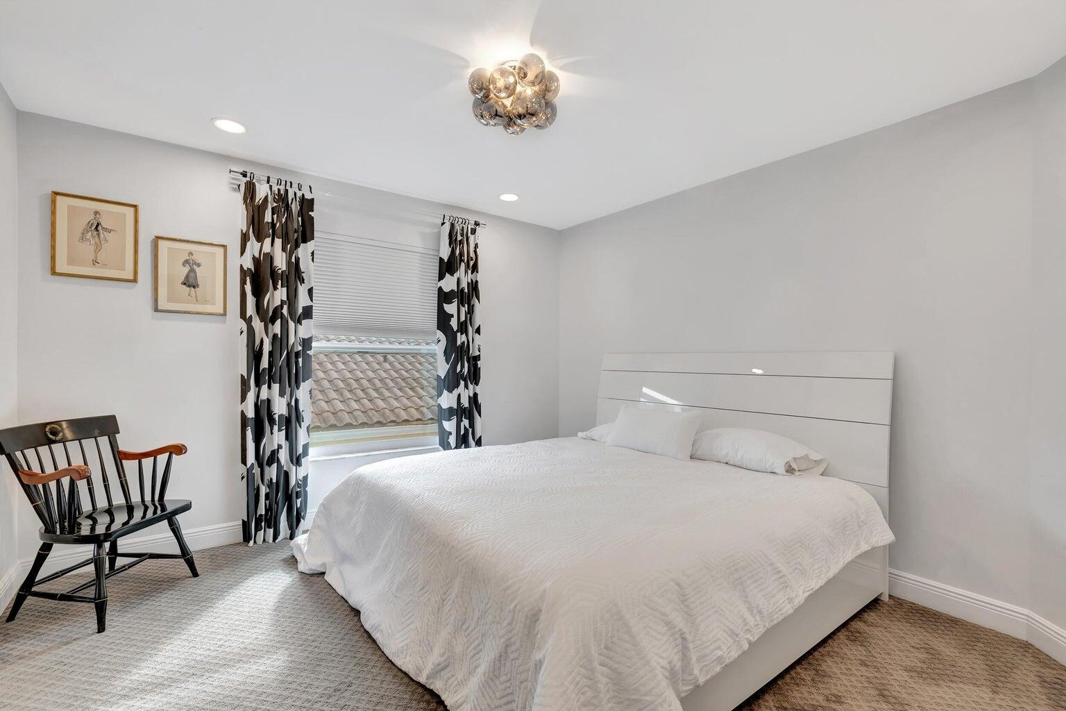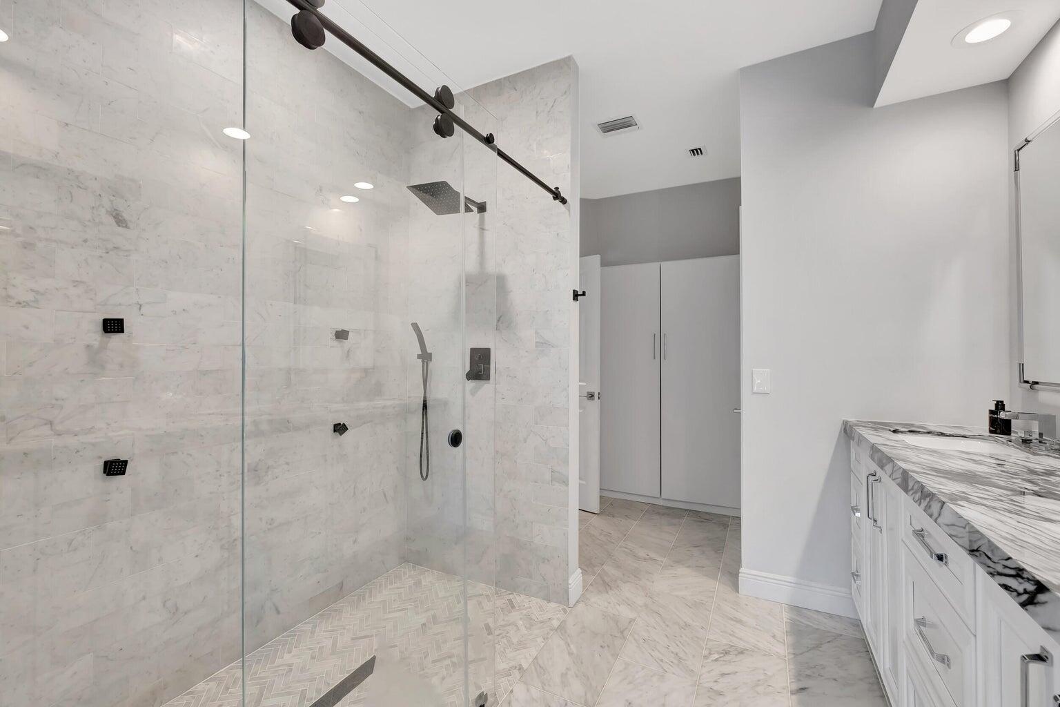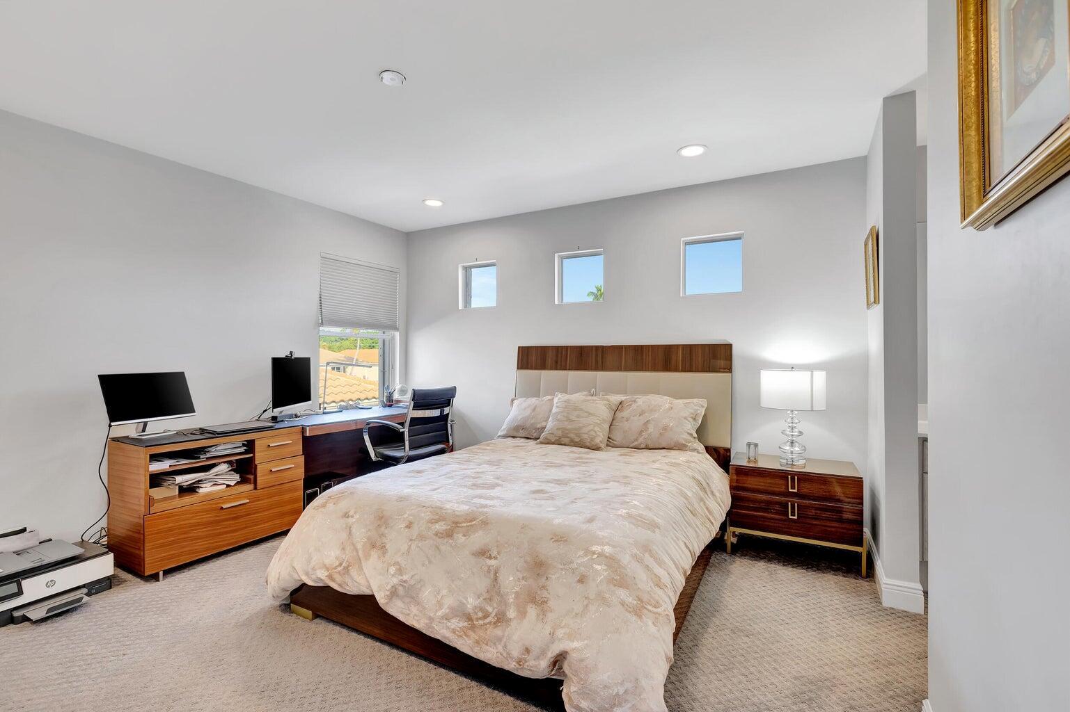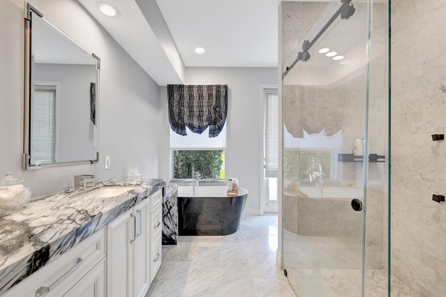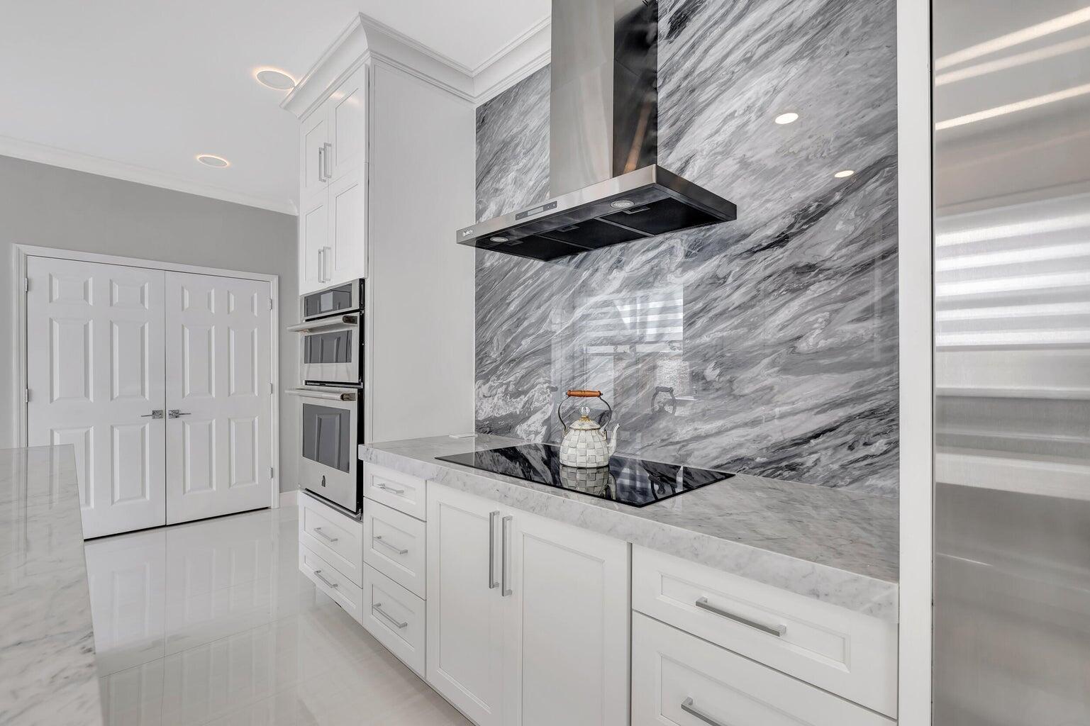 Welcome to this exquisite, renovated contemporary two-story home in the prestigious Broken Sound Club. Encompassing over 3,000 square feet, this residence epitomizes modern luxury and sophistication. The primary bedroom is thoughtfully located on the ground floor, offering convenience and privacy. Inside, you'll find stunning porcelain tile floors and soaring volume ceilings that enhance the home's spacious and airy feel. The gourmet kitchen is a chef's dream, featuring a waterfall center island and elegant marble countertops. The screened-in patio is perfect for outdoor living, complete with a private pool and picturesque lake views, creating a serene retreat for relaxation and entertainment. This home beautifully combines stylish design with functional living spaces, making it an