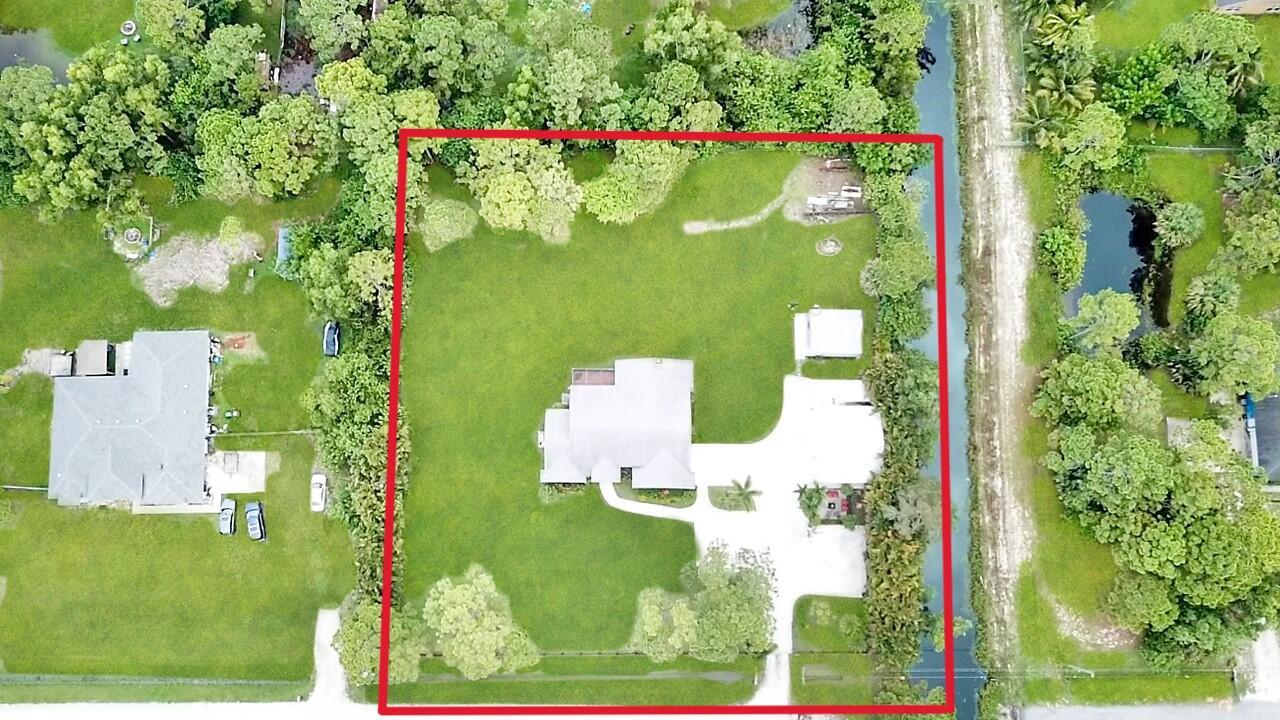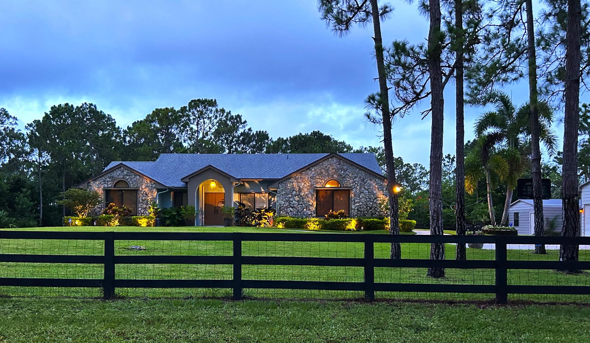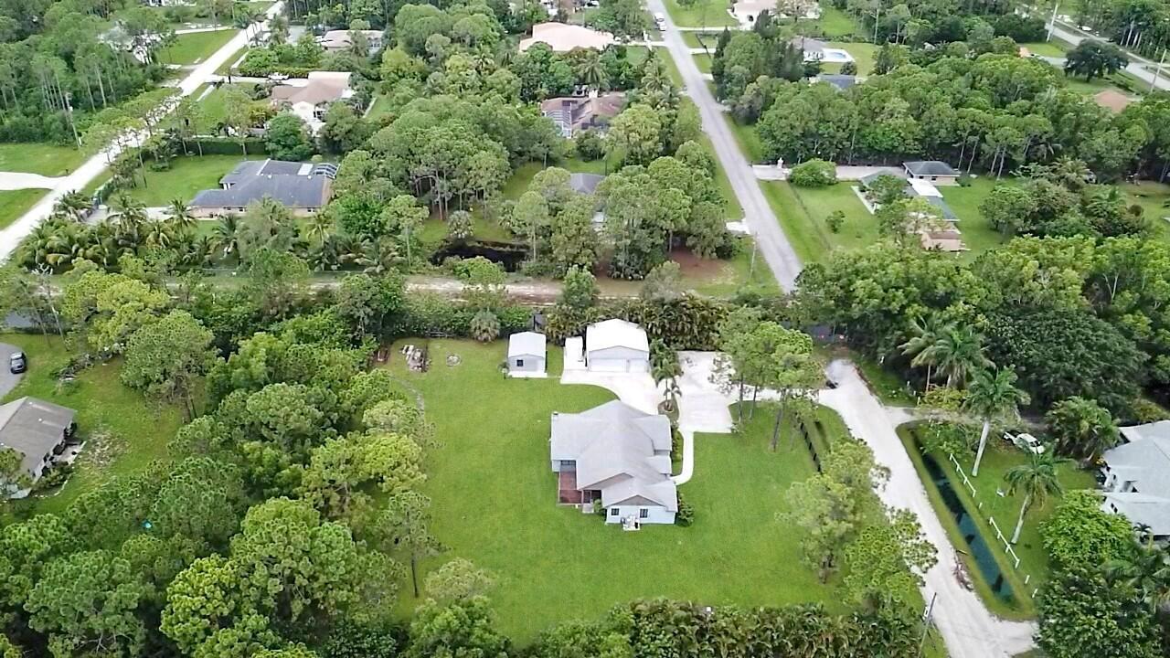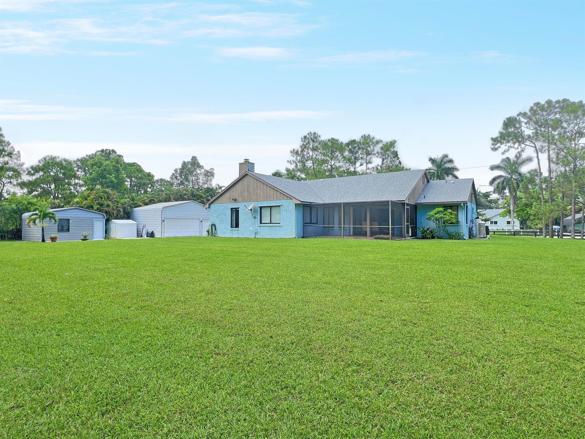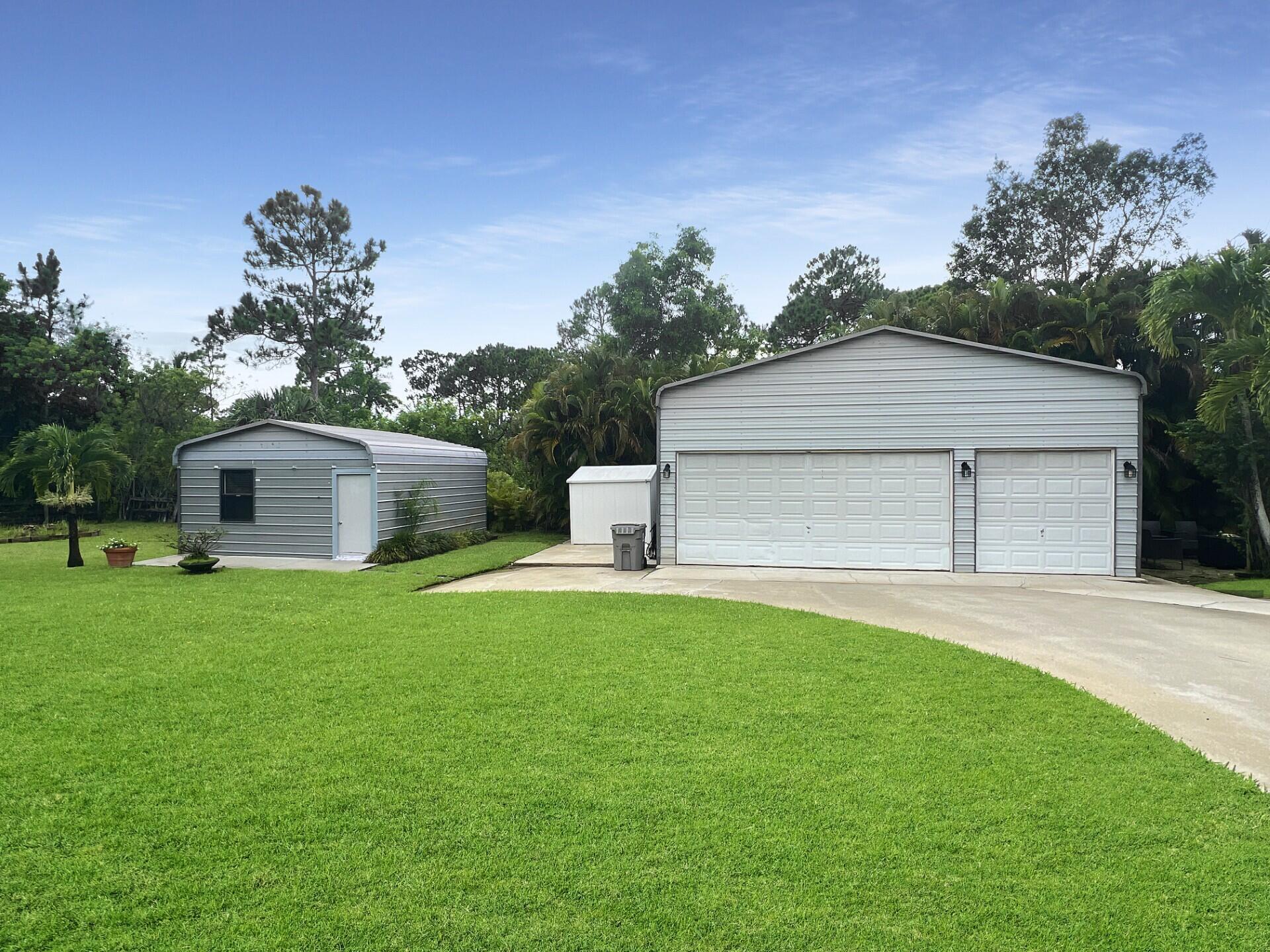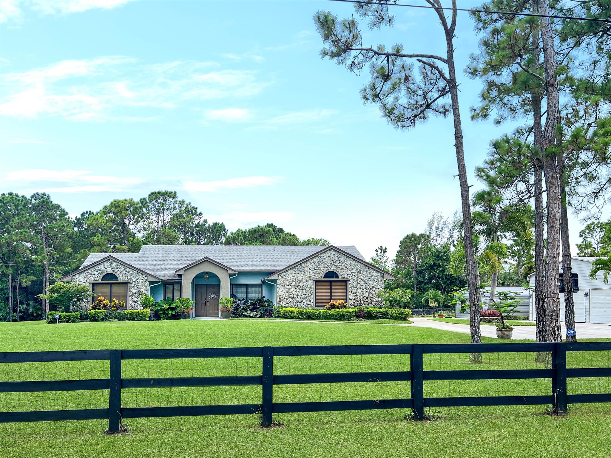 Nestled in the sought-after most eastern community of the Acreage, this meticulously landscaped 3-bedroom, 2-bathroom home with 3 car detached garage and detached game room/man cave spans a generous 1.31-acre lot. NEW in 2021: roof and blown-in insulation, hurricane impact windows throughout and water softener system. New laminate floor throughout. Updated bathrooms. His and her main custom closets. House generator hook up. Wood burning fireplace. Irrigation, fully fenced with electric gate. Huge fully paved driveway, perfect for hobbyists or small business owners. An attached two-car garage offers additional parking and storage solutions. Inside, enjoy a spacious formal living room flowing into an open-concept kitchen, breakfast nook. Outside, a screened-in covered patio.