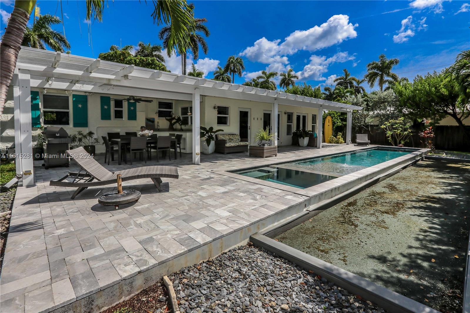 Welcome to Sunshine Cottage in Hollywood Lakes!One of the most exclusive locations in Hollywood Lakes with wide streets, royal palms, and antique lighting.This home has an open-concept kitchen, lots of cabinet space, a big cooking Island with a farmer's sink, breakfast area, stainless steel appliances, a gas stove, a custom-made eating area, and a beautiful view of the pool through double doors.Vaulted ceilings, exposed wood beams, and fireplace. The primary bedroom features an open space together with a bath featuring a double sink, lots of storage cabinets, and a spacious shower with a frameless glass door. Impact windows and doors throughout! Beautiful saltwater pool, Spa, and outside shower. Cover Patio Features dining and seating area w/ outside kitchen to enjoy the outdoors living!