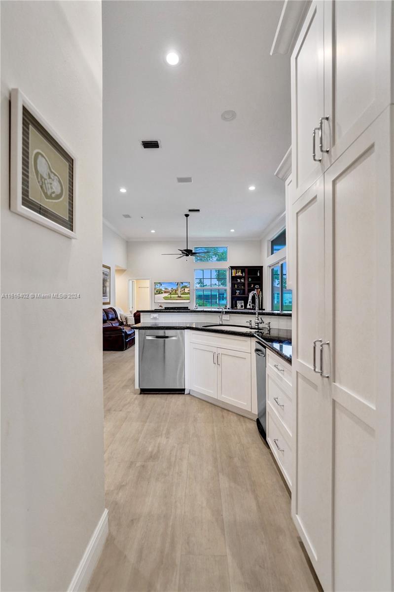 Tucked on a royal palm tree-lined street, this custom one-story home in Weston Hills CC offers modern comfort & elegance. Featuring a brand-new roof (2024) & full-impact doors/windows. Crown molding & luxury vinyl flooring throughout the main living areas. 4 spacious bedrooms, 3.5 bathrooms + a den, family room, & a sitting area in the master bedroom. Kitchen features upgraded stainless steel appliances, trash compactor & 3 ovens including an Advantium microwave that doubles as an oven. Additional features include a custom linen closet in the master bathroom along with a cabana bath, LED high-hats, oversized screened patio, & murphy bed. The garage includes built-in metal wall unit with drawers & cabinets. Gorgeous lake views from your private patio and ample space for a pool.