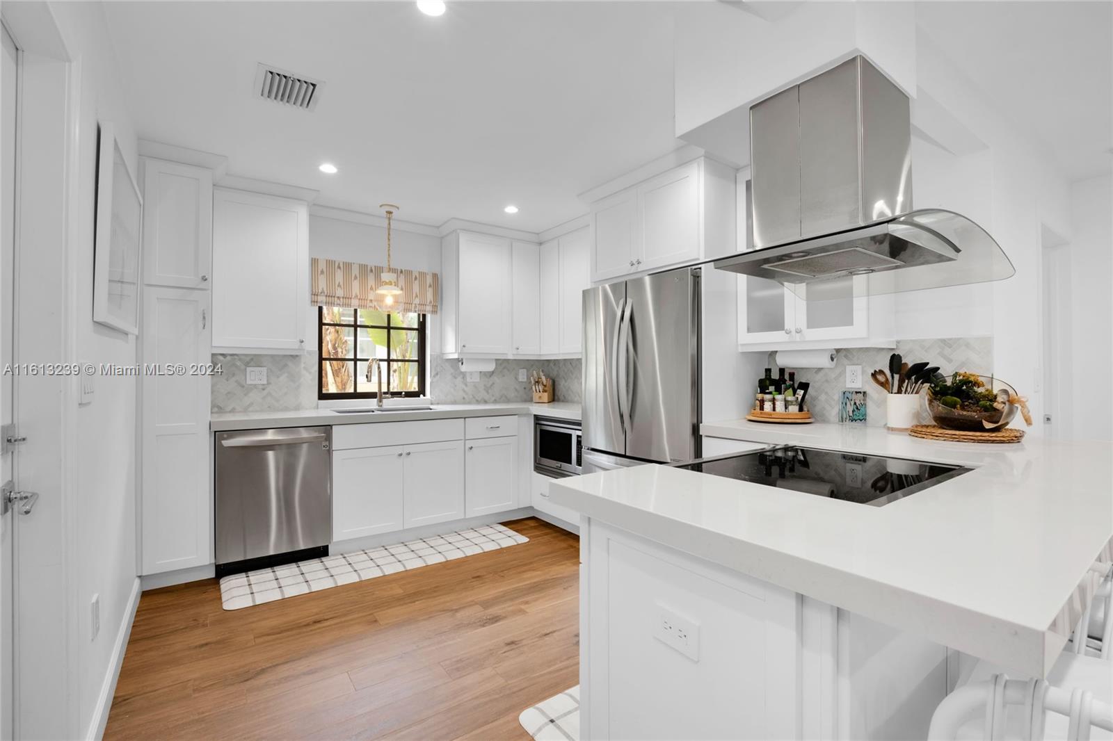 Located on a quiet, beautiful tree-lined street in North Gables, this home was recently remodeled to perfection with a bright open floor plan, boasting gorgeous wood flooring, stunning kitchen with marble counters and high-end appliances. Featuring 3 well proportioned bedrooms with ample closet space and 2 remodeled baths, the home has been meticulously maintained inside and out. Lush landscaping in the front and a mature privacy hedge in the backyard create a private, sunny oasis. Additional features are full impact windows/doors, curtains/blinds on all windows, security system, upscale pendant lighting and 1 car attached garage. Only minutes to downtown Coral Gables and airport.