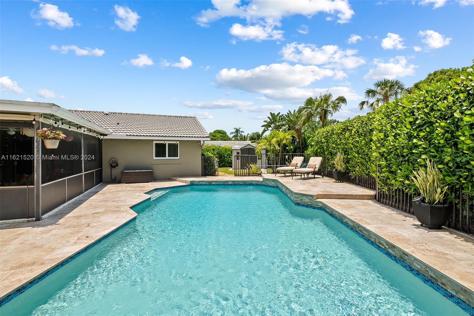 Welcome to 1046 NW 82nd Terrace in the desirable Ramblewood community! This beautifully maintained & rarely available 5 bedroom, 2-bath pool home features a triple-split plan on an oversized corner cul-de-sac lot. Enjoy a manicured oasis with a private, fenced yard, heated saltwater pool, travertine pavers, screened lanai, & landscape lighting for ambiance. Inside, updates include Kitchen Aid appliances, elegant wood floors in living areas, & fresh paint throughout. Bedrooms have new flooring, & baths were redone in 2018/2020. Newer A/C & ductwork (2018), water heater (2016), hurricane impact windows throughout the home, with the expectations of hurricane shutters for the patio sliders. Roof was last replaced 2006. Move-in ready with no HOA—Don’t miss the opportunity to call this one HOME!