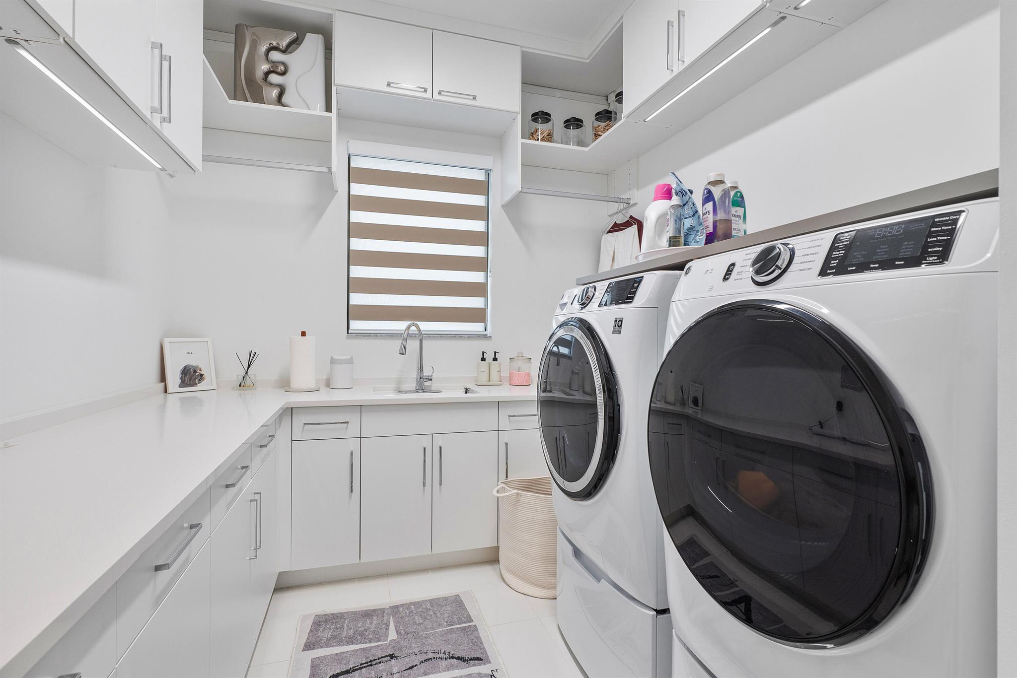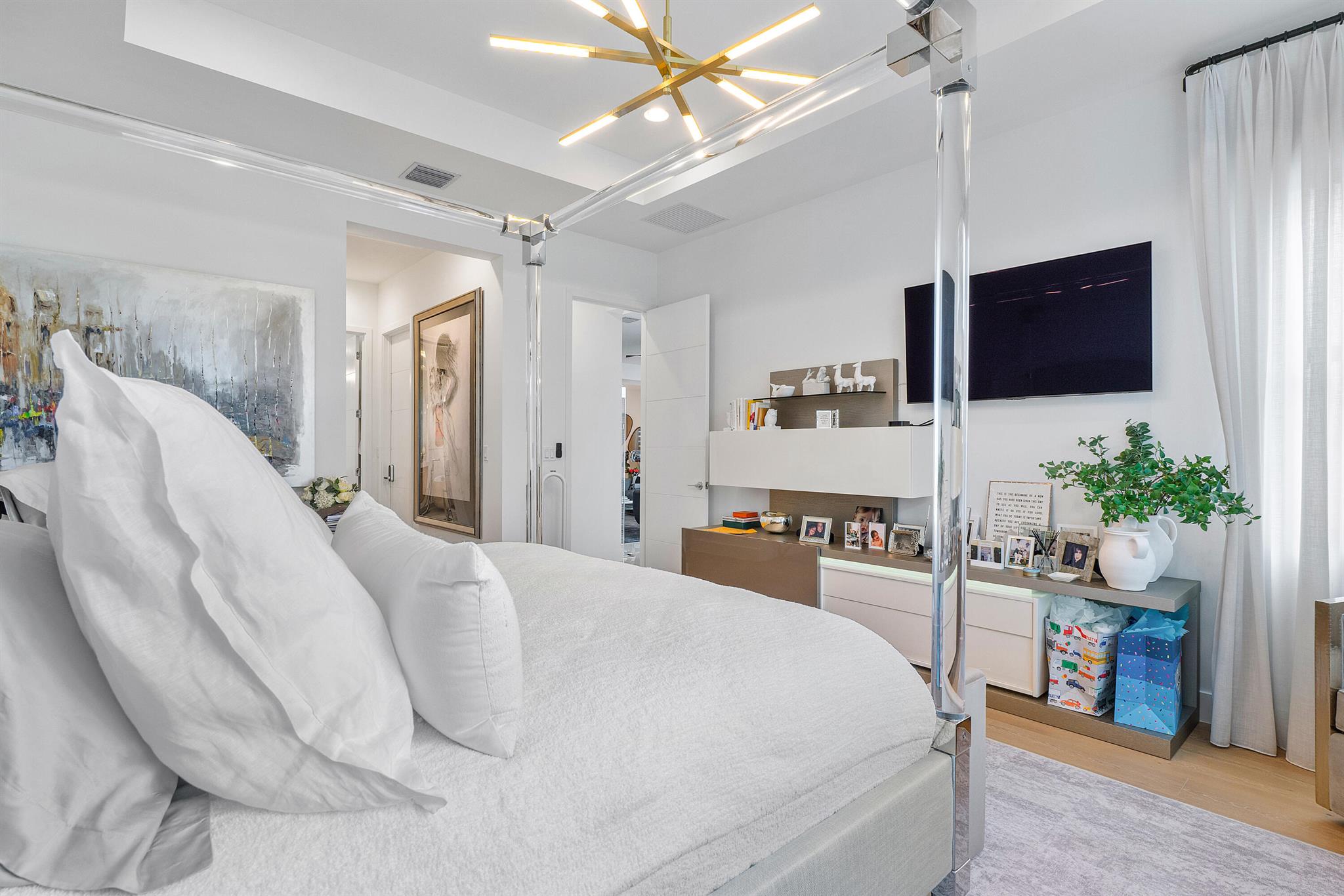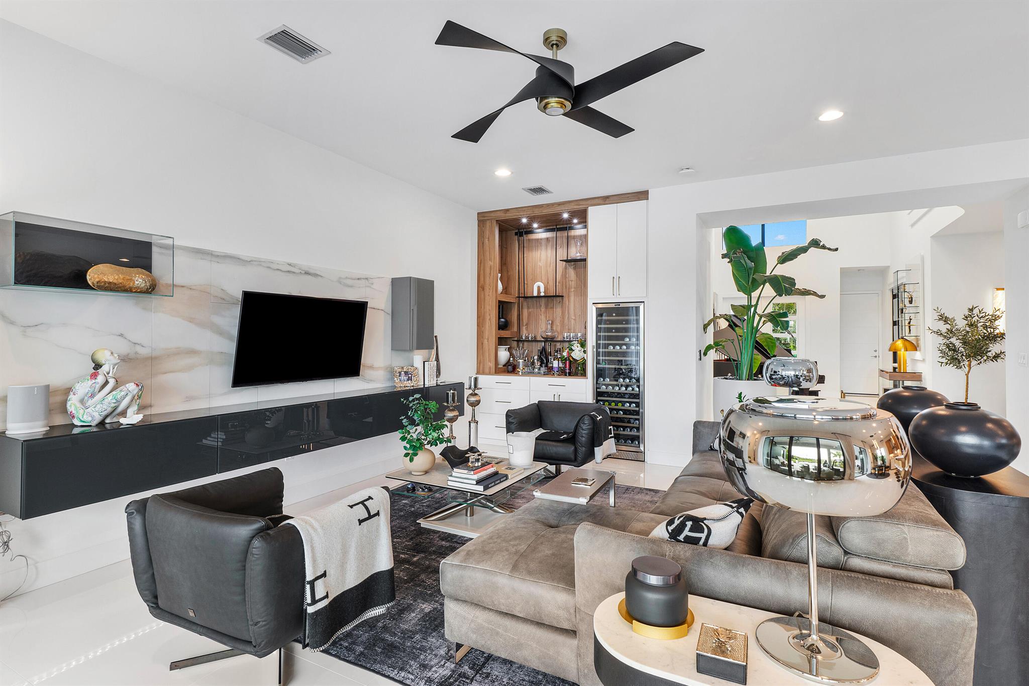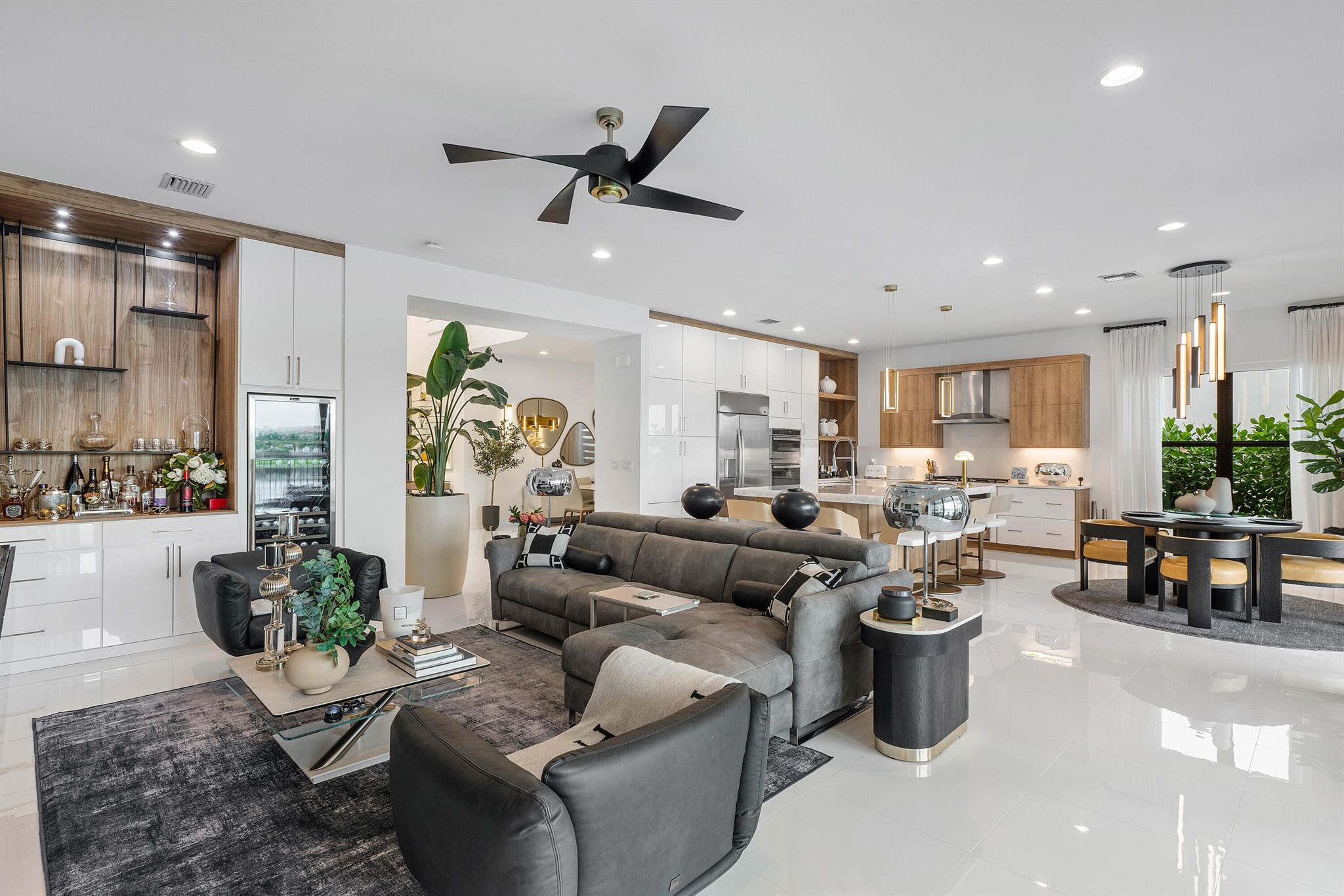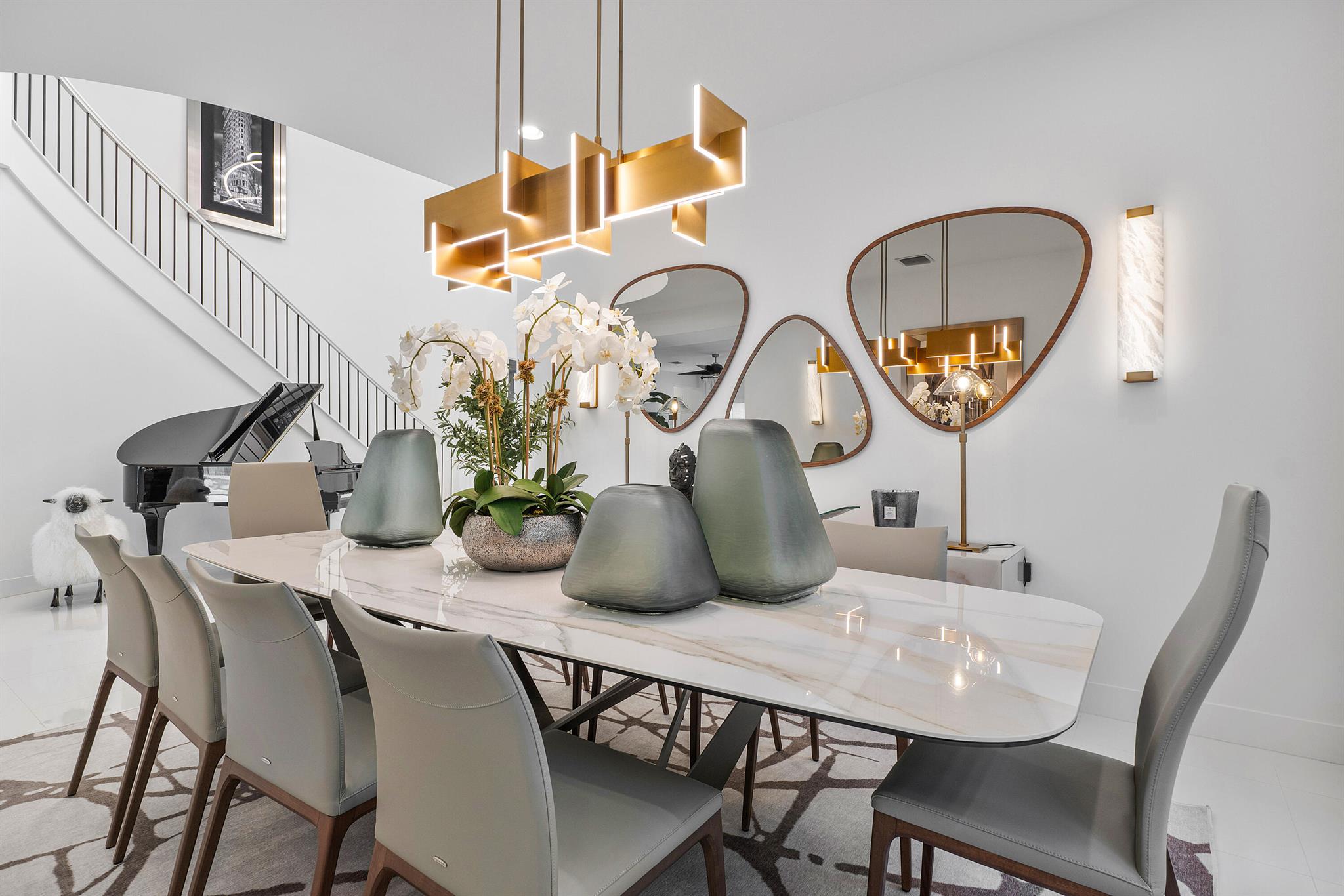 Discover the epitome of luxury living in this custom-built Lotus residence with a long lake view! This Lotus Sumatra Model is completely upgraded offering spacious and elegant living areas, designed for both comfort, yet exuding sophistication. From the split three-car garage, you'll enter the grand foyer, which features a two-story space, complete with modern chandeliers, and a piano. Behind the crystalia doors, a completely built out office is a stylish retreat. The living room and kitchen overlook the sparkling heated pool and spa, with deep views of the lake, and tropical landscaping. The first-floor primary suite features custom window treatments, a spa inspired bath with jetted shower and floating tub. Upstairs, you'll find four additional bedrooms, each with a private bath