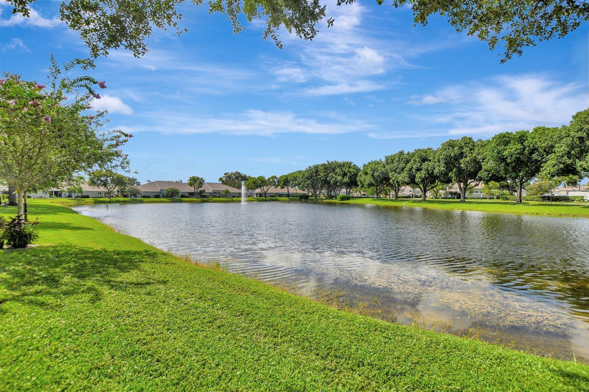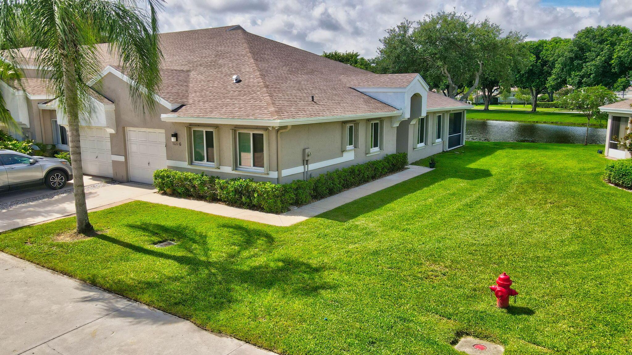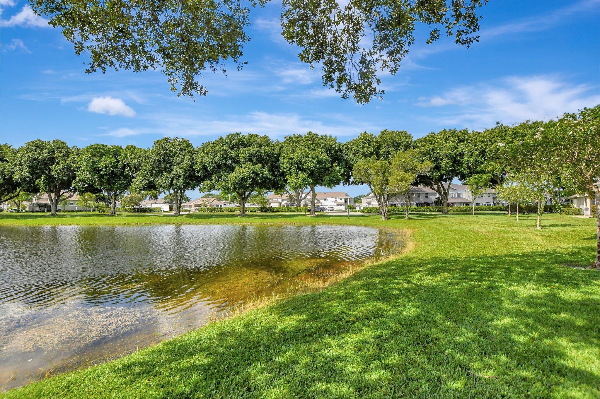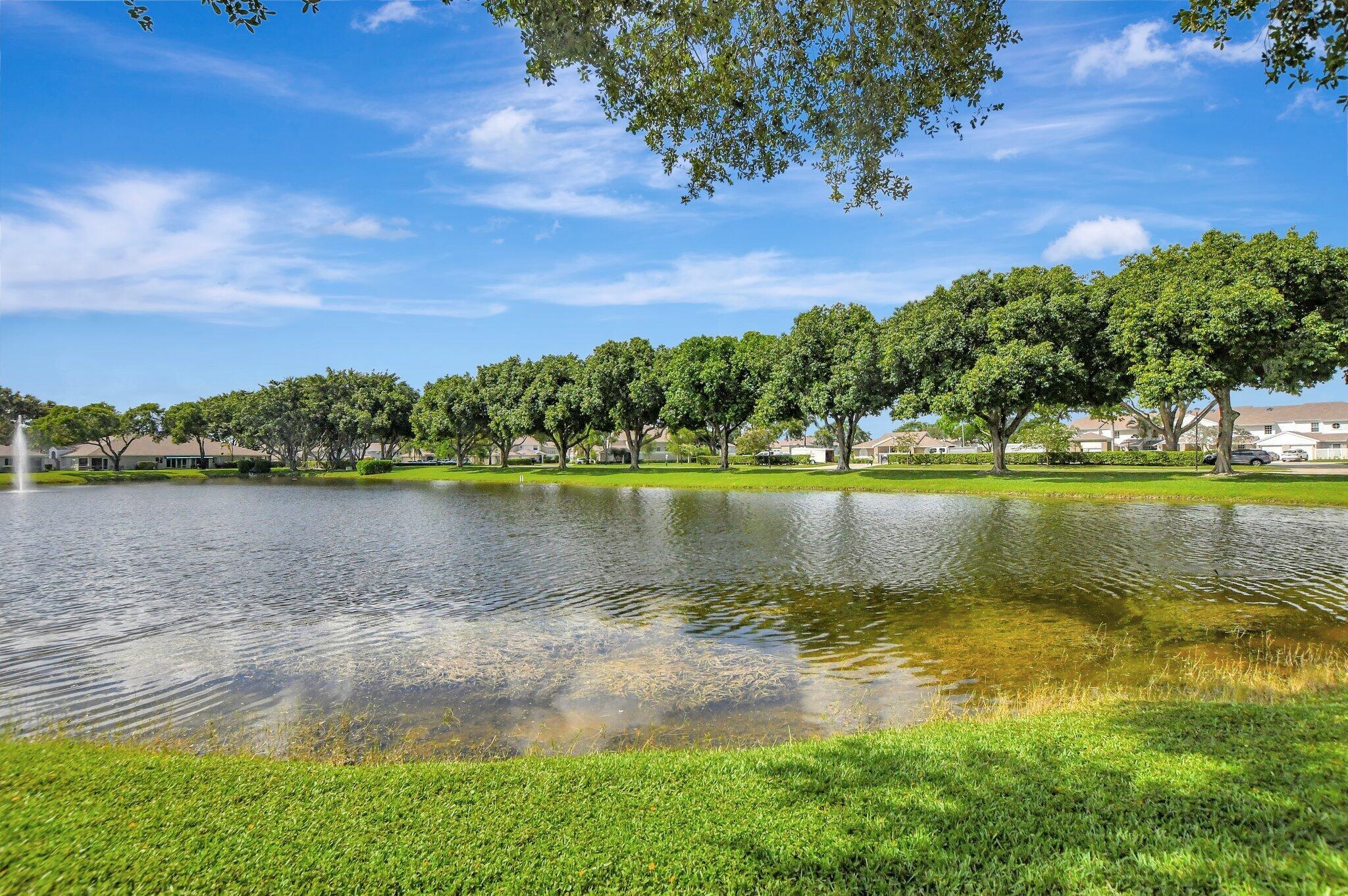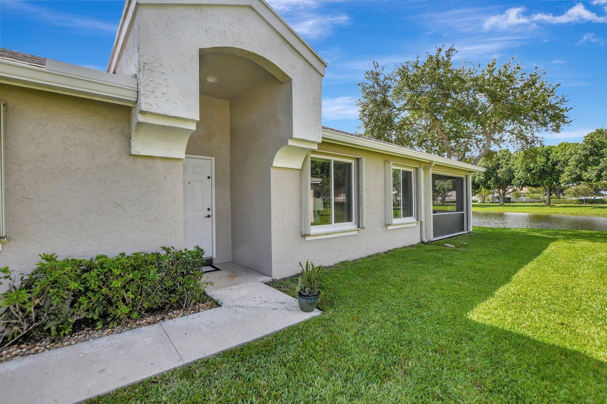 ONLY LAKEFRONT HOME AT THIS PRICE IN BOCA! BIG YARD . 3 BEDROOM .BRIGHT.WELL MAINTAINED HOME . GARAGE . END UNIT .Tile floors throughout, high ceilings with knockdown, crown molding in main living areas, double pane windows, and hurricane shutters complete. Wood cabinets and granite in kitchen, stainless steel appliances, tumbled marble backsplash, and tons of storage in cabinets. 117 sq f screened patio overlooking lake . 2016 Lennox AC . Close to community pool, Tons of grass areas, 3 pools, pickleball, wide sidewalks, and pet friendly. Roof is 2024 and covered by HOA 100% for repair and maintenance. Low HOA includes cable , lawncare, and amenities. Current homeowner's insurance is $1,800 year