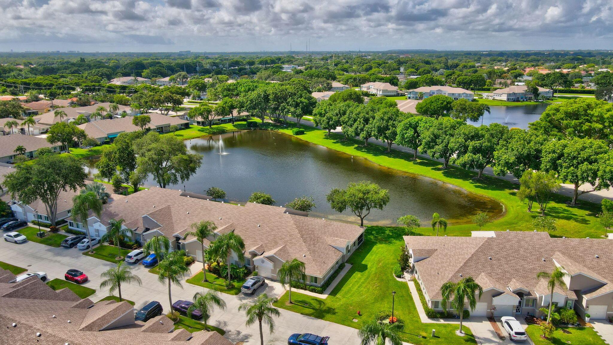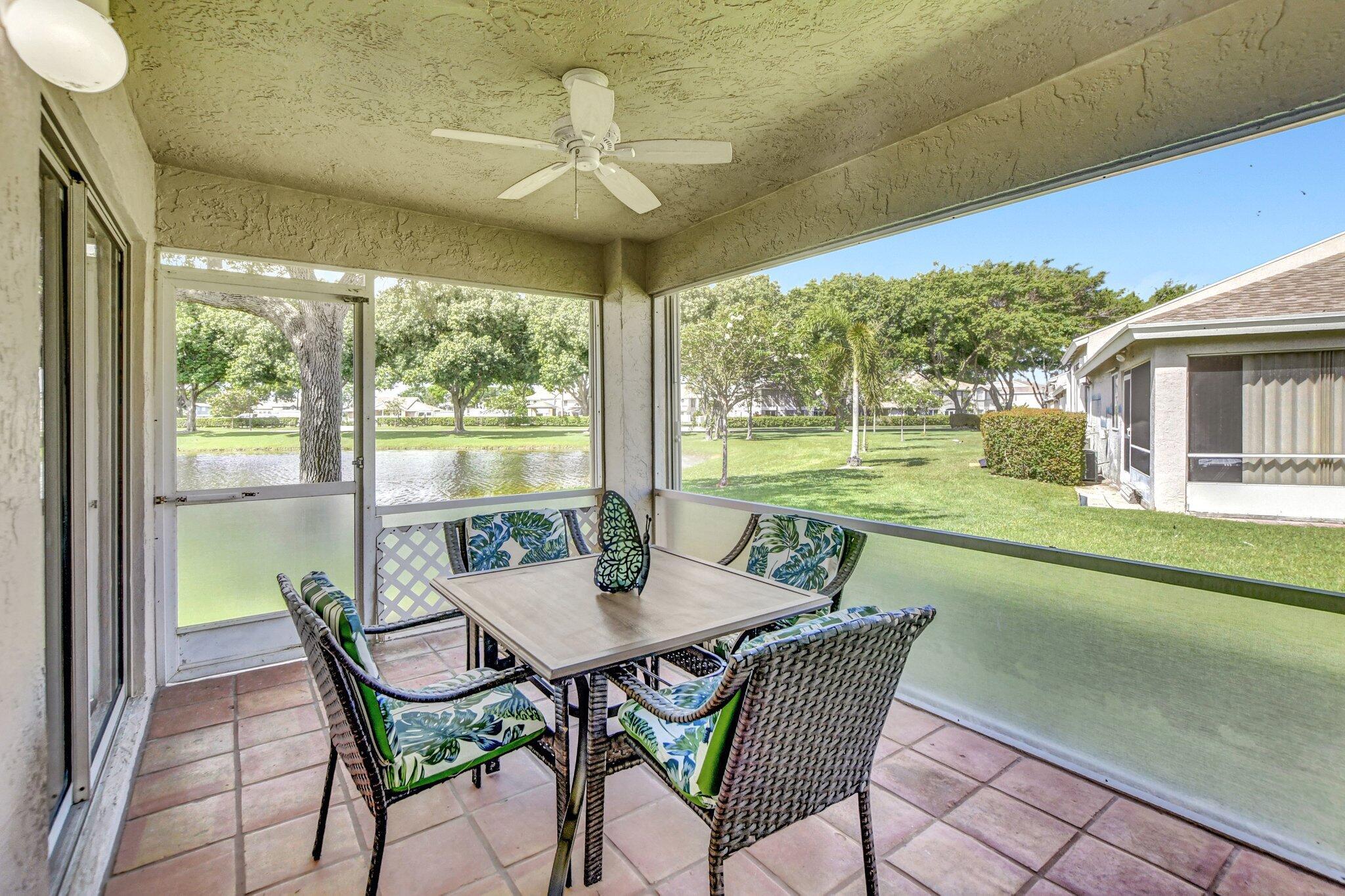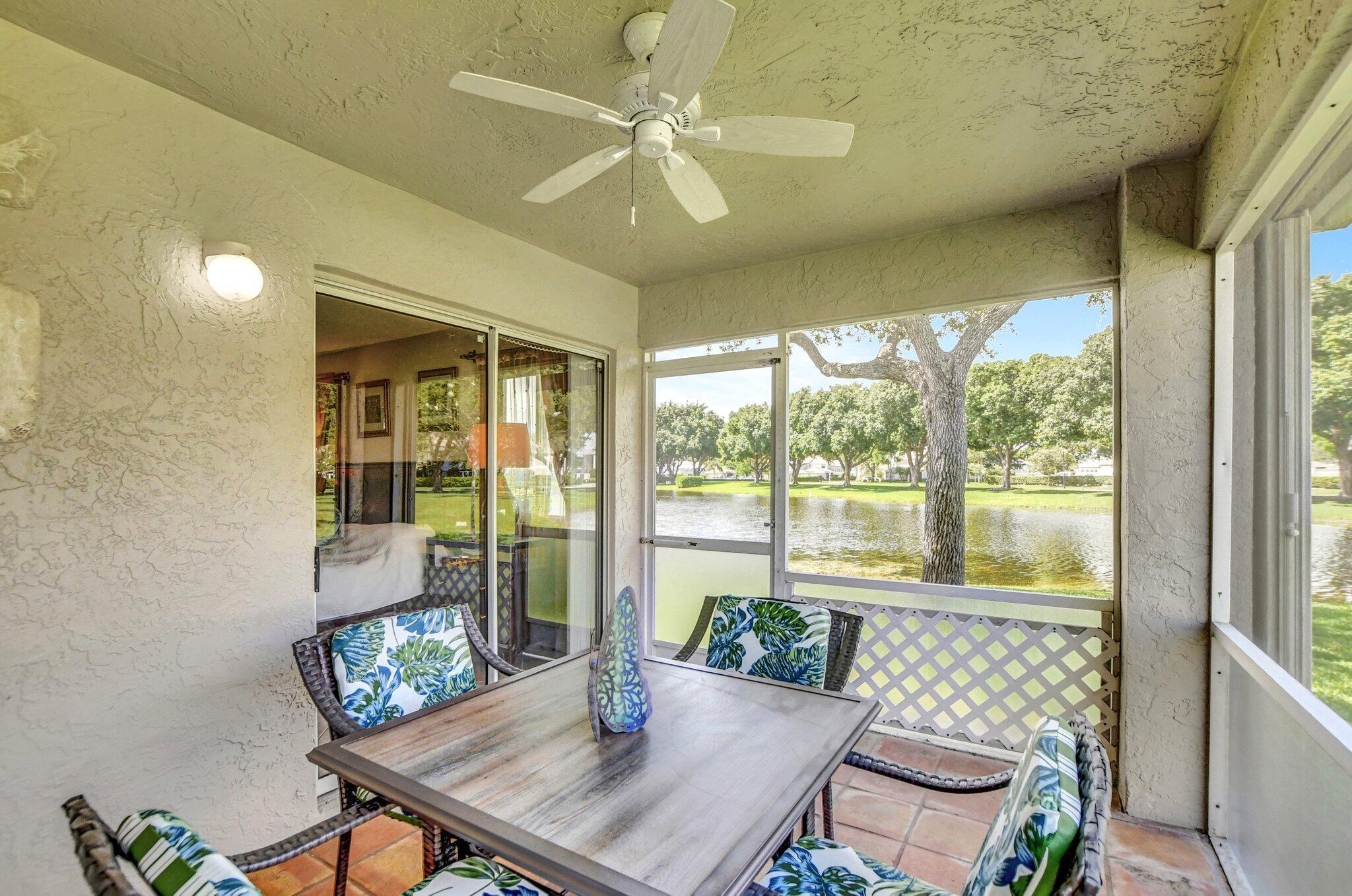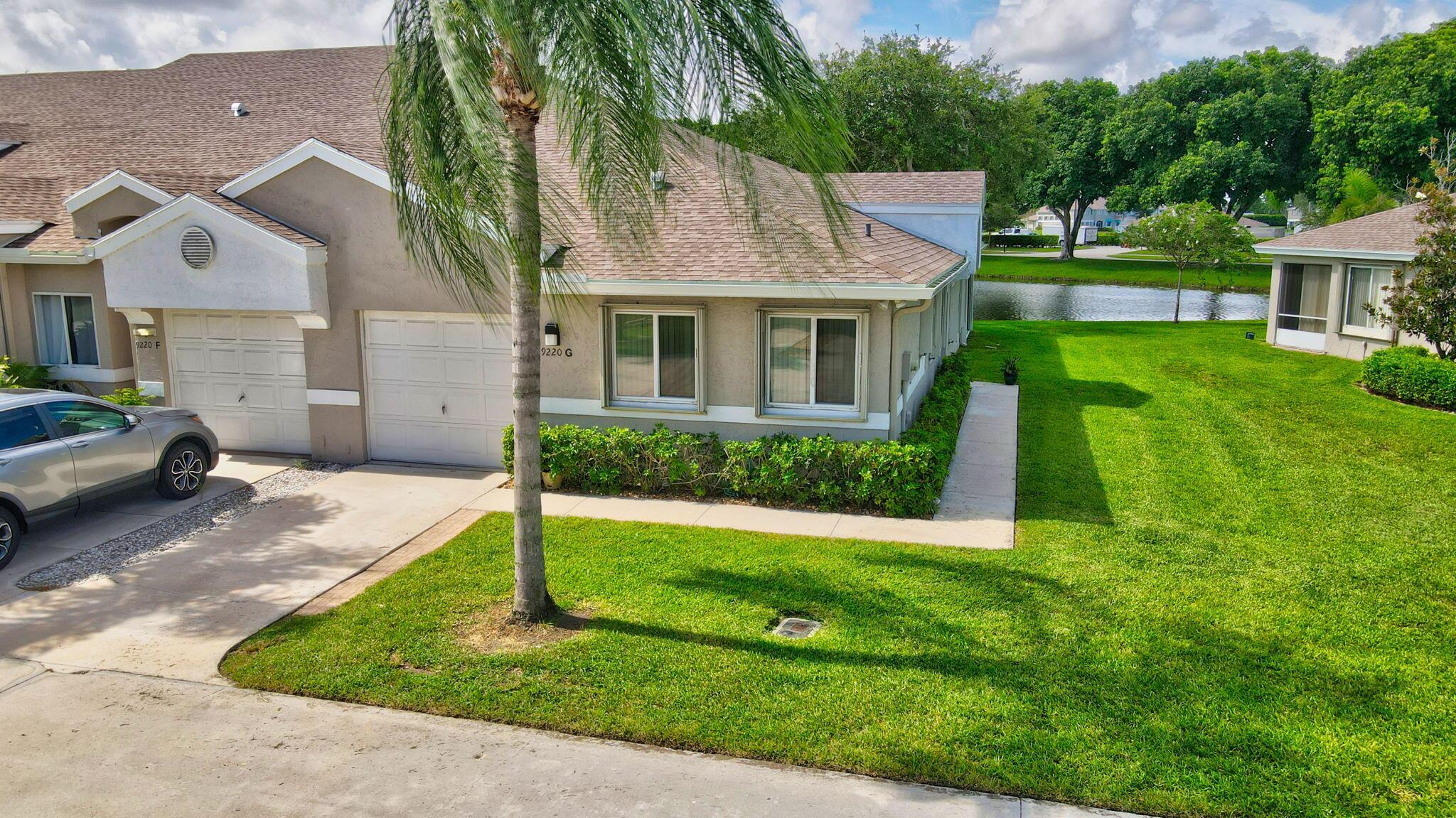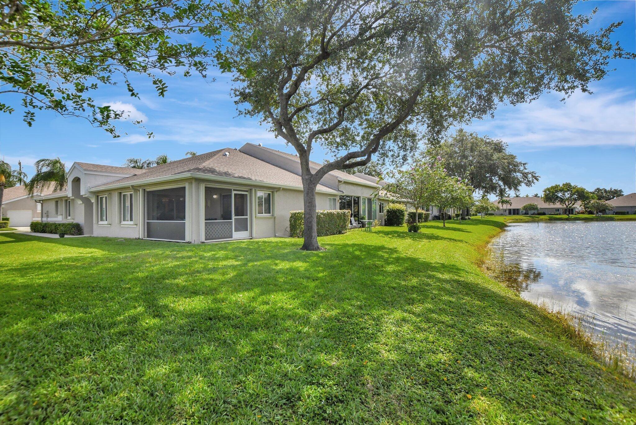 ONLY LAKEFRONT HOME AT THIS PRICE IN BOCA! BIG YARD . 3 BEDROOM .BRIGHT.WELL MAINTAINED HOME . GARAGE . END UNIT .Tile floors throughout, high ceilings with knockdown, crown molding in main living areas, double pane windows, and hurricane shutters complete. Wood cabinets and granite in kitchen, stainless steel appliances, tumbled marble backsplash, and tons of storage in cabinets. 117 sq f screened patio overlooking lake . 2016 Lennox AC . Close to community pool, Tons of grass areas, 3 pools, pickleball, wide sidewalks, and pet friendly. Roof is 2024 and covered by HOA 100% for repair and maintenance. Low HOA includes cable , lawncare, and amenities. Current homeowner's insurance is $1,800 year