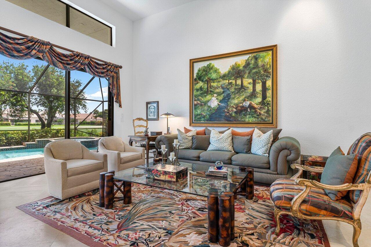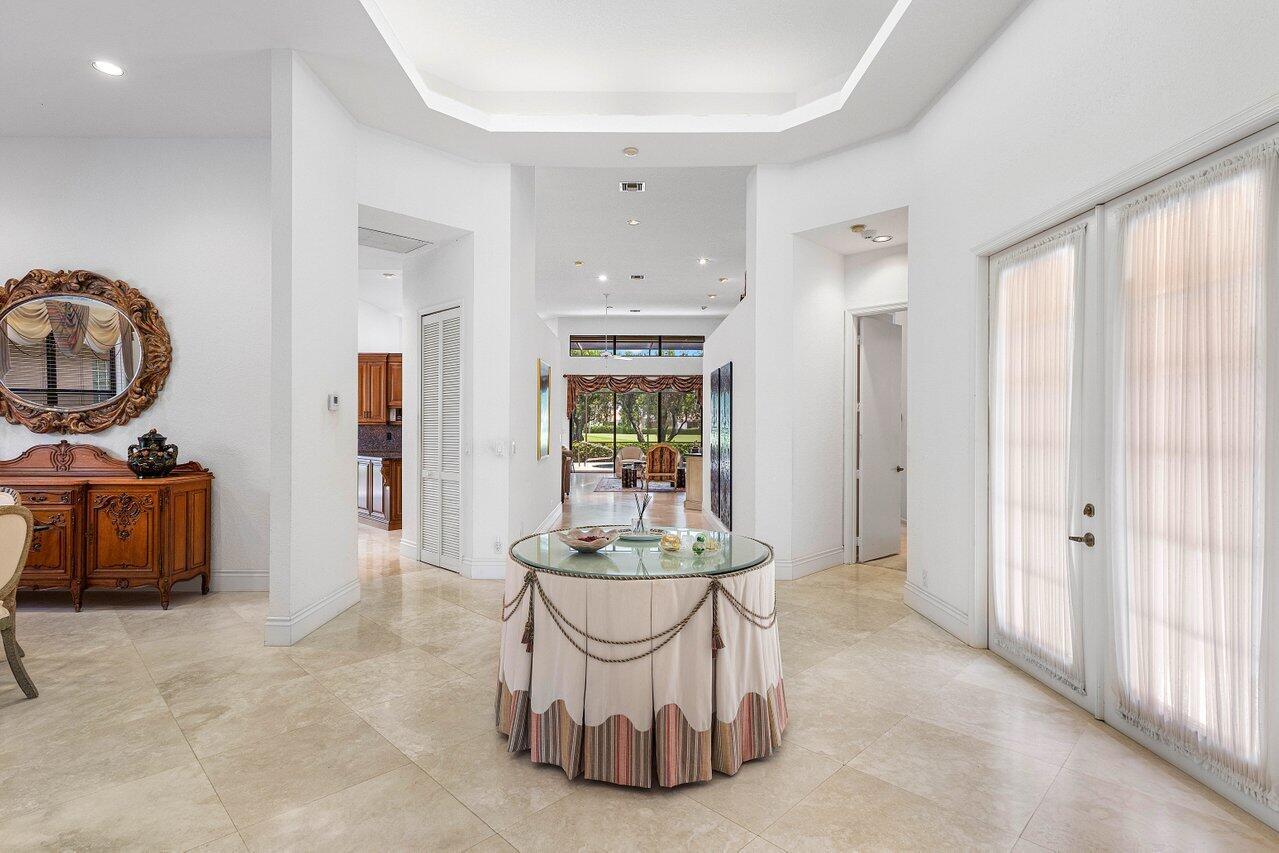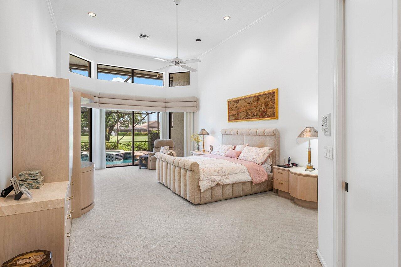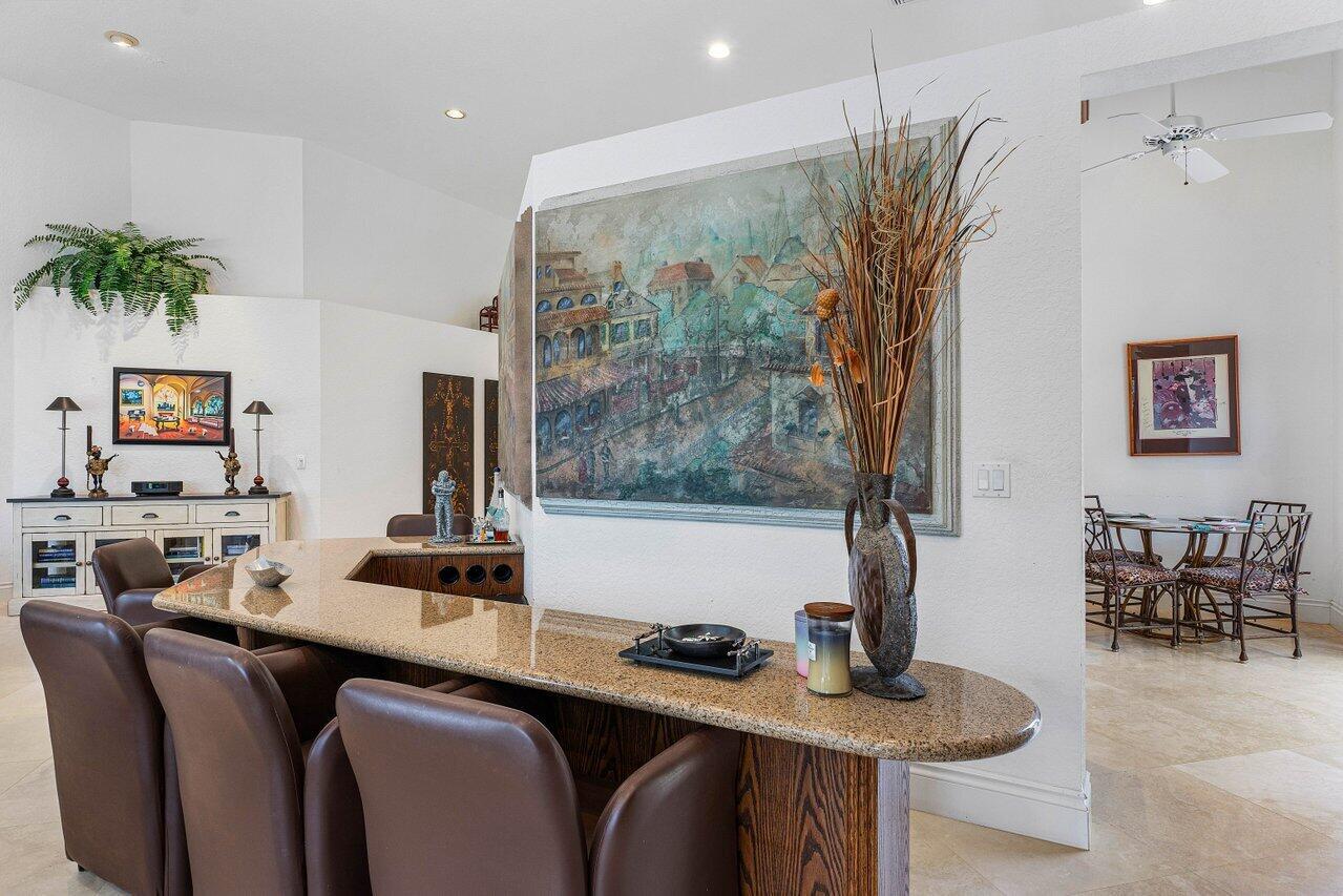 This custom-built home offers an expansive one-of-a-kind layout as the perfect palette to customize and make your own. From the moment you walk in, the grandeur of the foyer is impressive, and high ceiling heights continuously flow from the front entry to the exterior creating a sense of openness that is truly captivating. The focal point of the home is the oversized great room with a bar, seamlessly connected to the kitchen, which could easily be converted to a completely open concept design that would visually expand the footprint and provide numerous possibilities for entertaining. Offering easy access to the exterior, the private pool with a spillover spa and sun filled Southern exposure patio are set against the backdrop of the lush golf course and tranquil lake beyond. It's a -->