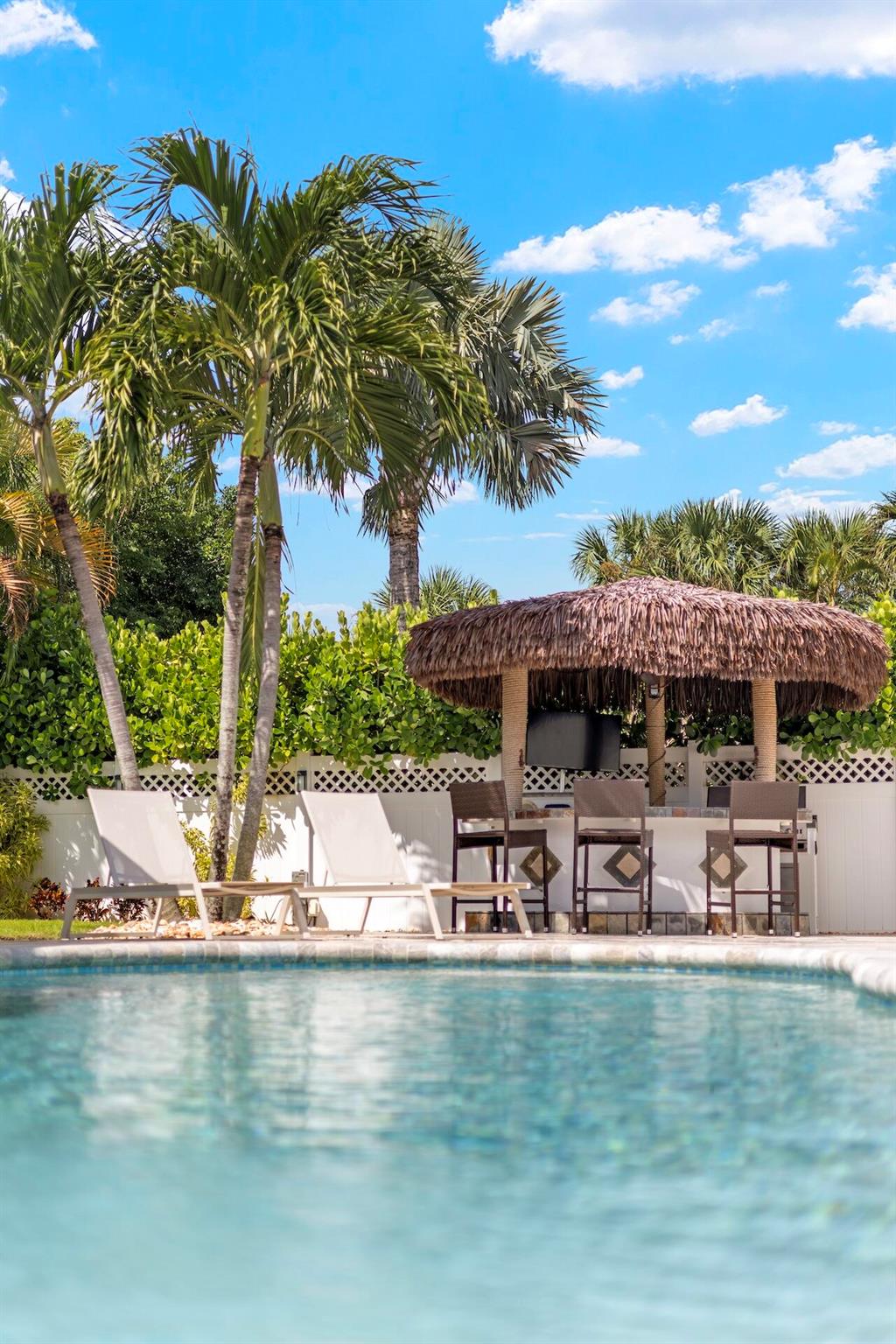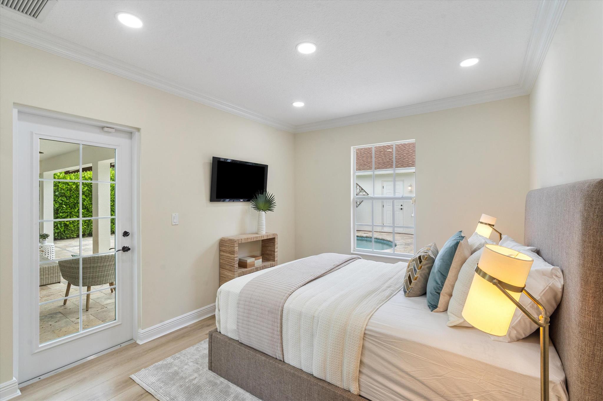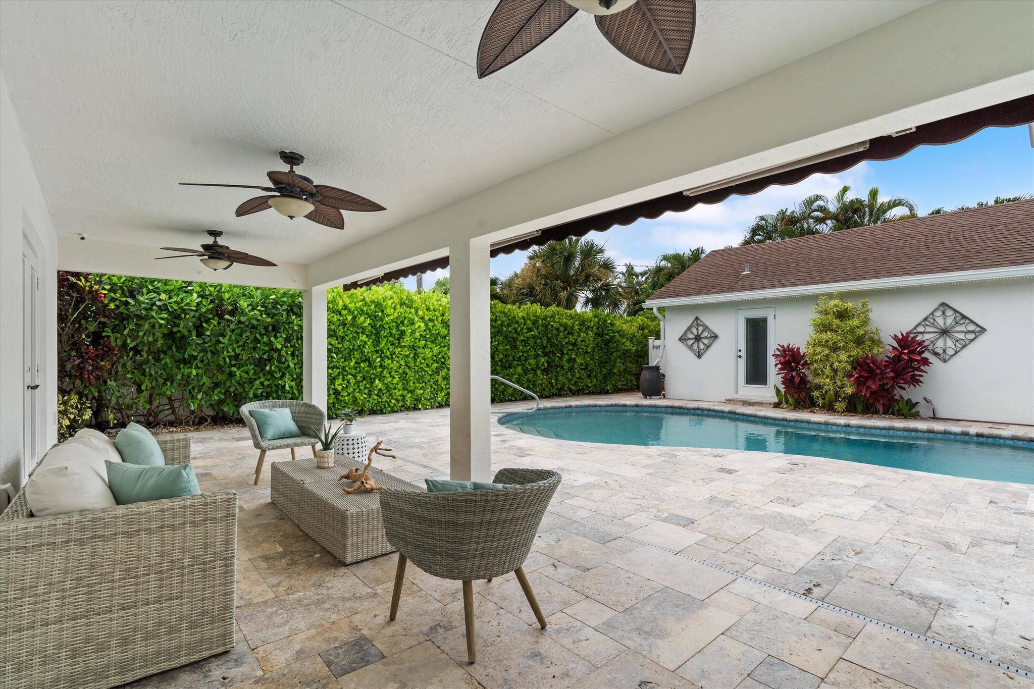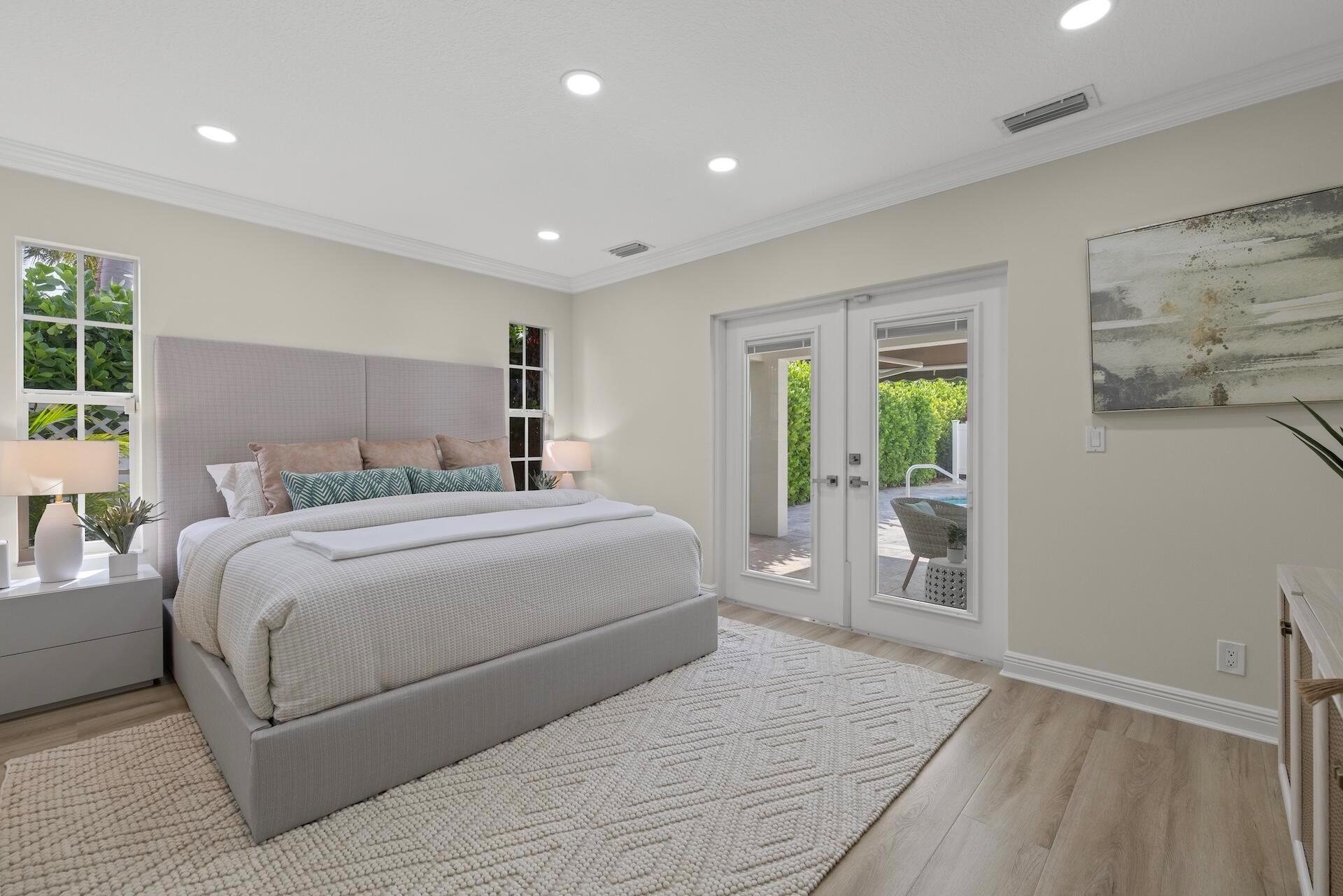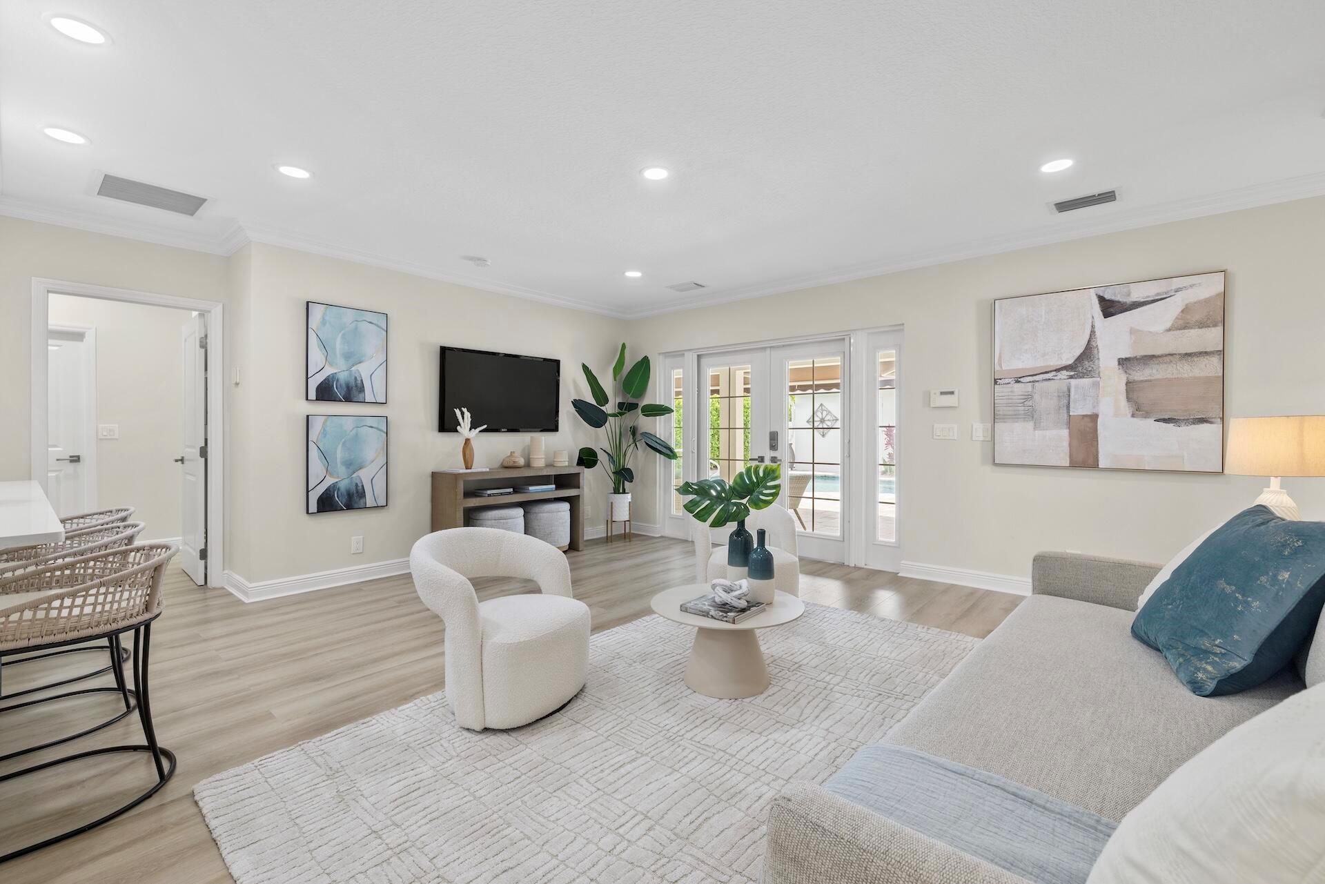 Newly renovated Summer of 2024, professionally orchestrated turn-key single-story CBS constructed home on elevated 10,000+SF lot, impact glass throughout in sought after location of Alhambra Park. 214 Alhambra Place is ideally located between S. Olive Avenue and Washington Road, a short walk to Intracoastal Waterway and Summa Beach Park and Trail. This home offers a well-thought-out floor plan that can be utilized by family, empty nesters or someone who loves to entertain. Main house offers 4 bedrooms, 3 baths and home office. You will be astonished by the clever use of space in the rear of the property. Covered patio space, redone pool, outdoor shower, entirely renovated guest house with full bath and kitchen, tiki bar, extra living space that can be home gym or artist studio.