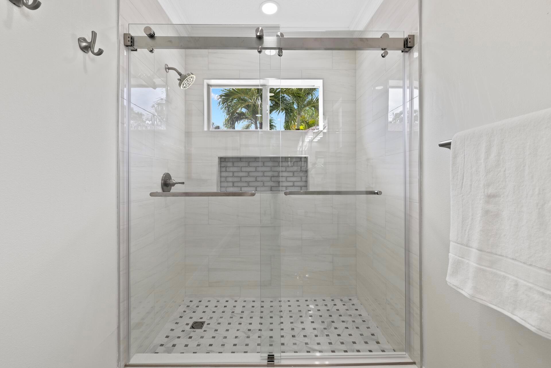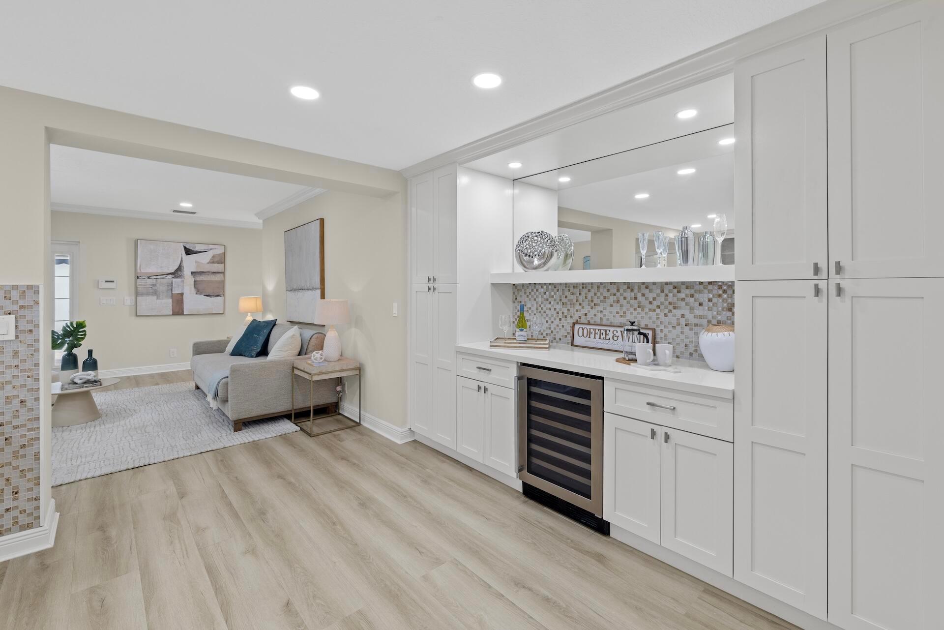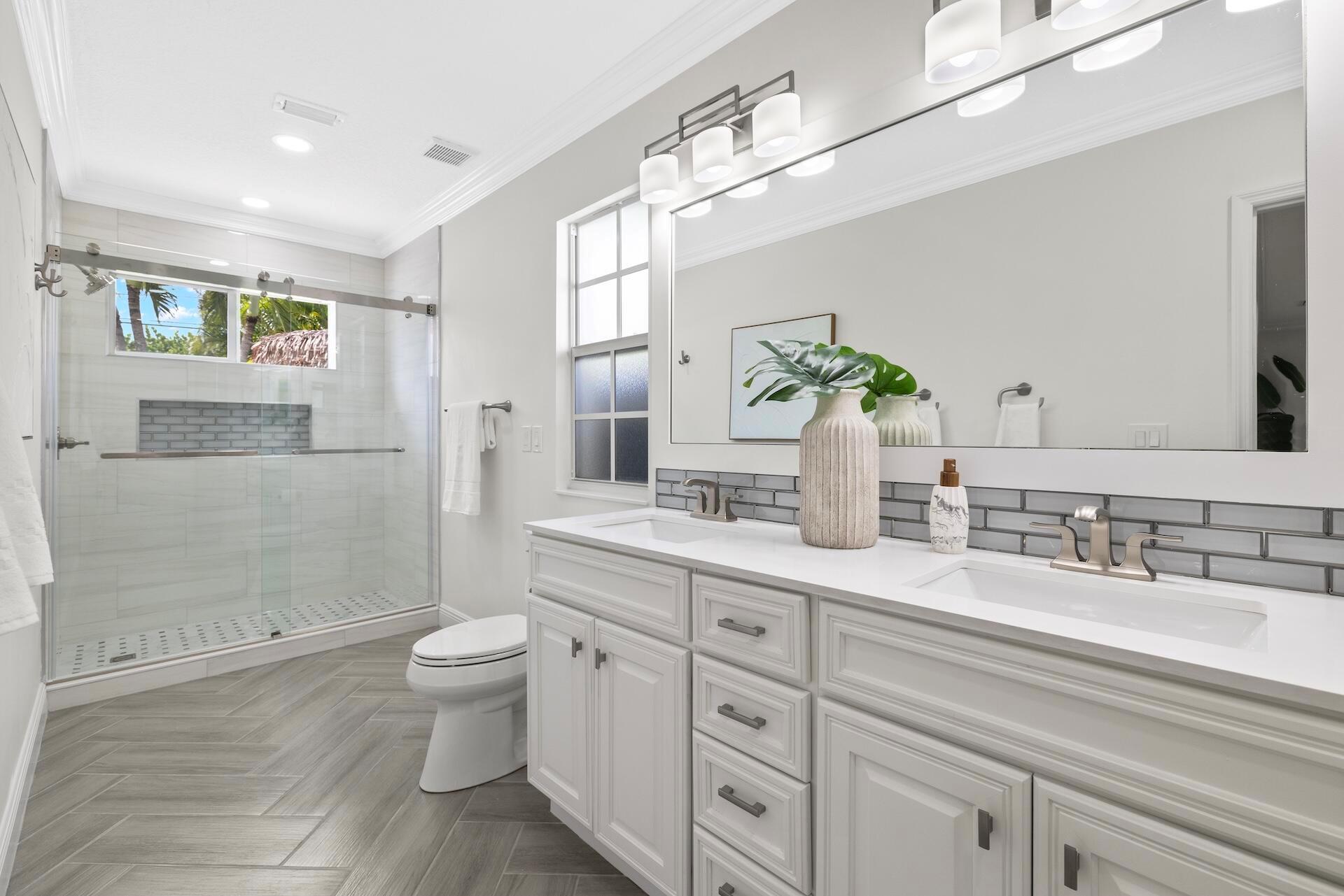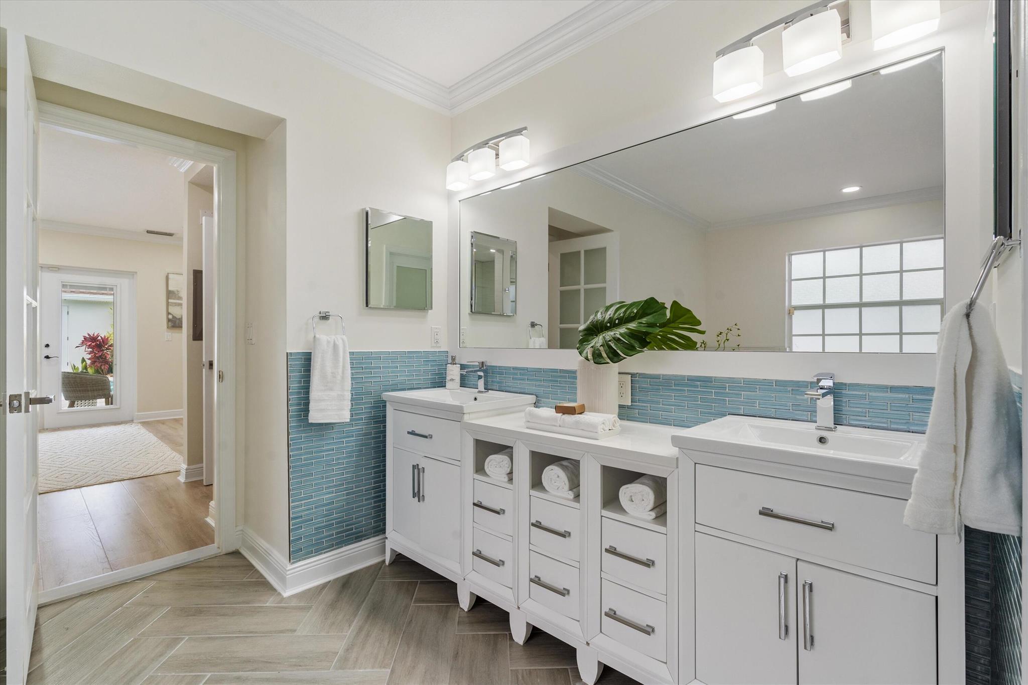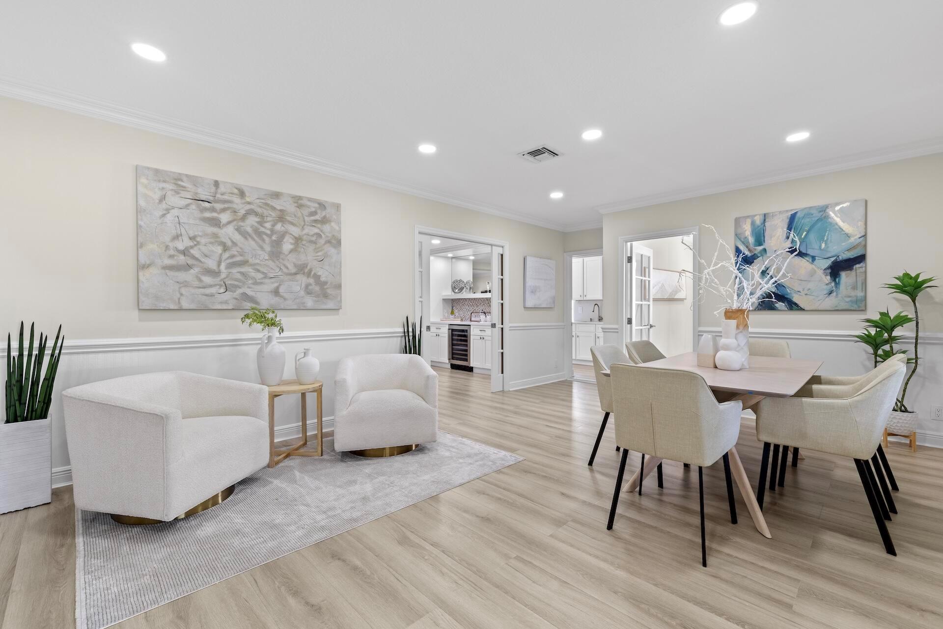 Newly renovated Summer of 2024, professionally orchestrated turn-key single-story CBS constructed home on elevated 10,000+SF lot, impact glass throughout in sought after location of Alhambra Park. 214 Alhambra Place is ideally located between S. Olive Avenue and Washington Road, a short walk to Intracoastal Waterway and Summa Beach Park and Trail. This home offers a well-thought-out floor plan that can be utilized by family, empty nesters or someone who loves to entertain. Main house offers 4 bedrooms, 3 baths and home office. You will be astonished by the clever use of space in the rear of the property. Covered patio space, redone pool, outdoor shower, entirely renovated guest house with full bath and kitchen, tiki bar, extra living space that can be home gym or artist studio.