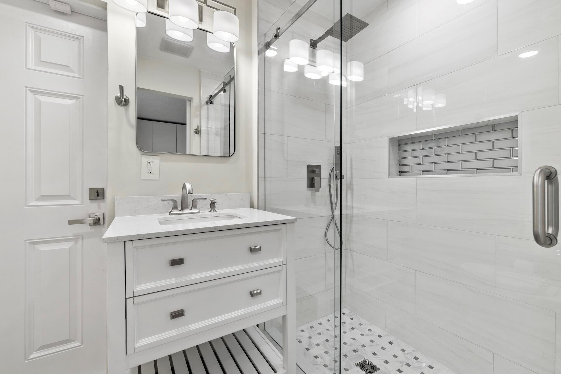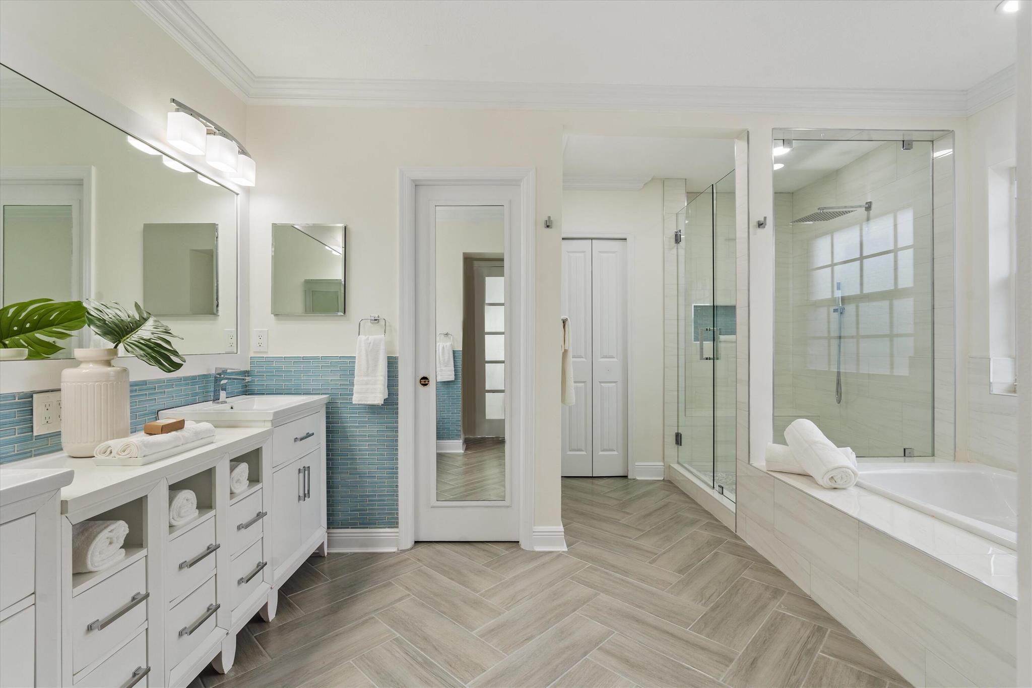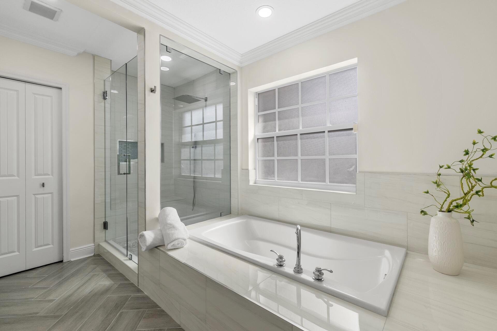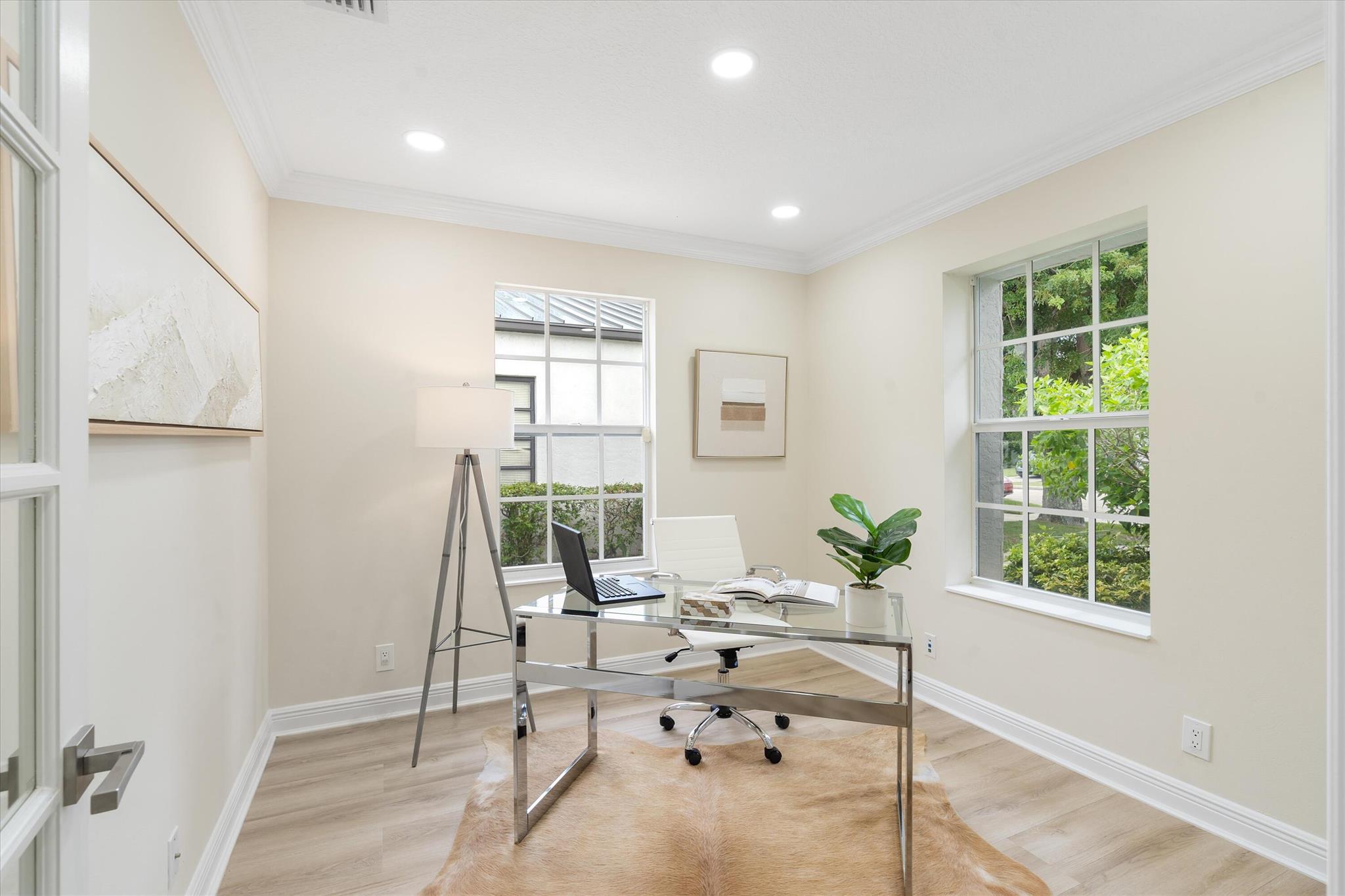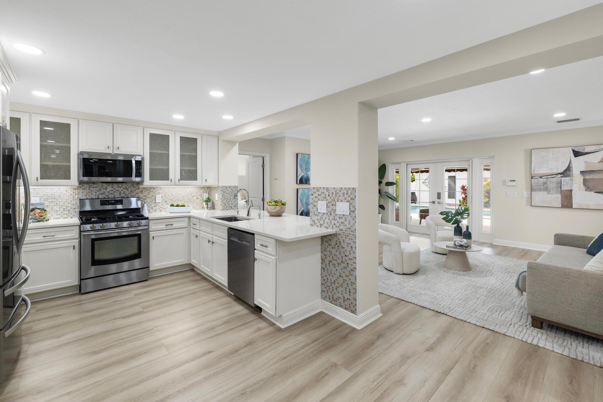 Newly renovated Summer of 2024, professionally orchestrated turn-key single-story CBS constructed home on elevated 10,000+SF lot, impact glass throughout in sought after location of Alhambra Park. 214 Alhambra Place is ideally located between S. Olive Avenue and Washington Road, a short walk to Intracoastal Waterway and Summa Beach Park and Trail. This home offers a well-thought-out floor plan that can be utilized by family, empty nesters or someone who loves to entertain. Main house offers 4 bedrooms, 3 baths and home office. You will be astonished by the clever use of space in the rear of the property. Covered patio space, redone pool, outdoor shower, entirely renovated guest house with full bath and kitchen, tiki bar, extra living space that can be home gym or artist studio.