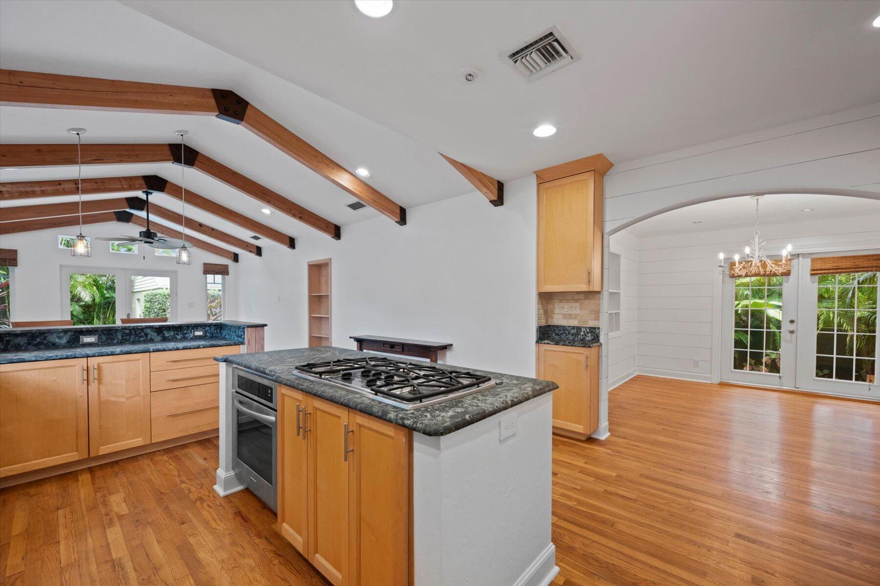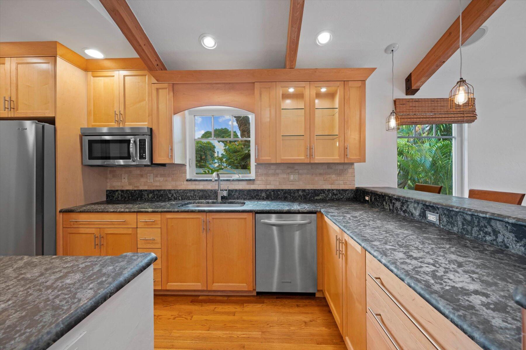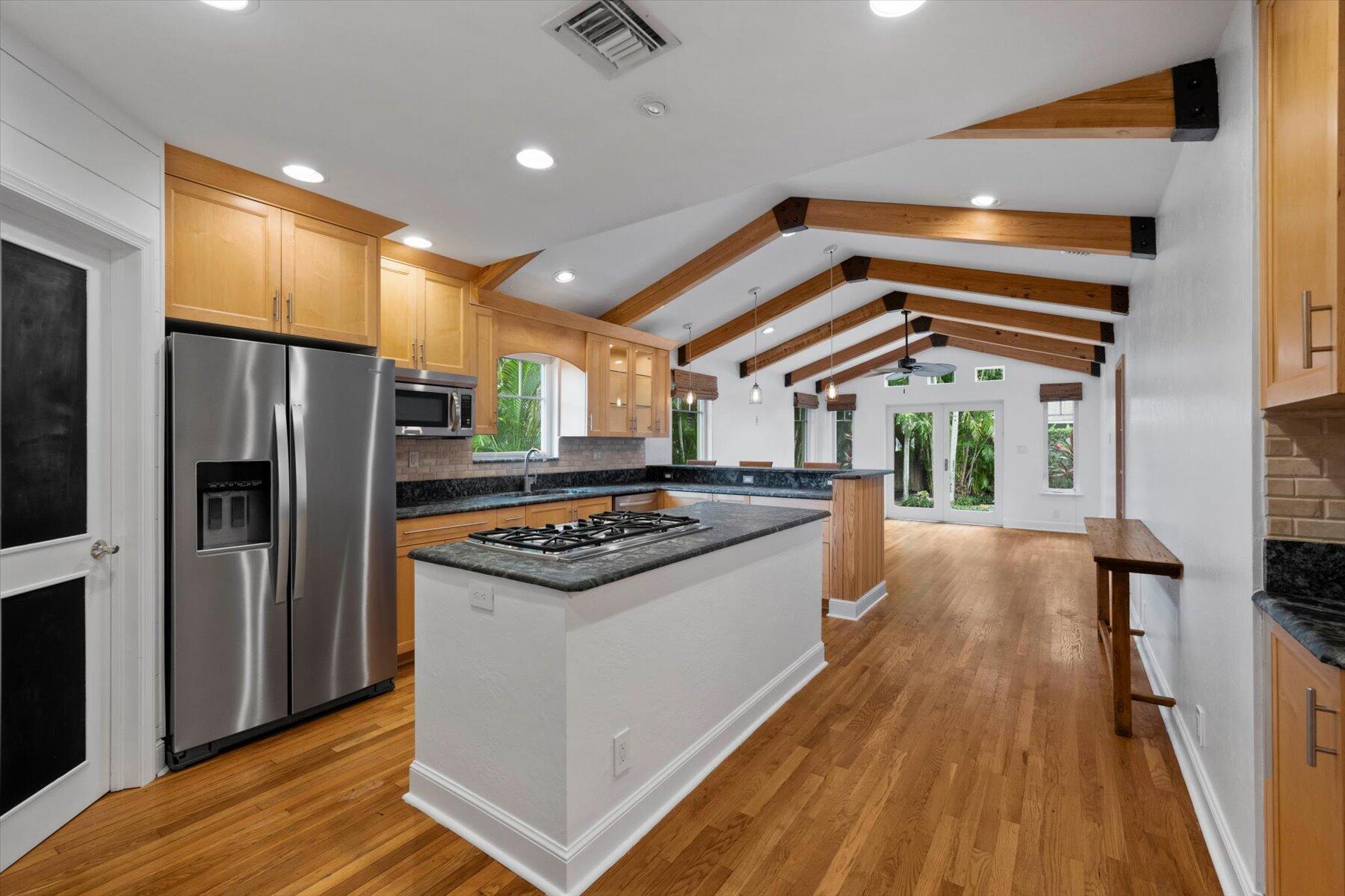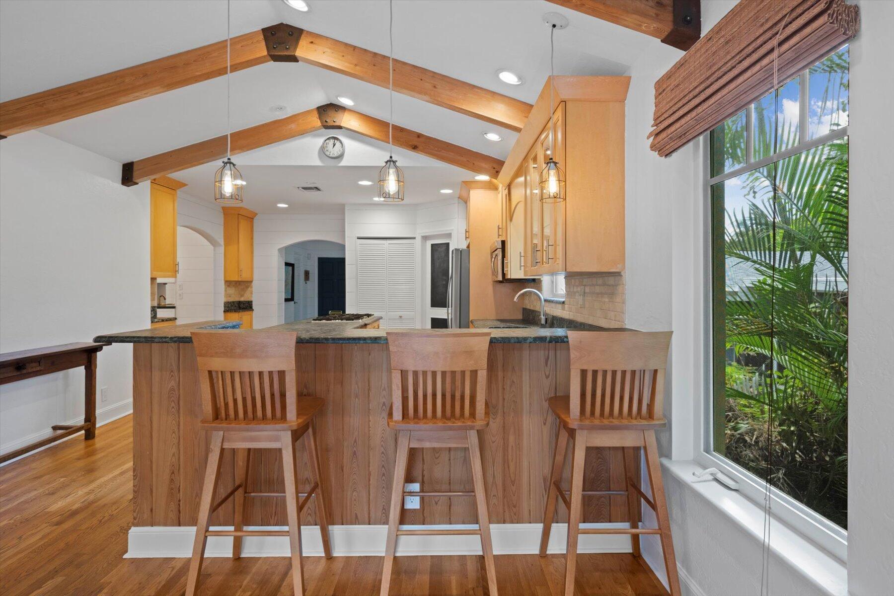 Welcome to this charming home at 729 Biscayne Drive in West Palm Beach's historic Flamingo Park district, where warmth and character greet you at every turn. This exceptional property features an open floor plan that seamlessly connects the kitchen and great room. Vaulted ceilings with grand wood beams and metal brackets create a striking focal point. The kitchen is a chef's dream, boasting custom wood cabinetry with glass doors, stone countertops, a gas stovetop, stainless steel appliances, and ample space for entertaining.