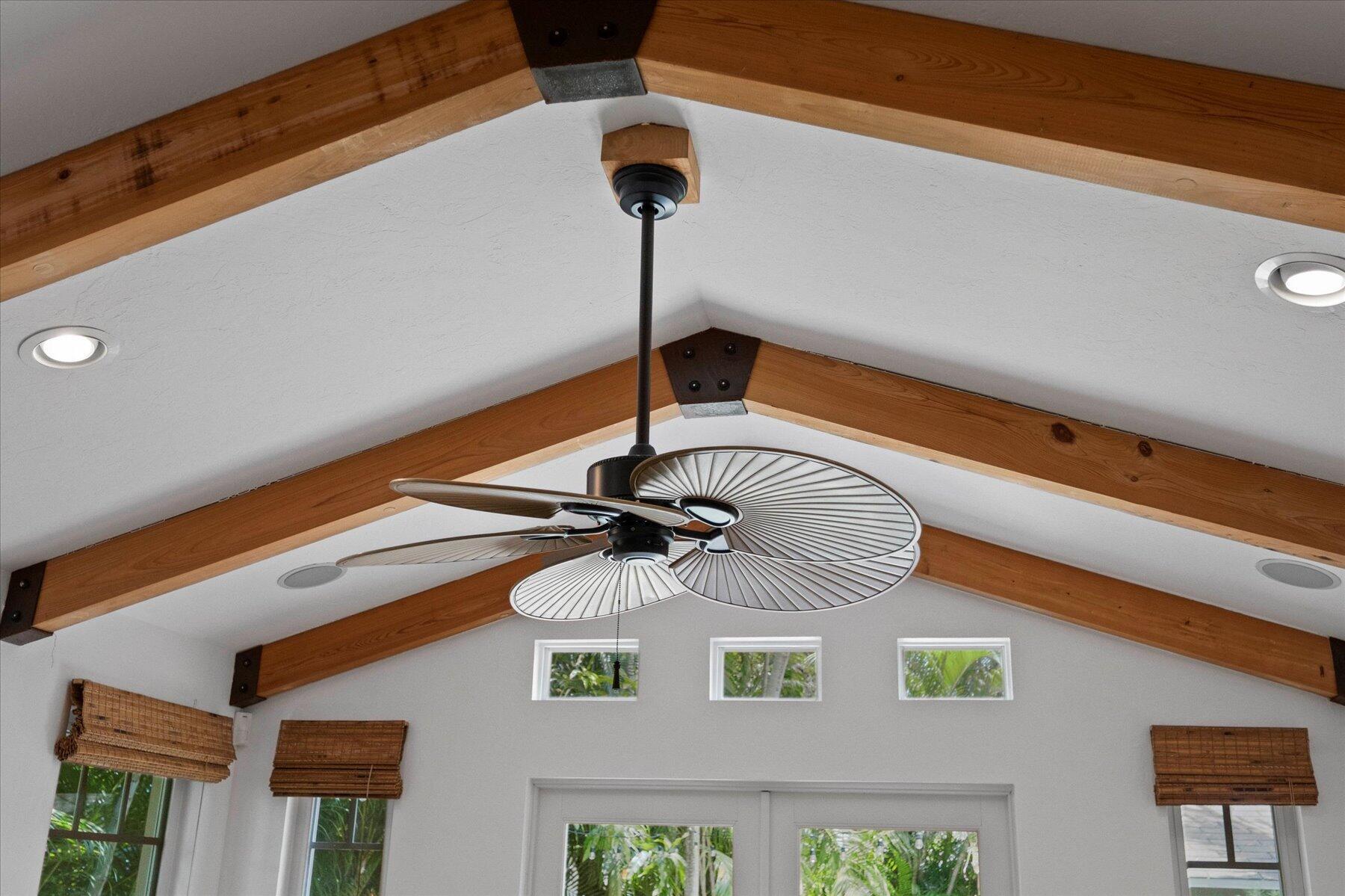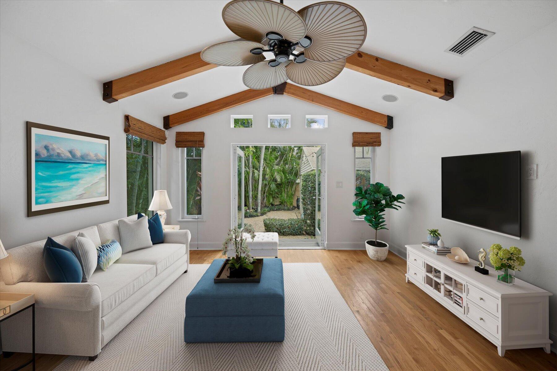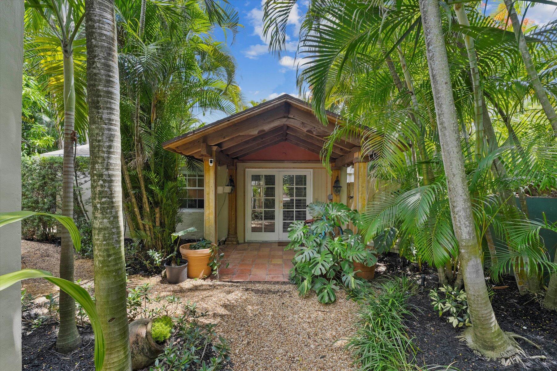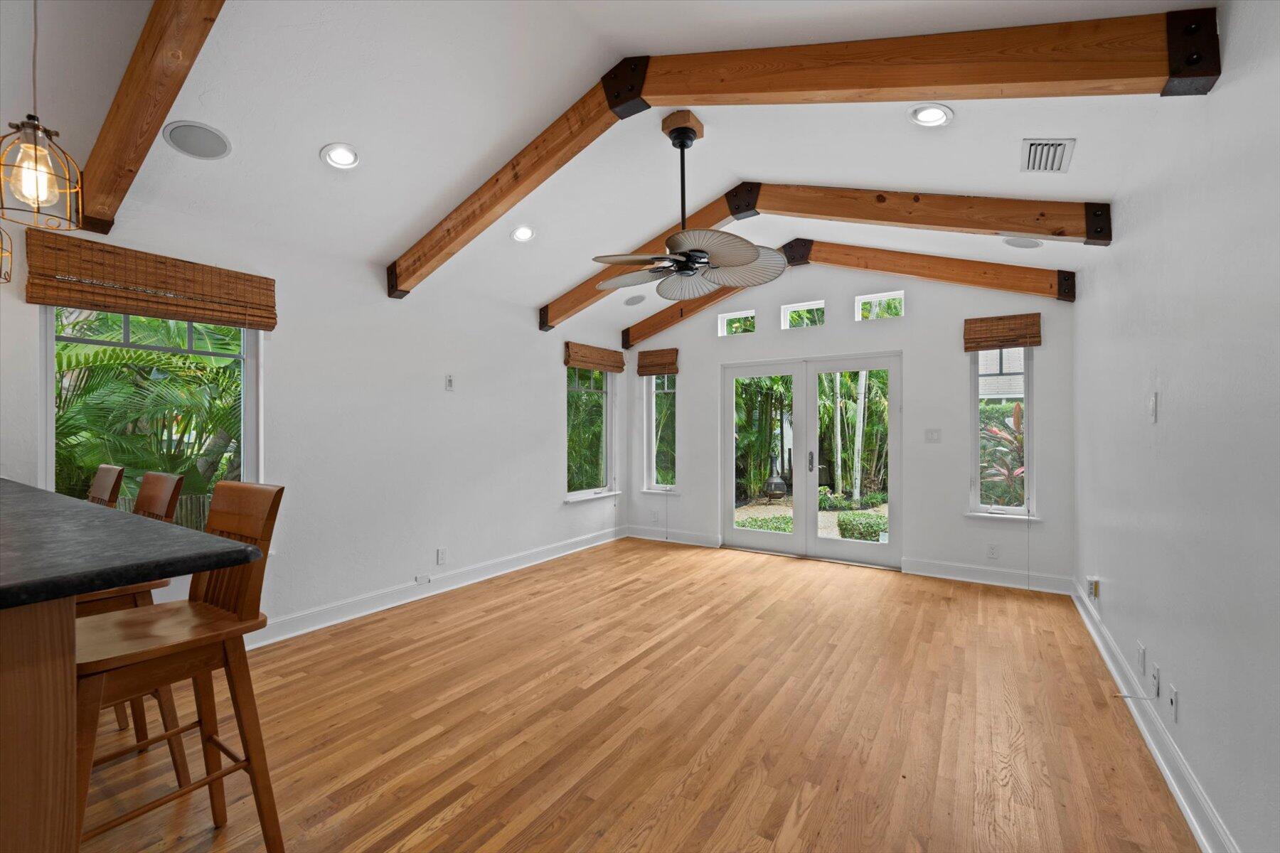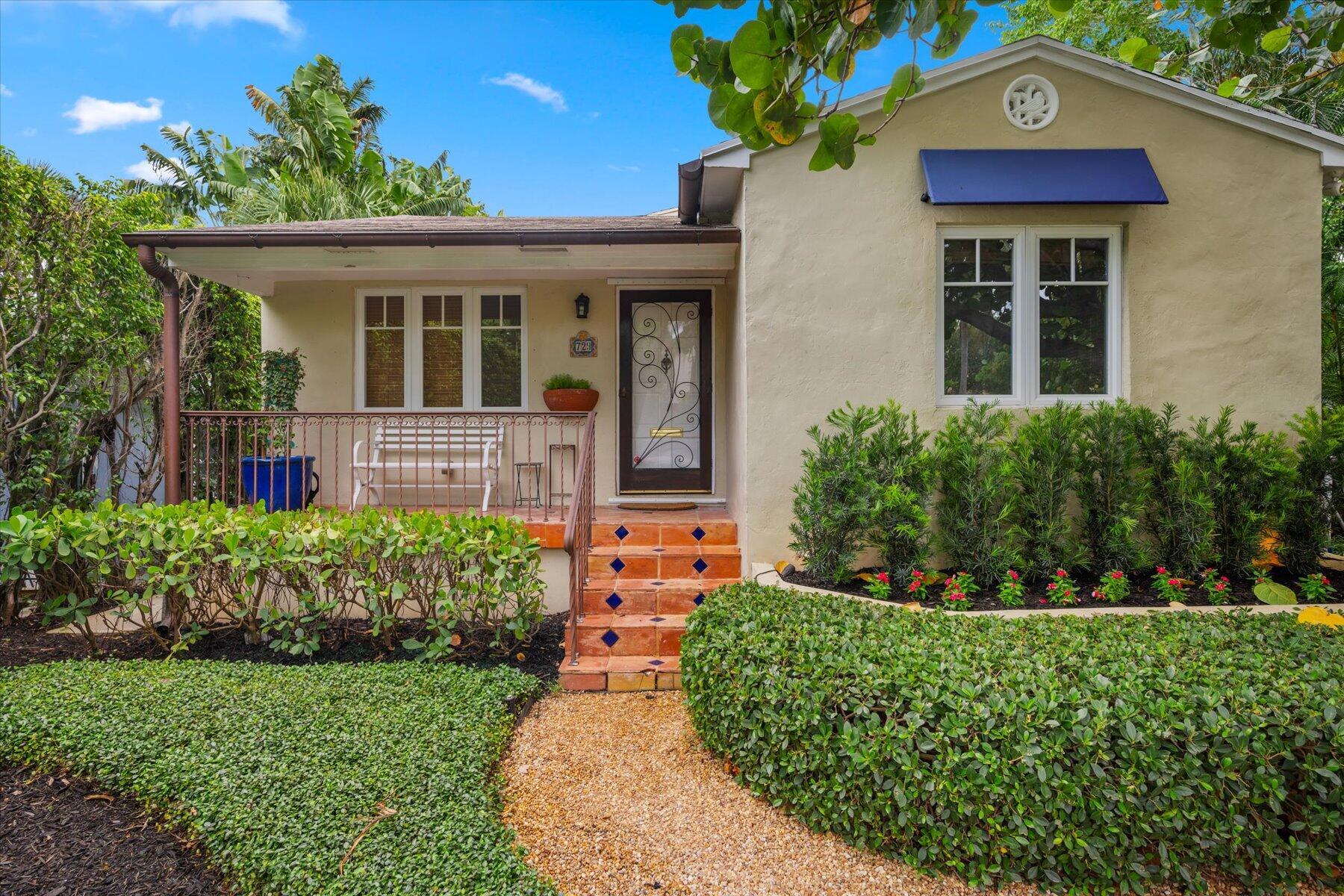Welcome to this charming home at 729 Biscayne Drive in West Palm Beach's historic Flamingo Park district, where warmth and character greet you at every turn. This exceptional property features an open floor plan that seamlessly connects the kitchen and great room. Vaulted ceilings with grand wood beams and metal brackets create a striking focal point. The kitchen is a chef's dream, boasting custom wood cabinetry with glass doors, stone countertops, a gas stovetop, stainless steel appliances, and ample space for entertaining.