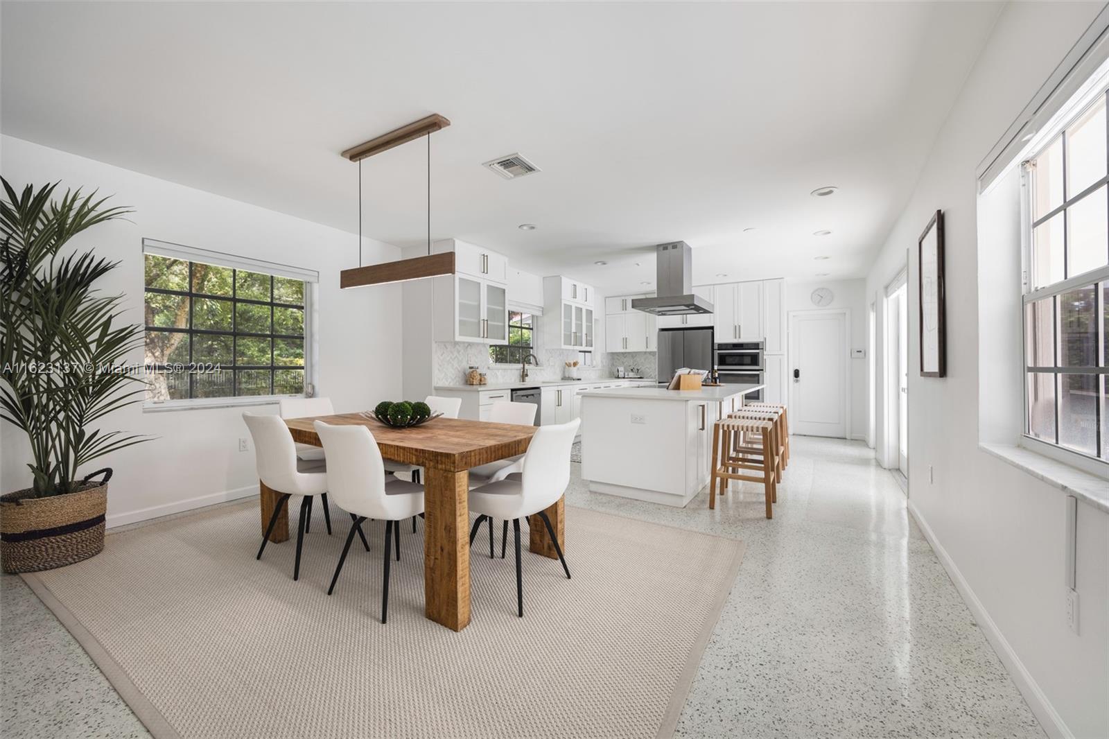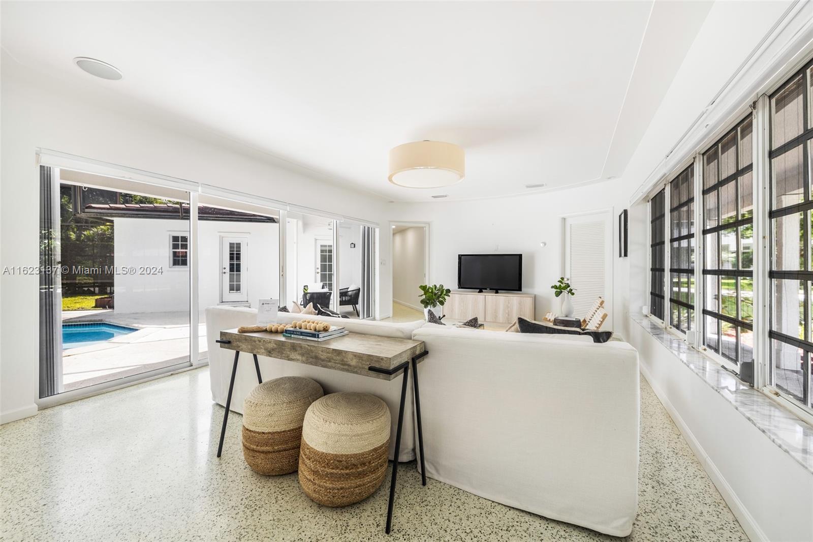 This beautifully updated 3-bedroom, 2.5-bath home, built in 1957, is a gem in the coveted Platinum Triangle of Coral Gables. It features unique architectural details and is perfectly situated on a corner lot. The home underwent major renovations in 2017, including updates to the septic system, all electrical work, the kitchen, bathrooms, half bath, laundry room, and sound system with high-quality cabling. The roof was replaced in 2019, and the AC venting system was updated in 2020. Modern amenities include a tankless water heater, green appliances, an electric car charger, and LED lights. The washer and refrigerator were added in 2022. Additional highlights include a screened pool and patio, hurricane shutters, an indoor laundry room, and a 2-car garage.