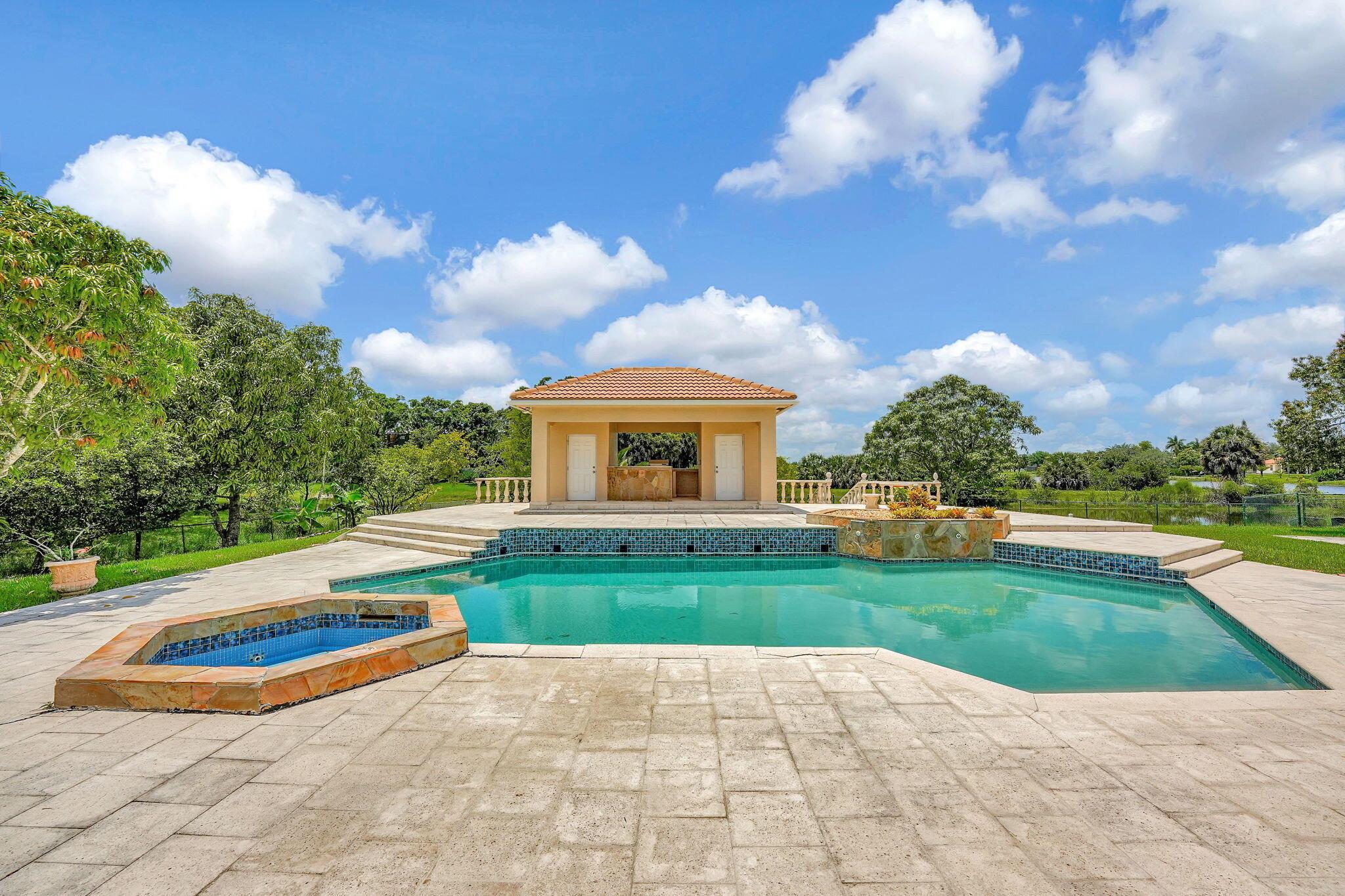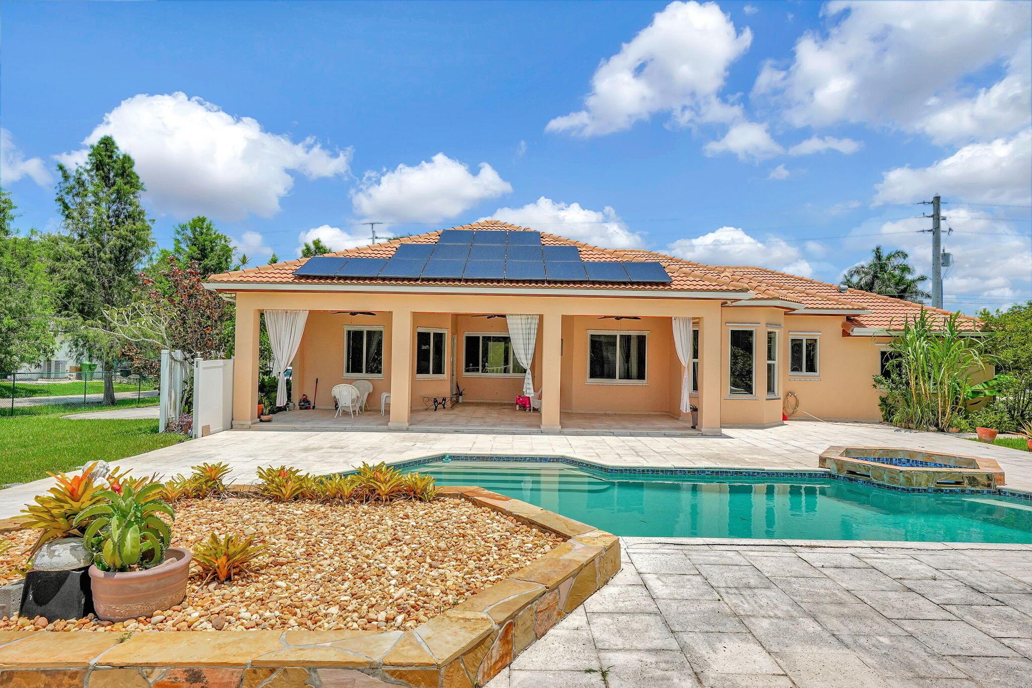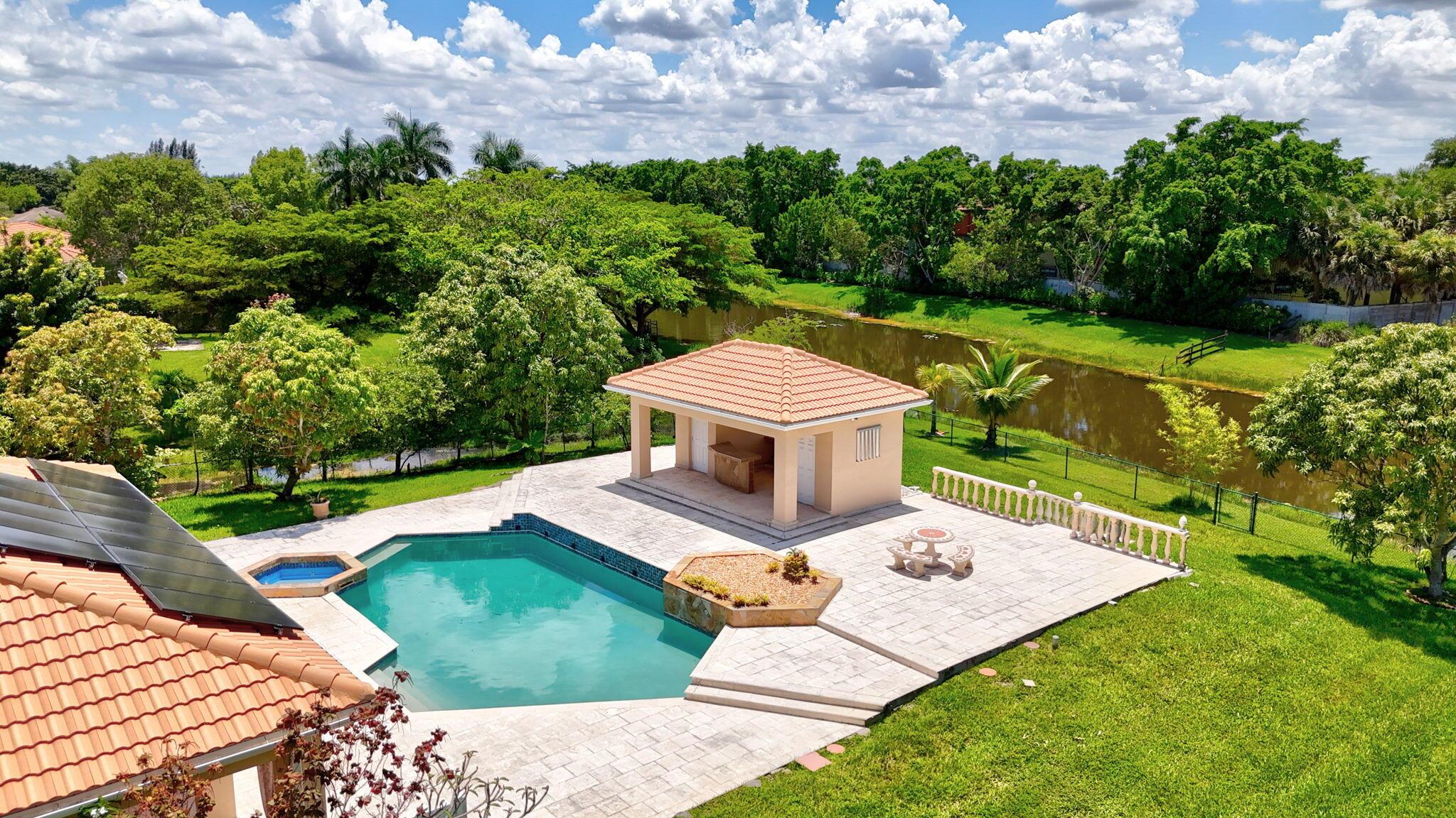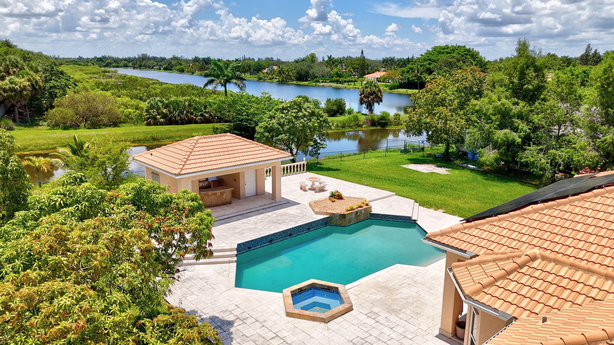 Welcome to this stunning Southwest Ranches home! Featuring 4 bedrooms and 3 baths, this residence boasts an expansive floor plan with lakefront access and views, solar panels, and a 3-car garage. The kitchen is equipped with granite countertops, and the entire property is tiled throughout.The spacious backyard, complete with a pool, creates a perfect oasis. The outdoor area includes a cabana with running water, its own bathroom, an outdoor shower, and a barbecue, ideal for entertaining friends and family. This home is situated on over an acre of land, providing ample space and privacy.