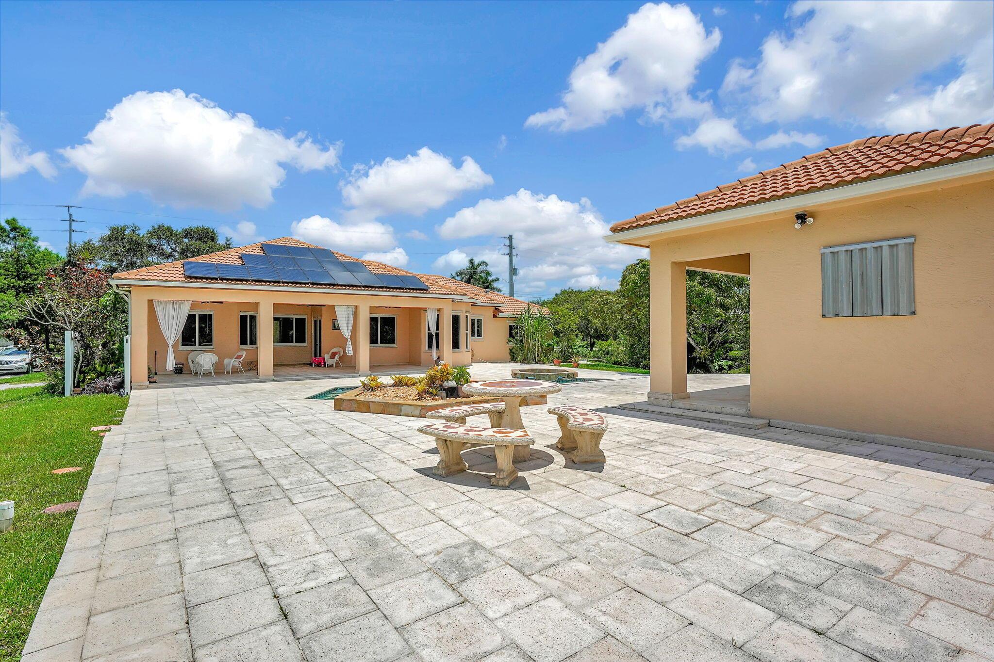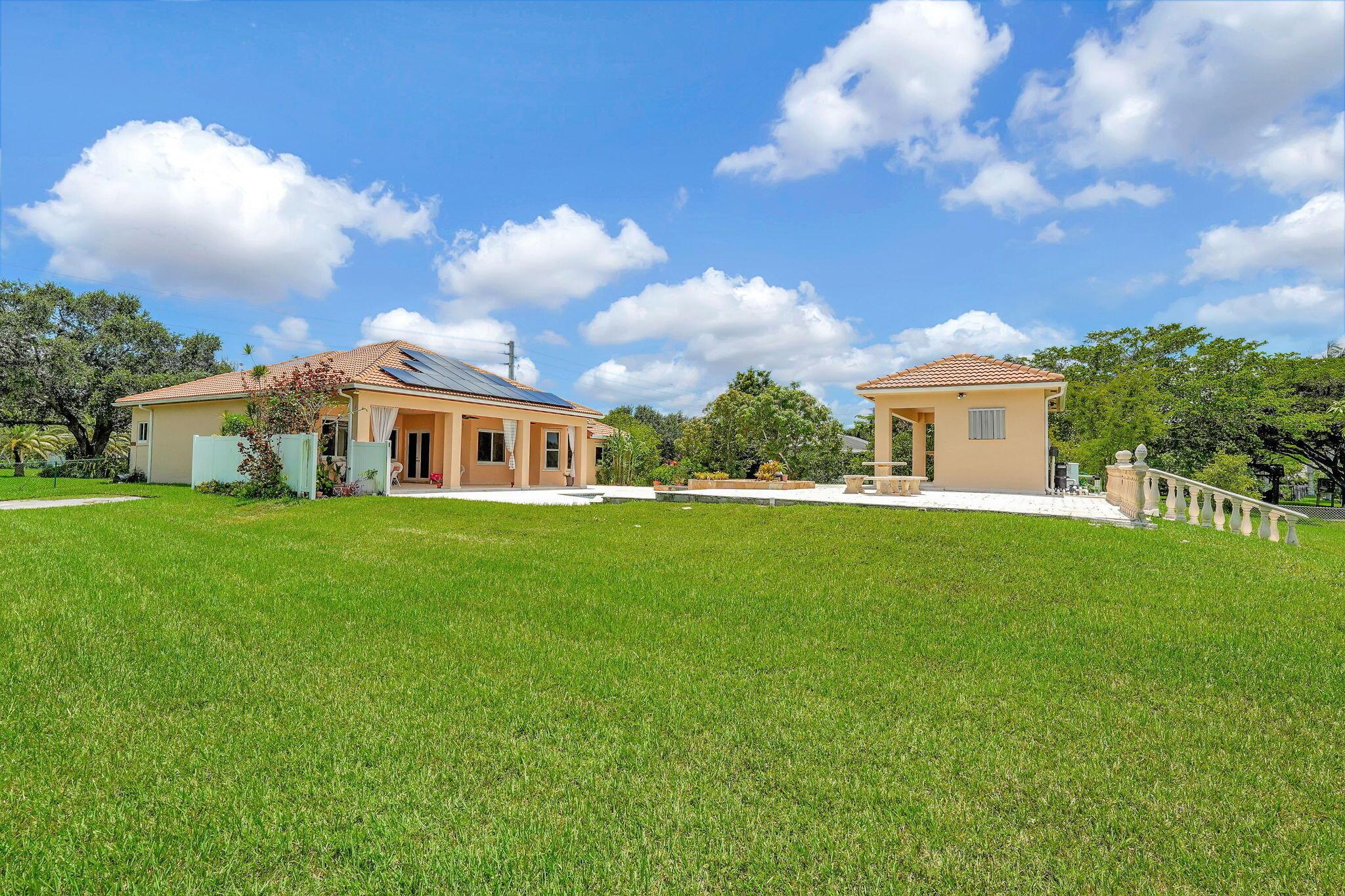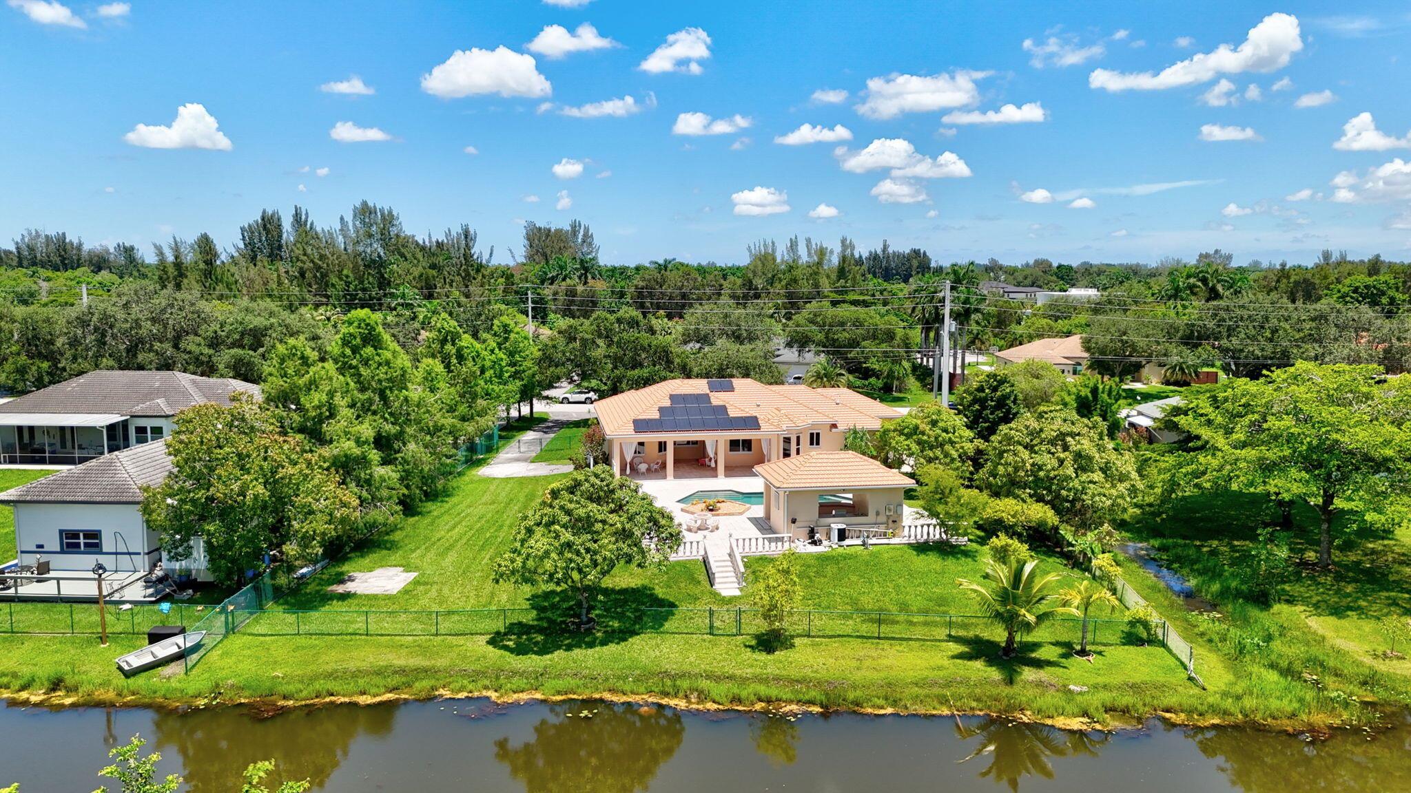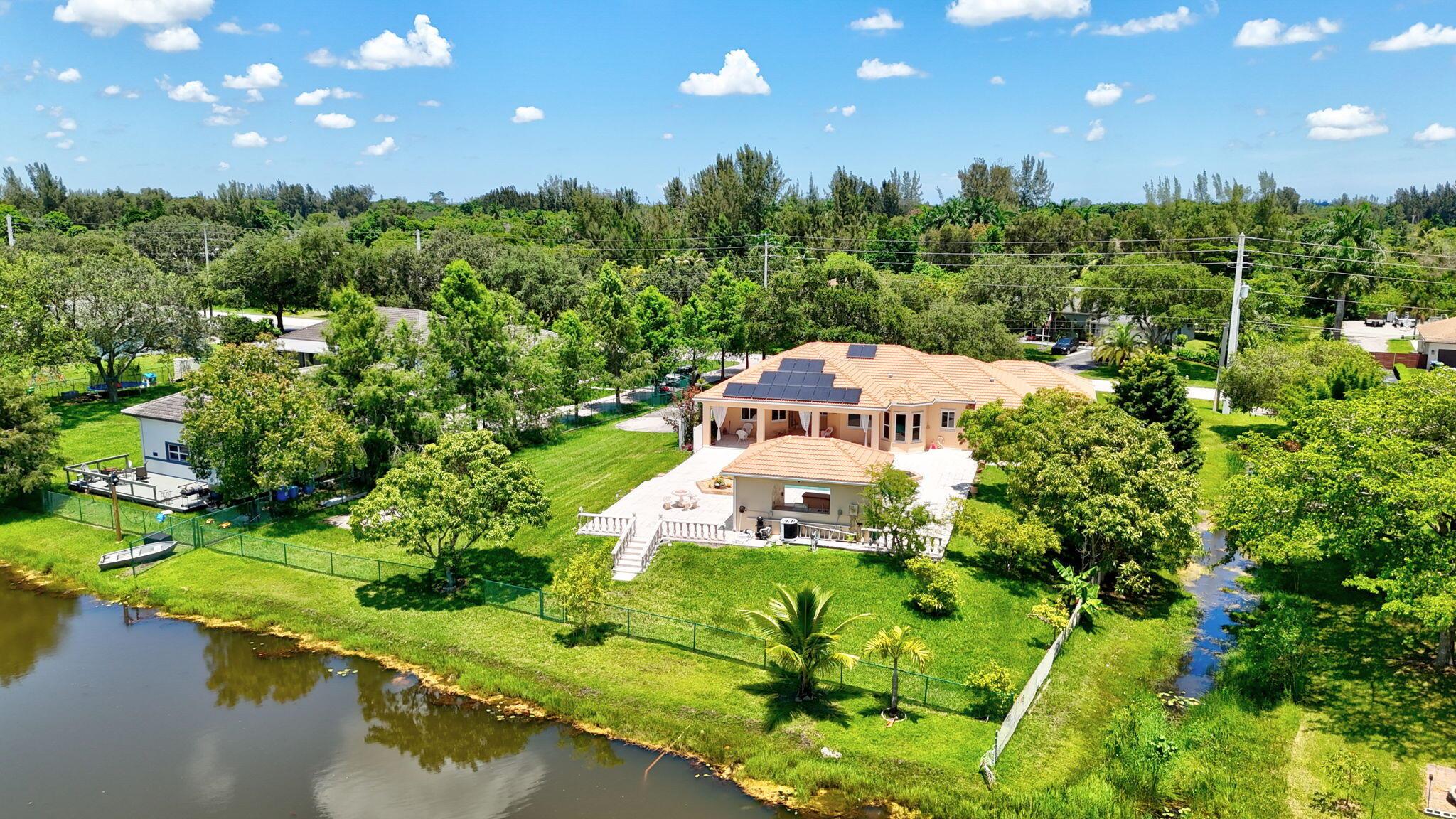 Welcome to this stunning Southwest Ranches home! Featuring 4 bedrooms and 3 baths, this residence boasts an expansive floor plan with lakefront access and views, solar panels, and a 3-car garage. The kitchen is equipped with granite countertops, and the entire property is tiled throughout.The spacious backyard, complete with a pool, creates a perfect oasis. The outdoor area includes a cabana with running water, its own bathroom, an outdoor shower, and a barbecue, ideal for entertaining friends and family. This home is situated on over an acre of land, providing ample space and privacy.