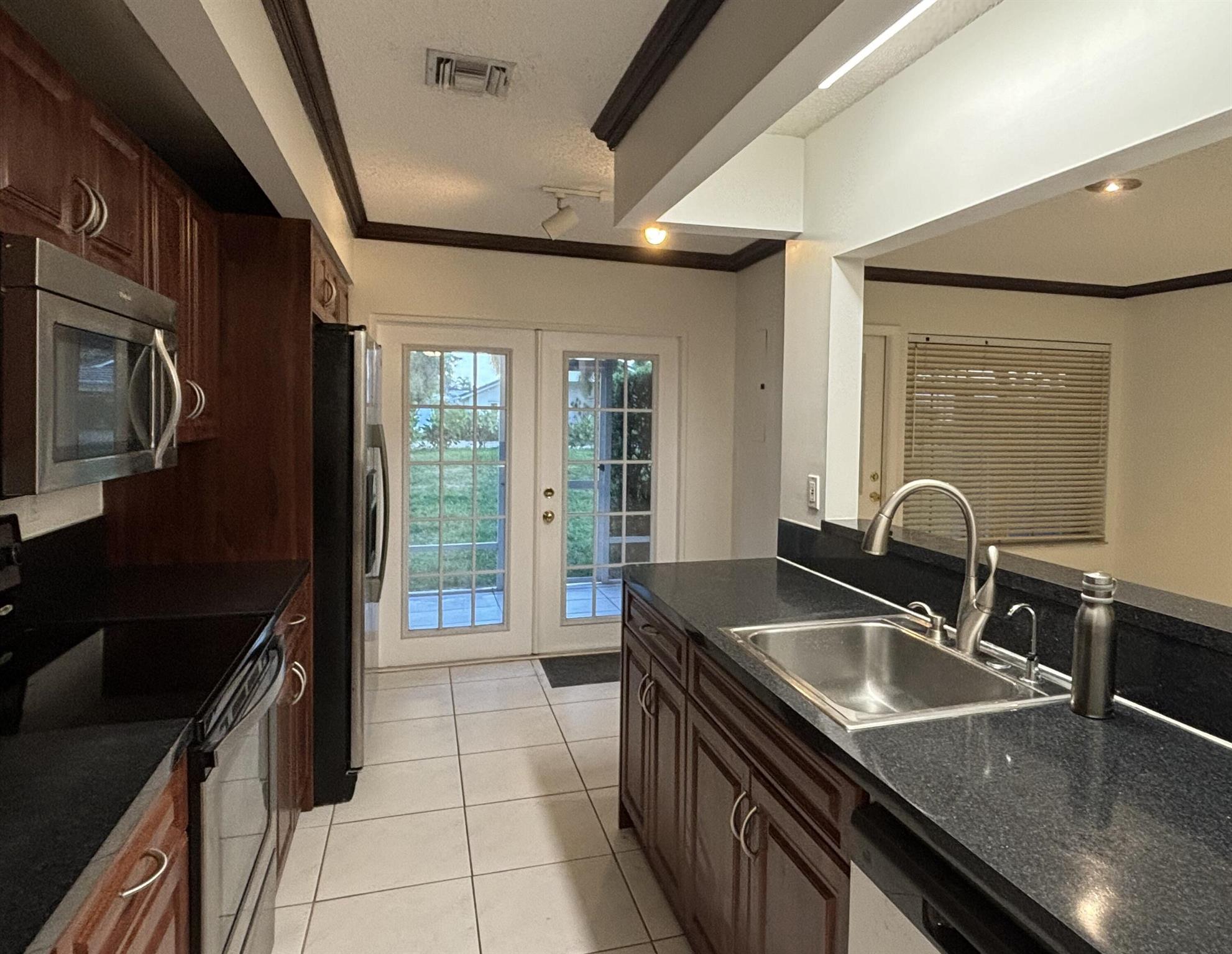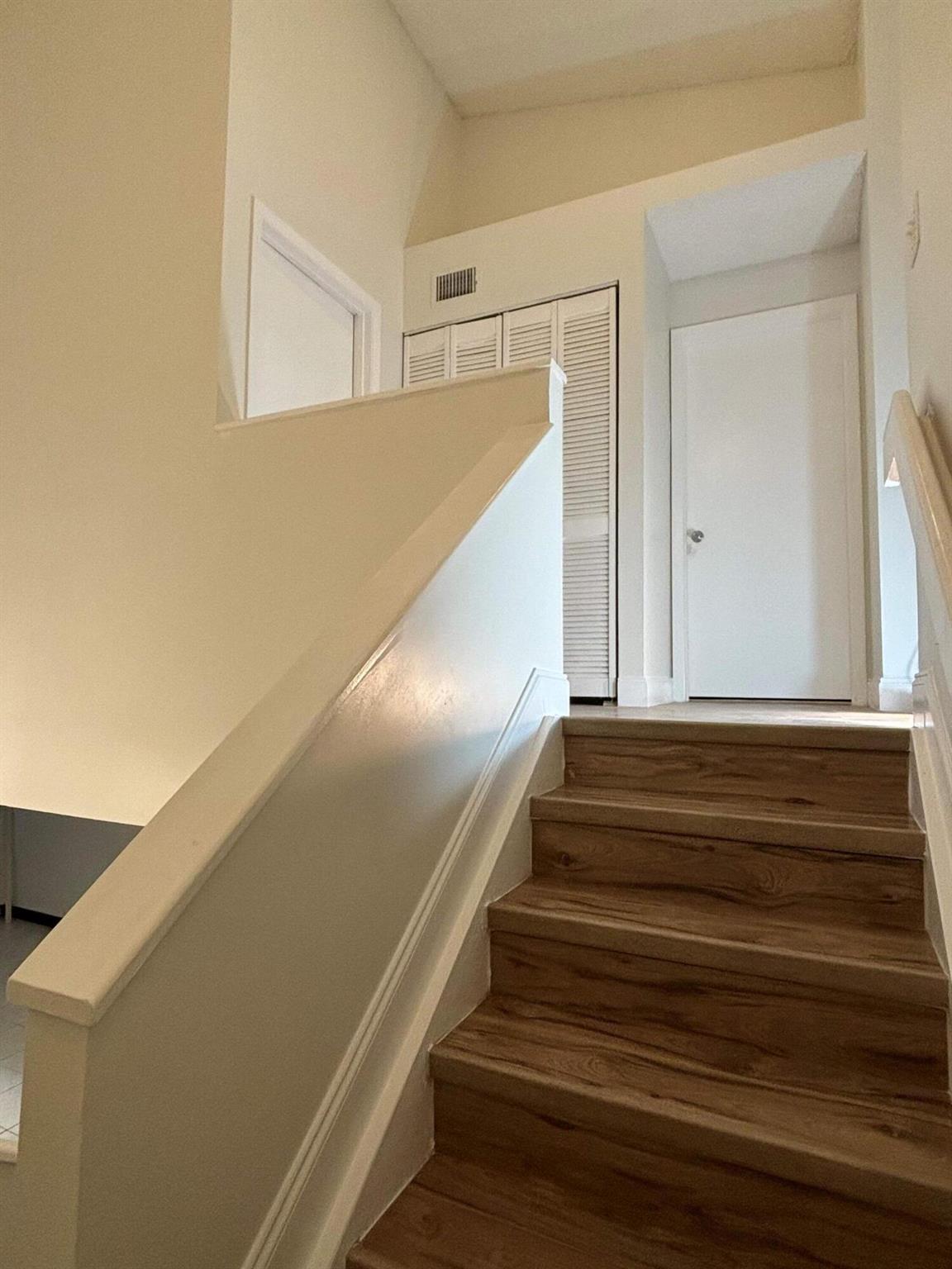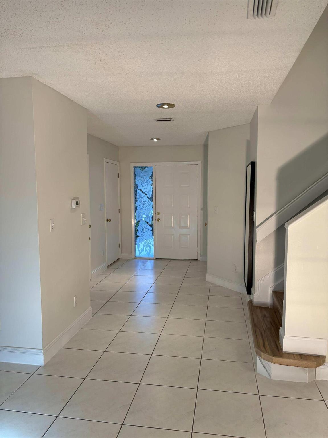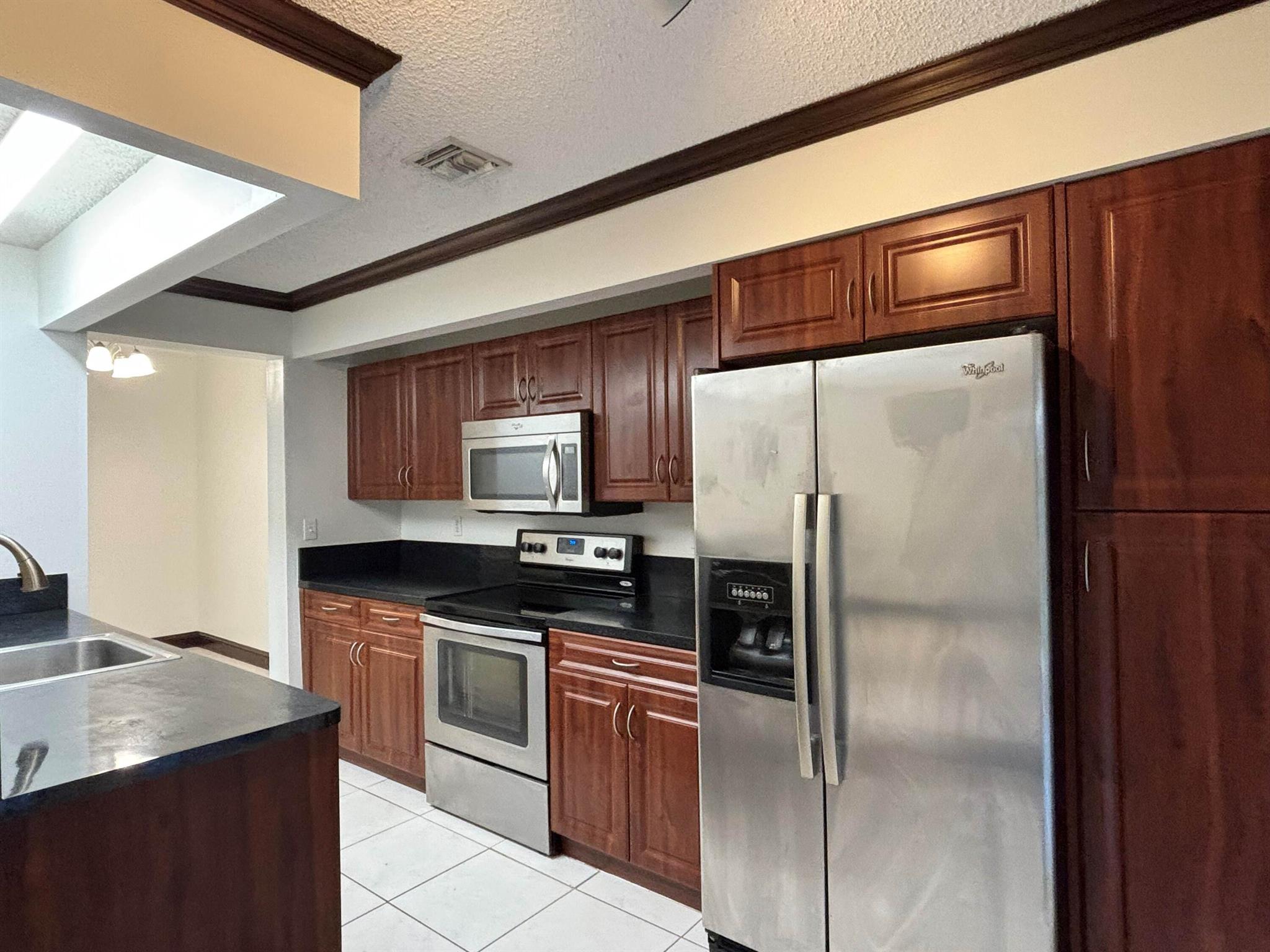 Back to the market. Three bedrooms, two and a half bathrooms, bright and luxurious townhome with a one-car garage. Twenty-four-hour manned gate. Newly painted. Great open floor plan, vaulted ceilings with skylights. First floor tiles and second floor new wood. Spacious large master suite with vaulted ceiling and seating area for a computer desk. New split shower, double sink vanities, large walk-in closet. Remodeled bathrooms. Split bedrooms. Modern kitchen and stainless-steel appliances with French doors. Laundry room with full-size washer and dryer. Paved screen patio with a large backyard. Great room with dining area. Community pool, tennis courts, and children's playground. Walk to Town Center and Boca Center Malls. All A+ schools. Minutes to I-95 & Florida Turnpike, and to beach.
