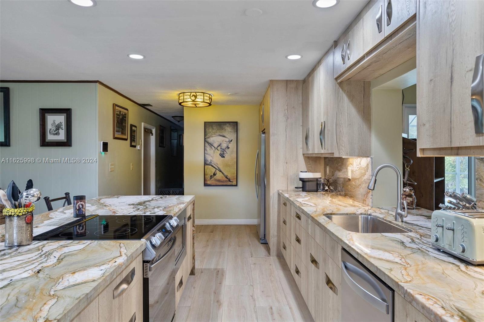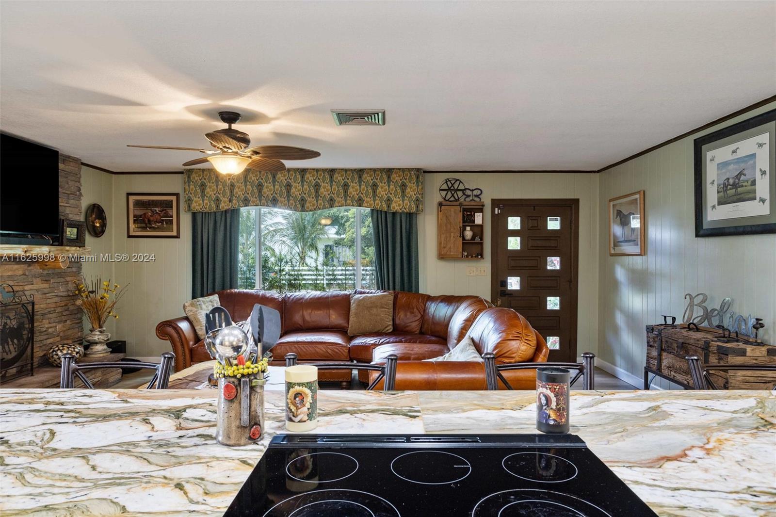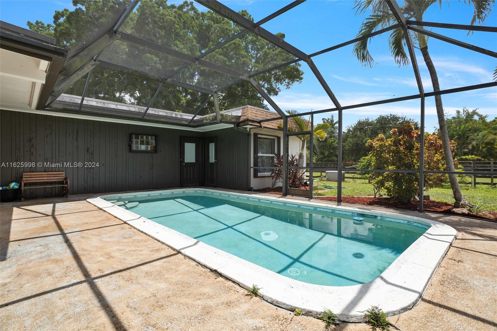 2.51 acre lot in desirable Southwest Ranches! This 3 bedroom 3 bath home boasts an newly updated island kitchen with ample storage & an office. Impact windows & accordion shutters throughout provide natural light & security. A stunning electric fireplace greets you in the living room. The primary bedroom is oversized & the French doors open to the pool. Secondary bedrooms are large with ample storage. Includes a 4 stall barn with a tack room, built to withstand up to a Cat 3 Hurricane. Also a 1 stall barn with a feed room & paddock. 3 more paddocks give you lots of room to ride & turn out your horses. This high & dry lot is located near "A" rated schools, shops & restaurants. Whole house generator and new roof in 2022. Wake up to your horse in your back yard! Paradise awaits!