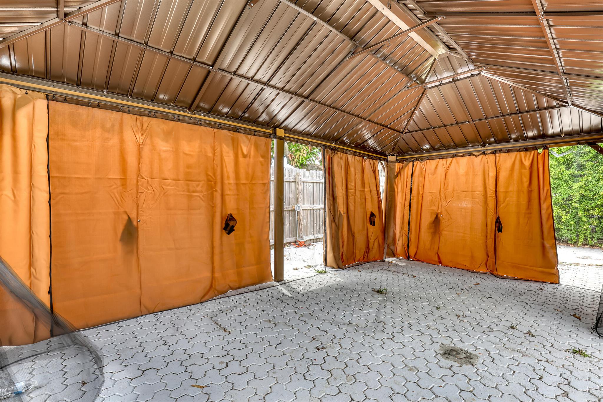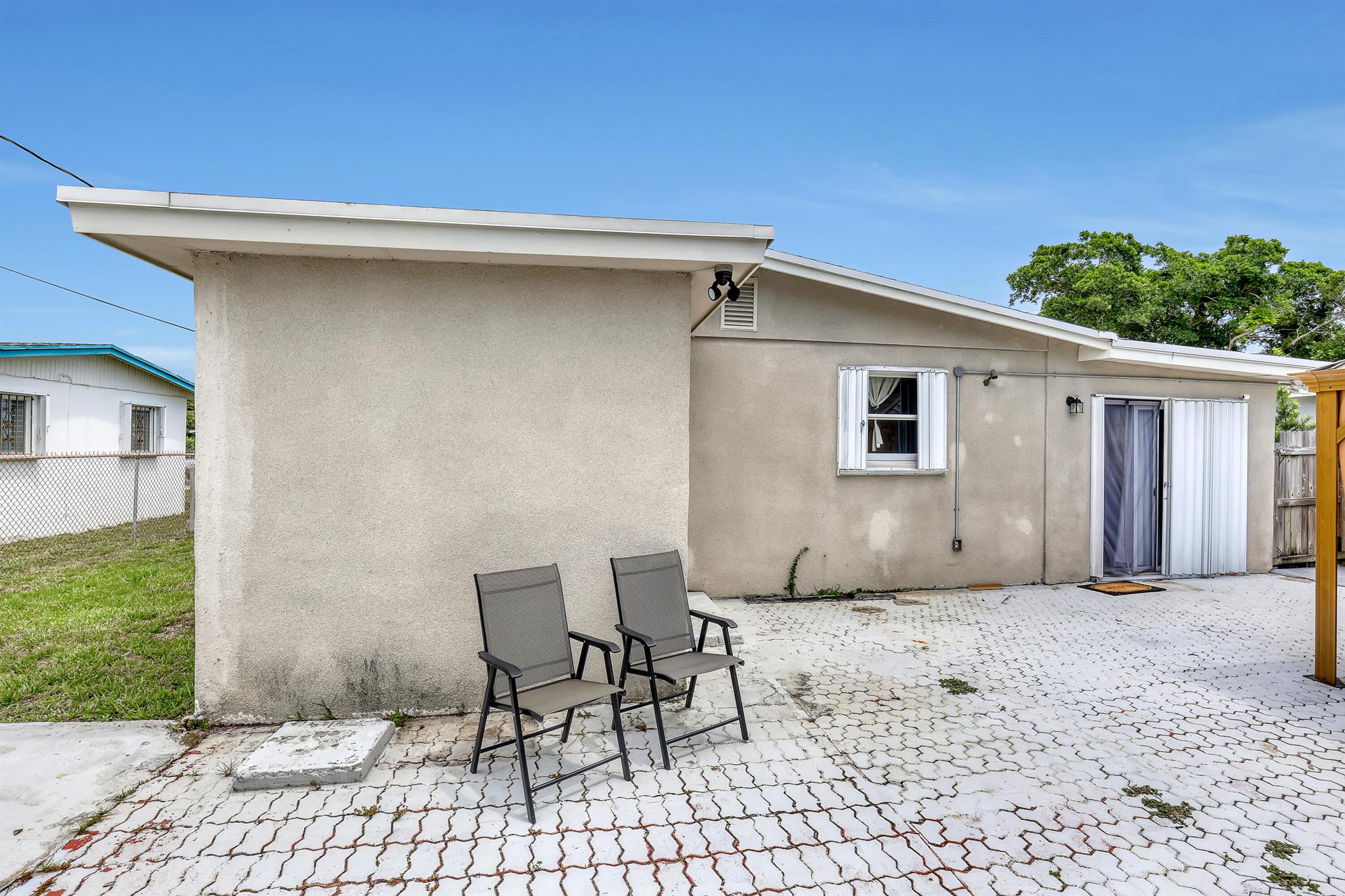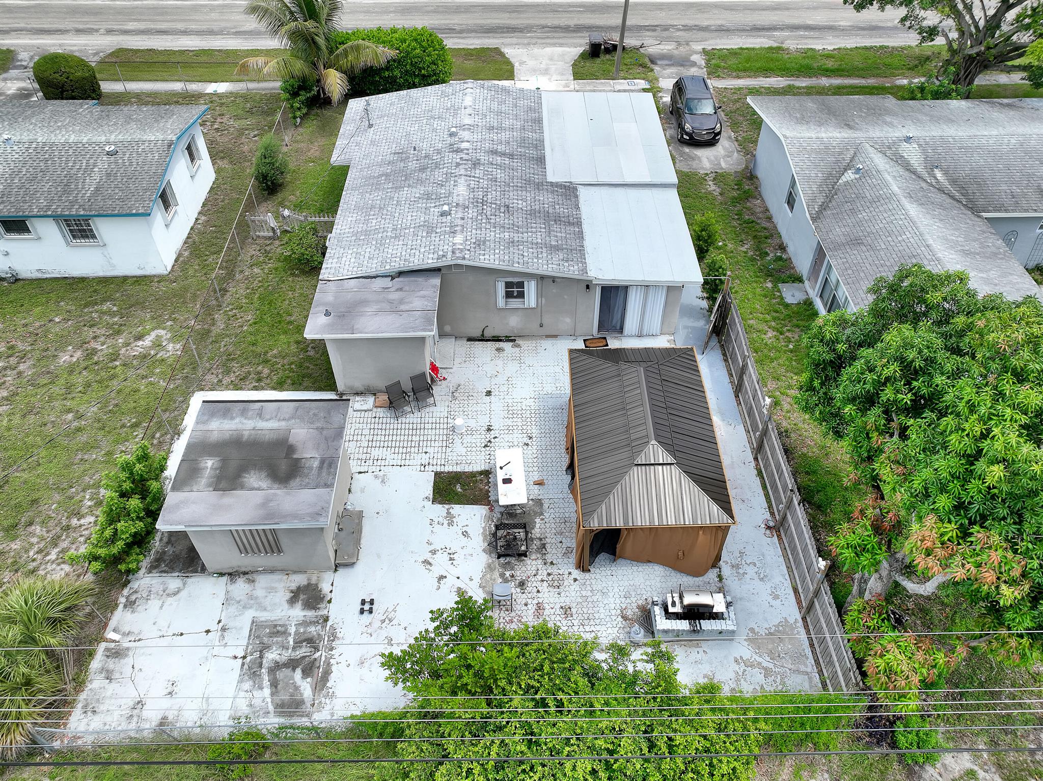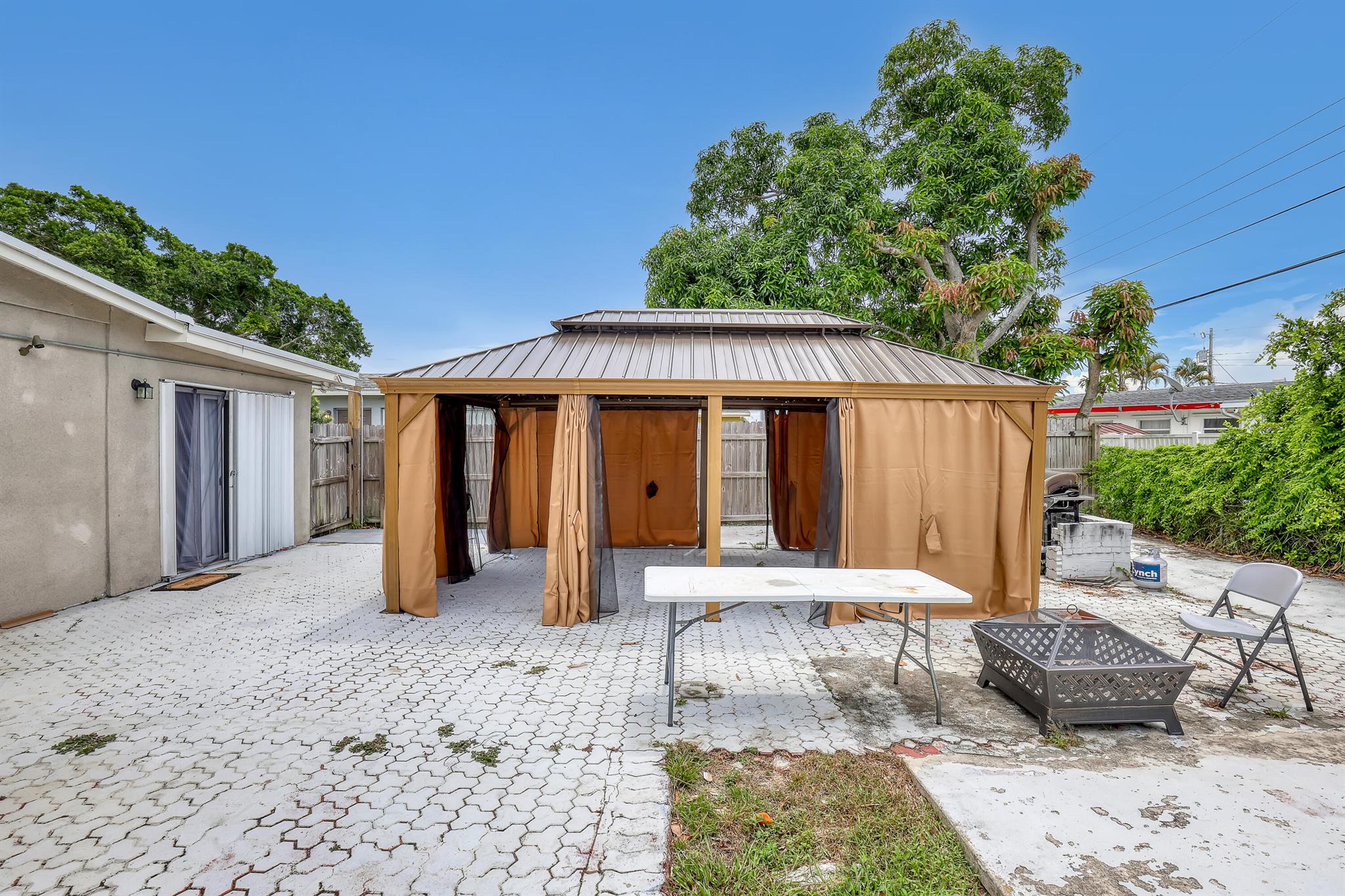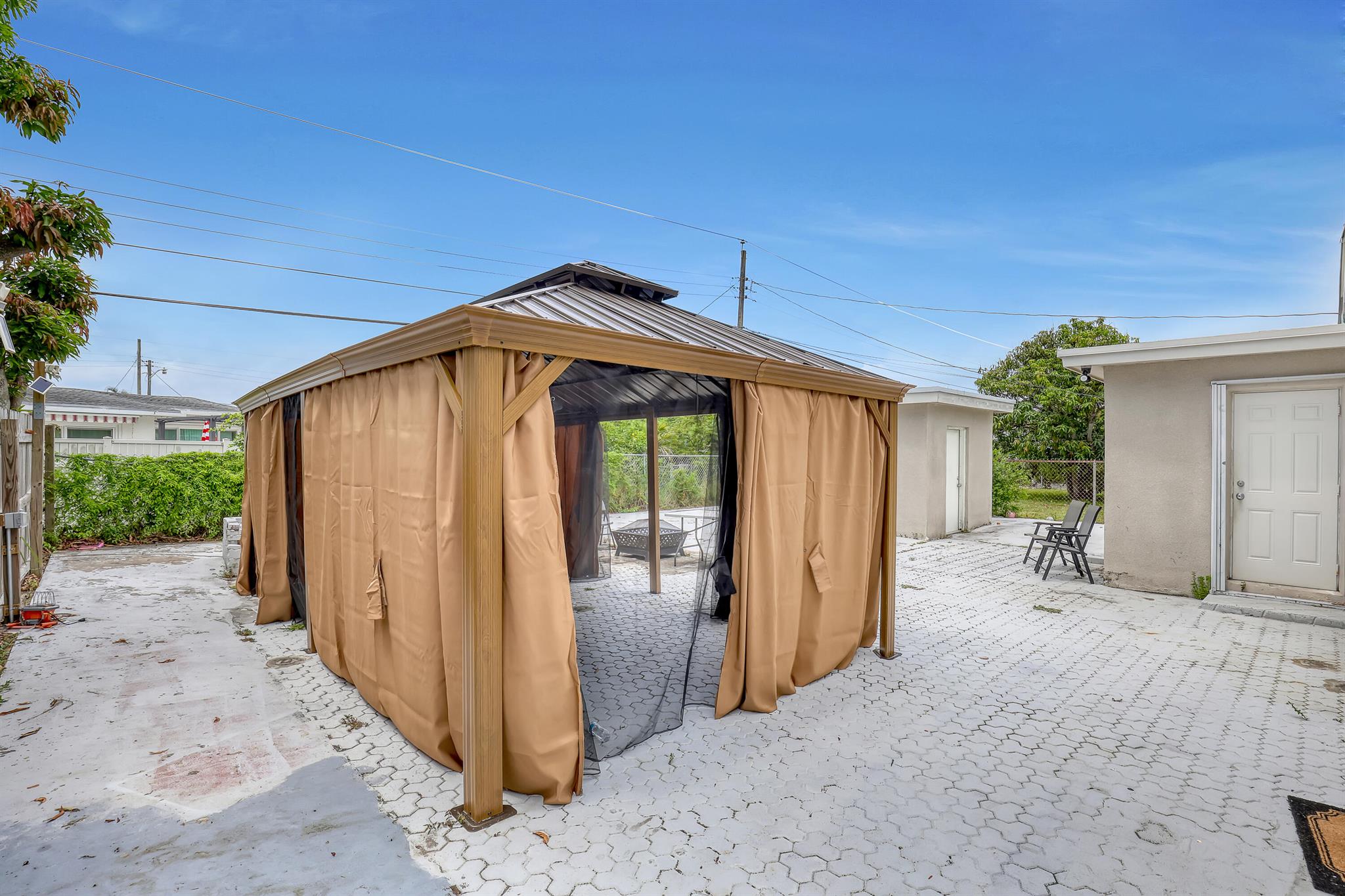 Enjoy this spacious home just a short drive from the outlet mall and downtown West Palm Beach!Spacious Master bedroom with exit door to backyard from master bath. Open kitchen and living room area with granite countertops, accordion shutters throughout. AC recently serviced and roof completely resealed in 2023 for additional life span.Brand new large metal roof gazebo in backyard conveys. Detached laundry room with plenty of storage space. Move in ready!