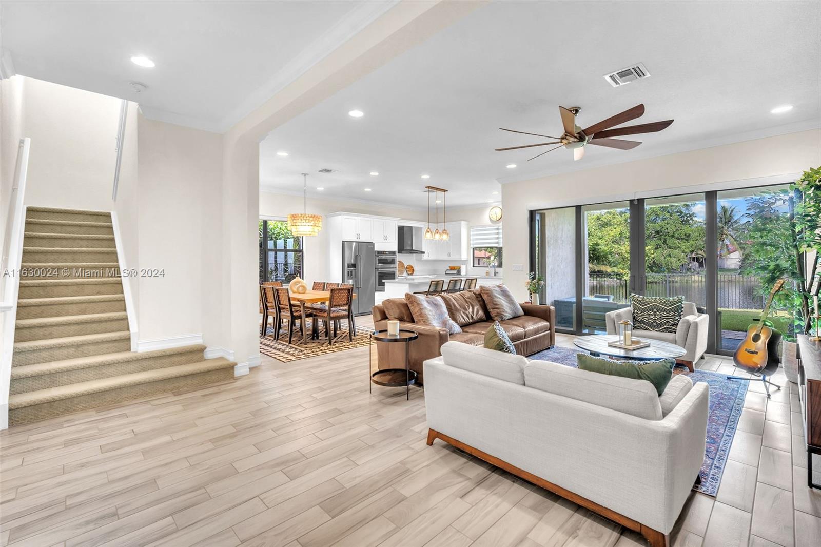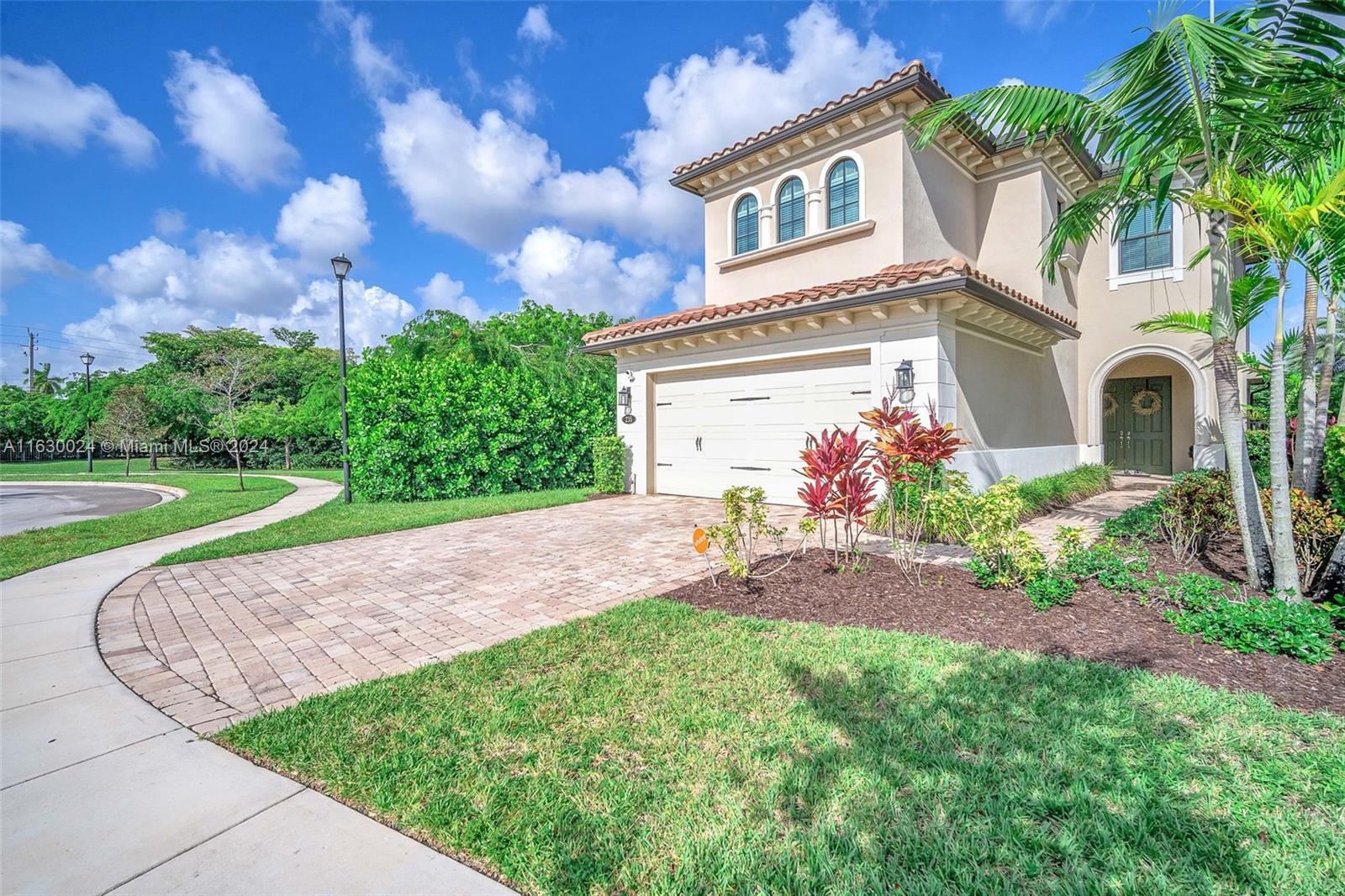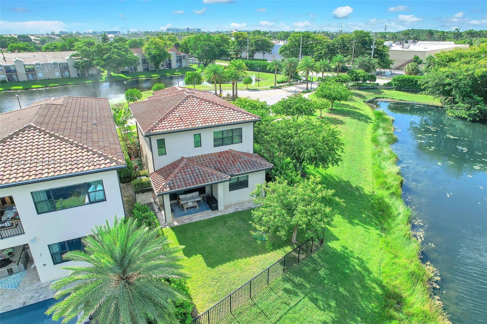 Exquisite modern 4 bed/3 bath home on end lot w/impact glass throughout. Enter through lush green walk & step through front door to open concept living space with clear view to lawn & lake out back. Look left to stunning kitchen with upgraded Kitchen Aid apps, speckled white quartz counters w/counter top stove & in wall ovens + sleek center isle with cabinets. Ground floor has light wood tiles throughout & elegant ceiling fans & light fixtures + white zebra blinds. Convenient bedroom & full bath on 1st floor; extra storage space. Upstairs carpeted. Spacious mezzanine +3 bedrooms & laundry with tub & linen closet. Master has glass enclosed shower, soak tub & lovely finishes. All bedrooms have ceiling fans. This wonderful home is close to shopping, I75 Gated Community, has heated pool & gym.