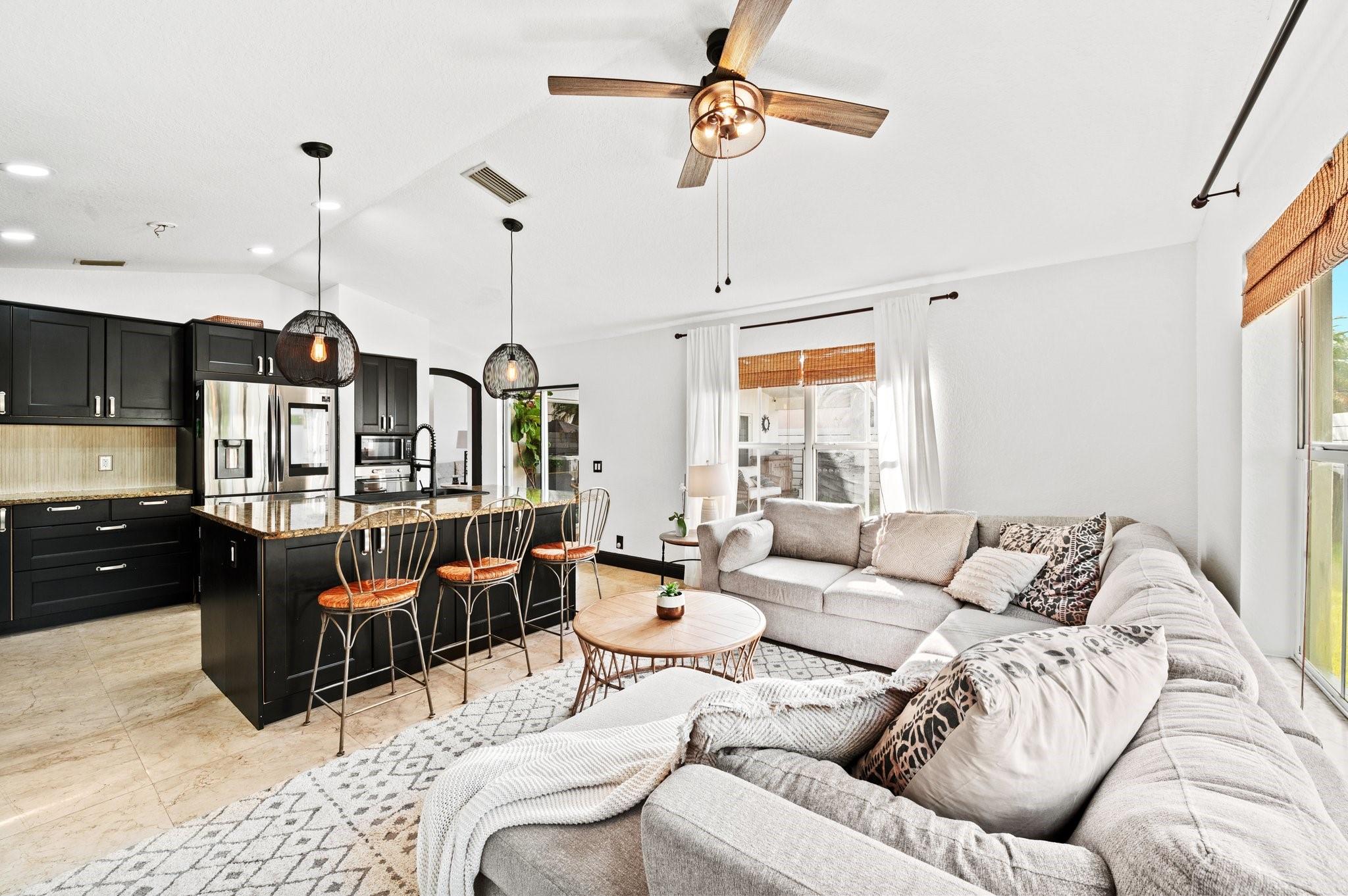 Gorgeous and highly upgraded. This one story split floor plan home boasts gorgeous new beautiful impact glass front doors, an updated open concept kitchen w/ wood cabinet, granite countertop, stainless steel appliances & counter bar that opens to the family rm. Marble floors in living areas, porcelain tile & wood laminate in bdrms. Formal dining rm & spacious light & bright liv. areas w/glass doors to private backyard w/privacy fence, covered patio w/ jacuzzi spa. Beautiful remodeled baths, primary suite w/ soaking tub, large spa style shower & dual vanities. Wardrobe style closets, high ceilings w/ lots of light, front loading washer & dryer & laundry sink. Laundry rm currently a private office. Covered patio w/ tile floor. Freshly painted exterior. Community amenities & A-schools!