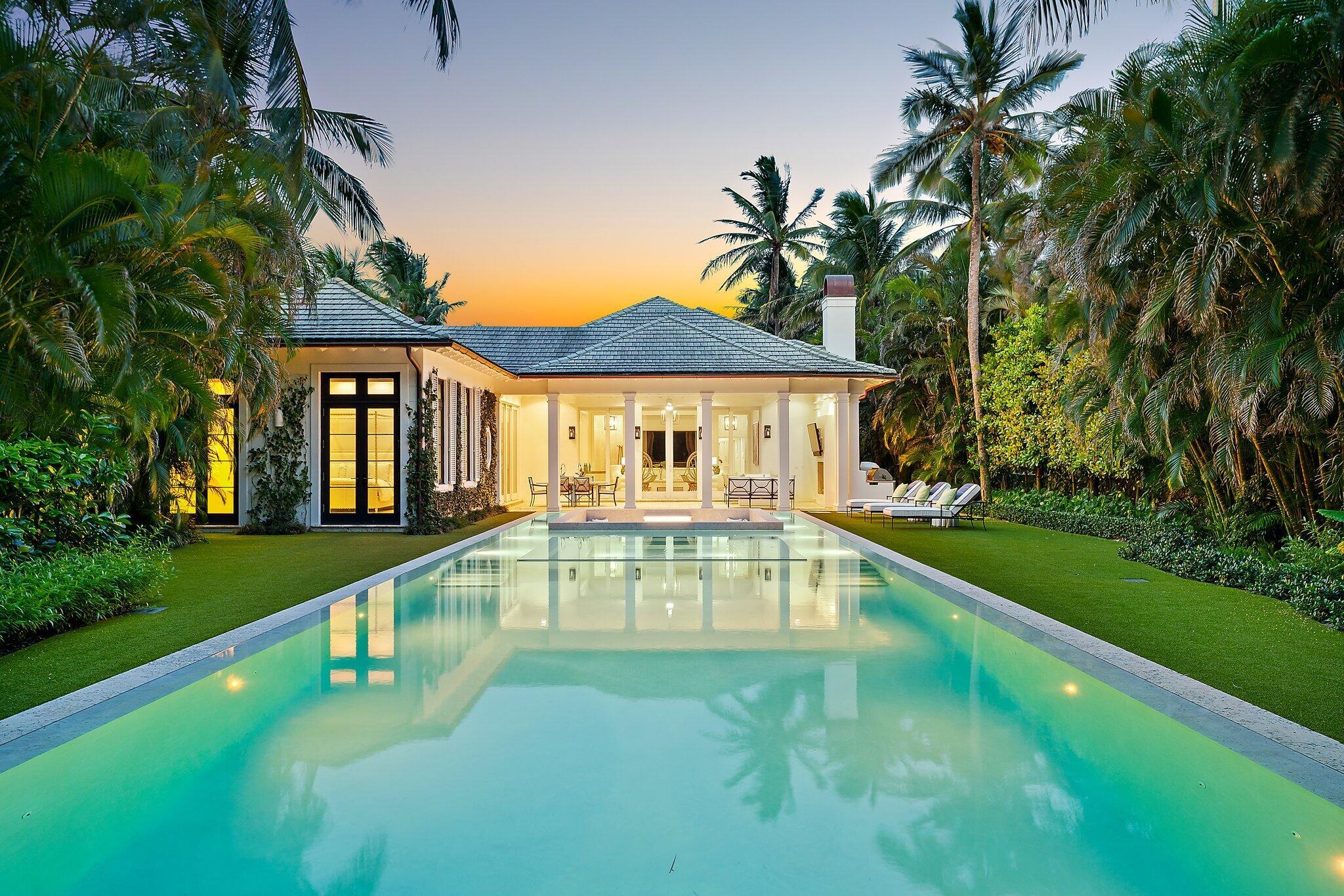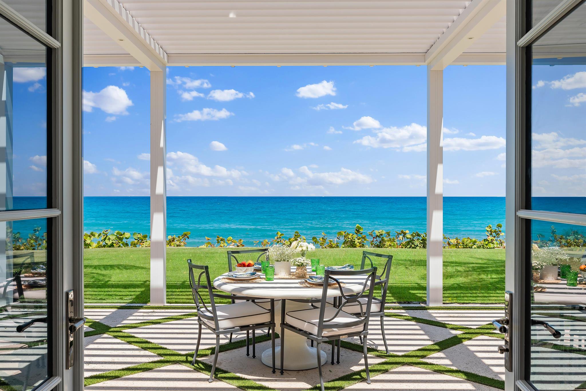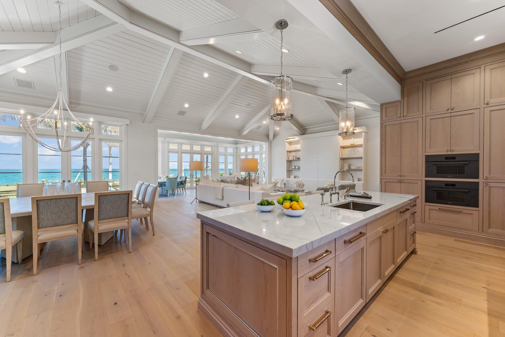This oceanfront home in Lost Tree Village, just meticulously reimagined with no expense spared, offers unparalleled luxury. Ideal for multigenerations, the lushly landscaped property provides a secluded retreat with five bedrooms, each with an en suite bathroom, and a total of six and a half baths. The brand-new kitchen features a butler's pantry, dual dishwashers, a 36-inch Miele refrigerator, 36-inch Miele freezer, and a 60-inch Bluestar 6-burner range, to note. Ocean views from the expansive vaulted-ceiling living areas are breathtaking, as are the details in the custom cabinetry and beautiful oak floors throughout. The elegant Billiards Bar boasts custom lacquered cabinets and stunning brass shelving. Outside, a 75-foot pool with a sunken fire pit and hot tub is set amidst a spacious